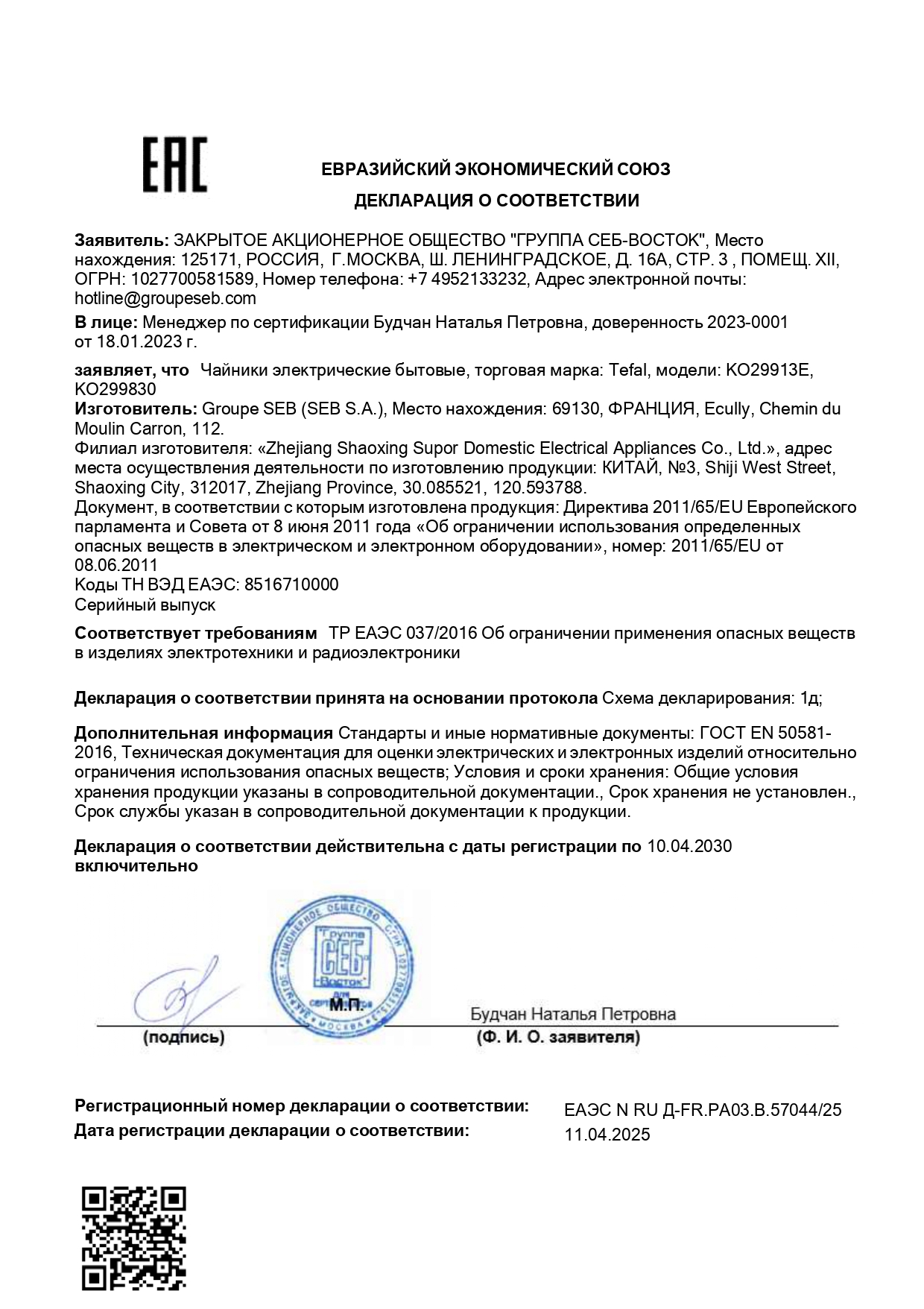 Чайник TEFAL KO29913E, 1,5 л, 2200 Вт, закрытый нагревательный элемент, пластик, белый Код товара: 456514 4 656,69 ₽ Купить Производитель:TEFAL Снежно-белый чайник TEFAL Express KO29913E предлагает больше возможностей и удобство ежедневного использования. Благодаря двойному индикатору теперь стало проще отмерять необходимое количество воды. Маленький индикатор уровня воды подсказывает, сколько воды налить для одной или двух стандартных чашек – удобное решение, когда нет необходимости кипятить чайник целиком. Меньше объем – меньше время кипячения. Большой индикатор отвечает за основной объем чайника в 1,5 л, которого хватит даже на большую компанию. При необходимости чайник легко наполняется водой заново и быстро кипятит весь объем благодаря высокой мощности. Специальное скрытое расположение нагревательного элемента обеспечивает быстрое кипячение воды и легкую чистку чайника, поэтому очистка не доставит хлопот. Легко промывается и съёмный фильтр от накипи, который располагается в носике. При закипании, включении без воды и преждевременном снятии с основания чайник автоматически отключается. Круглое основание с поворотом на 360° – снимайте и ставьте чайник с любой стороны. Крышка широко открывается нажатием кнопки – для наполнения водой и легкой очистки. Производитель оставляет за собой право без предварительного уведомления вносить изменения в технические характеристики, комплектацию и конструкцию, не ухудшающие эксплуатационные характеристики изделия.Производство: КитайОбъем: 1.5 лМощность: 2200 ВтМатериал корпуса: пластикВид нагревательного элемента: закрытыйАвтоотключение при закипании: даСерия: KO29913EОтключение при отсутствии воды: даИндикатор включения: даИндикация уровня воды: даВращение на 360°: даФильтр от накипи: даДлина шнура: 0.8 мЦвет корпуса: белыйШирина: 200 ммВысота: 240 ммГлубина: 180 ммВес (без упаковки): 0.86 кгВес: 1,13 кгРазмер упаковки: 18 × 24.5 × 20.6 смОбъём: 0.0091 м3Промежуточная упаковка: 1 штТранспортная упаковка: 1 штШтрих-код: 3016661136429 Файлы Приложение-1.pdf Сертификат-1.jpg Сертификат-2.jpg Сертификат-3.jpg Сертификат-4.jpg Сертификат-5.jpg Сертификат-6.jpg