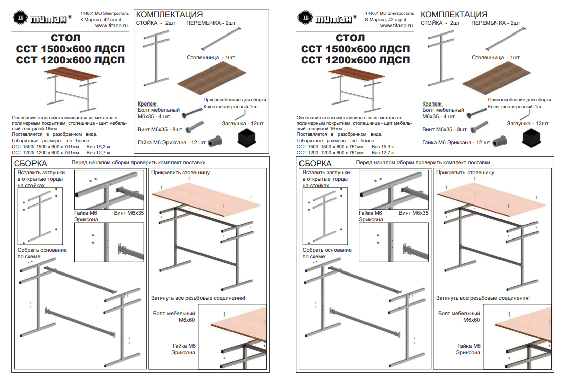 Стол для столовых на 4 места "ССТ 1200", 1200х600х760 мм, рост 6, каркас металл, ЛДСП, цвет бук Код товара: 533274 4 527 ₽ Купить Производитель:ТИТАН Стол для столовых "ССТ 1200" удобен, практичен, неприхотлив в обслуживании, идеально подходит для школ и других заведений. На каркасе предусмотрены кронштейны для компактного размещения скамьи под крышкой стола. Столешница ЛДСП. Каркас профиля – 25х25 мм, покрытие – порошковое полимерное. Цвет каркаса – алюминиевый металлик RAL9006. Столешница – ЛДСП толщиной 16 мм, цвет – бук. Поставляется в разобранном виде, в картонной таре. Комплектуется скамьей 533276.Производство: РоссияТип товара: столЦвет столешницы: букТип столешницы: ЛДСПЦвет каркаса: серыйРазмер столешницы (ШхГ): 1200х600 ммТолщина столешницы: 16 ммВысота стола: 760 ммСоответствует требованиям ГОСТа: ГОСТ 16371-2014Вес: 14,08 кгРазмер упаковки: 8 × 122.5 × 61.5 смОбъём: 0.0603 м3Промежуточная упаковка: 1 штТранспортная упаковка: 1 штШтрих-код: 4670026244427 Файлы Приложение-1.png Сертификат-1.jpg Сертификат-2.jpg Сертификат-3.jpg