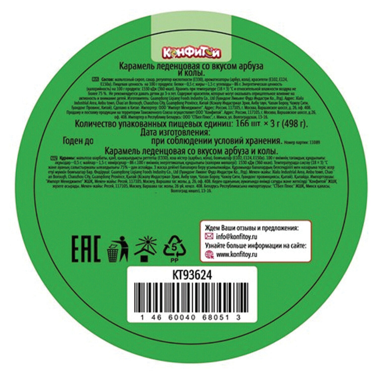 Карамель ВЗРЫВ МОЗГА ассорти 2 вкуса (кола, арбуз), 3 г, КОНФИТОЙ Код товара: 624397 6,7 ₽ Купить Производитель:ВЗРЫВ МОЗГА Популярные вкусы карамели с кислым слоем ВЗРЫВ МОЗГА теперь в новом формате упаковки – пластиковой банке! Покупатель сможет приобретать любимую карамель поштучно – каждая конфетка имеет штрих-код. Банку удобно размещать в прикассовой зоне. Состав колы: мальтозный сироп, сахар, регулятор кислотности (лимонная кислота), ароматизатор (кола), краситель (E150а). Состав арбуза: мальтозный сироп, сахар, регулятор кислотности (лимонная кислота), ароматизатор (арбуз), красители (E102, E124). Хранить в сухом и прохладном месте при температуре от 15 до 21 °С и относительной влажности не более 75%. Избегать попадания прямых солнечных лучей. Пищевая ценность продукта на 100 г: белки – 0,4 г, жиры – 0 г, углеводы – 68 г. Энергетическая ценность в 100 г – 280 ккал.Производство: КитайТип товара: карамельВес нетто: 3 гВкус: кола, арбузФормат: карамель с кислым слоемУпаковка: флоу-пакСоответствует требованиям ГОСТа: ТР ТС 021/2011, ТР ТС 022/2011, ТР ТС 029/2012Срок годности: 36 мес.Фирма-производитель: КОНФИТОЙСрок годности: 36 месВес: 4 грРазмер упаковки: 1 × 3 × 2.5 смПромежуточная упаковка: 166 штТранспортная упаковка: 1992 штШтрих-код: 4660040680516 Сертификат-1.jpg Сертификат-2.jpg Сертификат-3.jpg