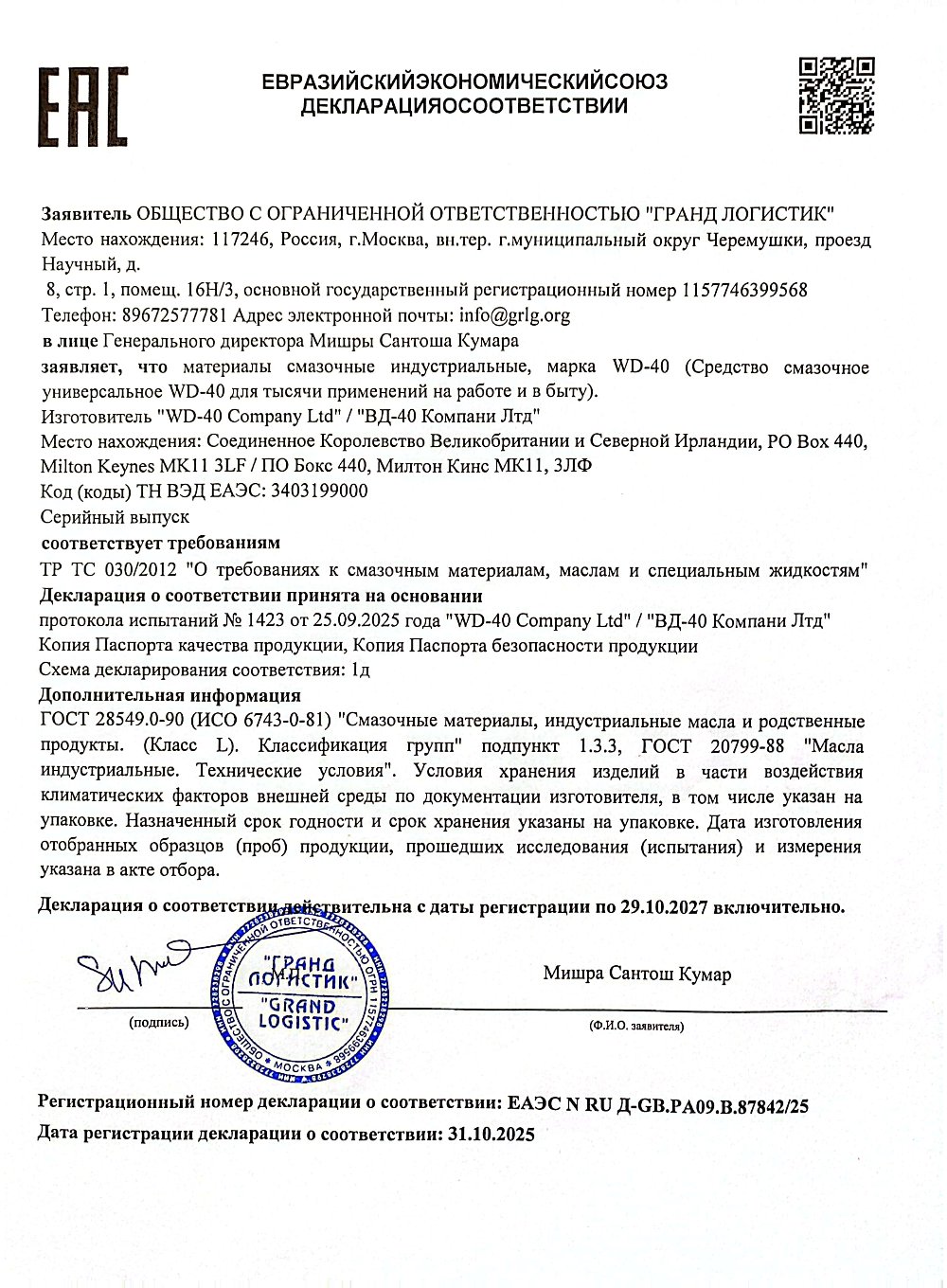 Средство WD-40 универсальное, 100 мл, для тысячи применений в офисе, быту, производстве Код товара: 602756 556,12 ₽ Купить Производитель:WD-40 Функции средства WD-40 универсального: вытесняет влагу и образует защитный барьер, предохраняет металлические поверхности от коррозии, смазывает механизмы, не оставляя жирных и липких следов, освобождает заржавевшие и заклинившие механизмы. Состав: 1-5% диоксид углерода, 60-80% углеводороды, С 9-С11, n-алканы, изо -алканы, цикло -алканы, < 2% ароматные соединения.Производство: Соединенное КоролевствоТип: смазка универсальнаяСерия: WD-40Объем: 100 млЭффект: вытесняет влагу, защищает от коррозии, смазывает механизмыФорма выпуска: аэрозольСрок годности: 120 месВес: 134 грРазмер упаковки: 4.5 × 12.6 × 4.5 смОбъём: 0.0003 м3Промежуточная упаковка: 24 штТранспортная упаковка: 24 штШтрих-код: 5032227700017 Файлы Приложение-1.pdf Приложение-2.pdf Сертификат-1.jpg Сертификат-2.jpg Сертификат-3.jpg