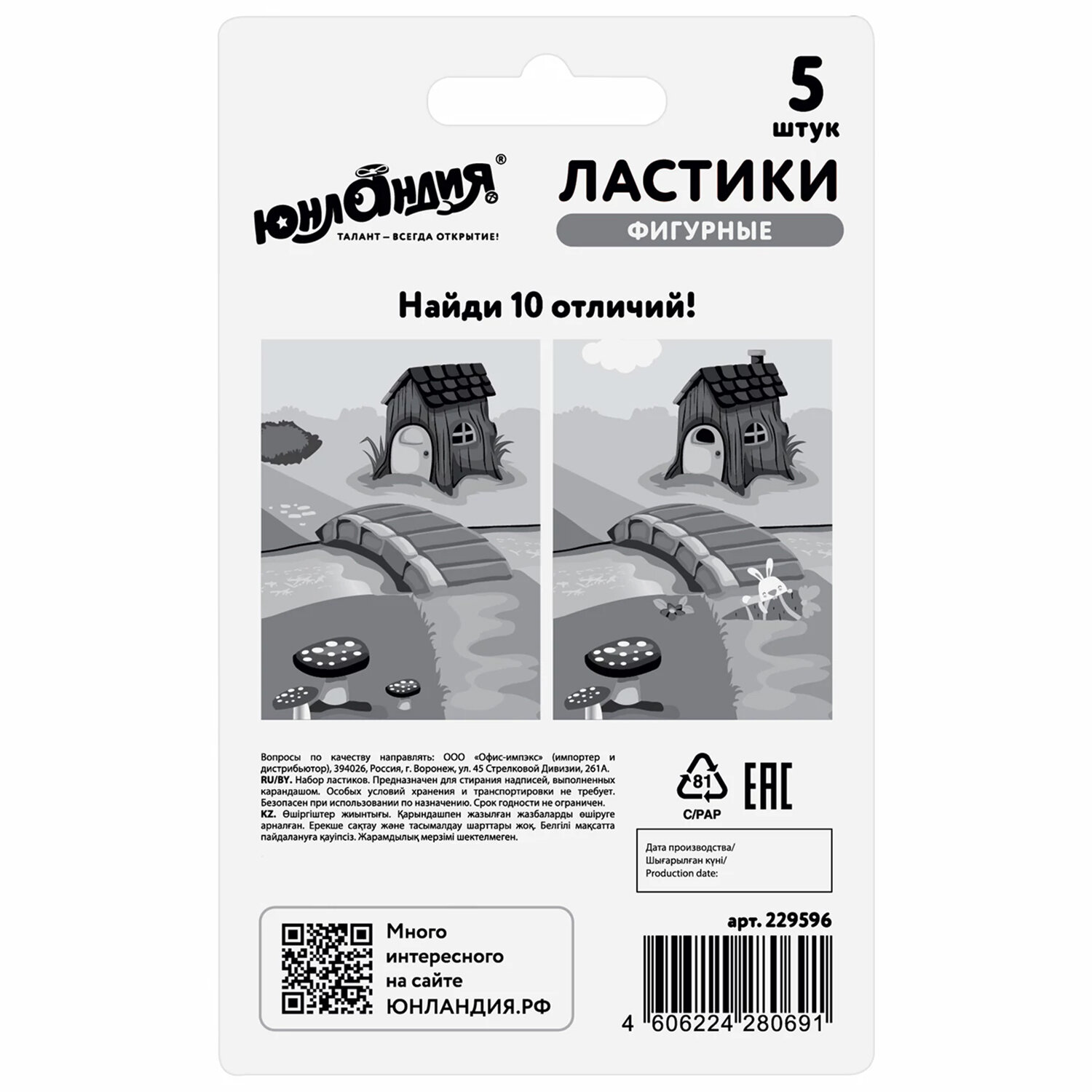 Набор ластиков фигурных ЮНЛАНДИЯ "Зайчик и урожай", 5 шт., ассорти Код товара: 229596 184,38 ₽ Купить Производитель:ЮНЛАНДИЯ Фигурные ластики ЮНЛАНДИЯ выполнены в форме зайчика и овощей, что позволяет превратить процесс стирания в игру. Подходят для удаления надписей, сделанных чернографитными карандашами. Набор состоит из пяти ластиков в форме зайчика и моркови. Ластики обеспечат лёгкое и чистое стирание без повреждения поверхности бумаги и без образования бумажной пыли. Поставляются в блистере с европодвесом.Производство: КитайКоличество в упаковке: 5 шт.Материал: термопластичная резинаФорма: ассортиСтираемые письменные принадлежности: чернографитные карандашиЦвет: Зайчик и урожайСерия: Фигурные ластикиНе оставляет бумажной пыли: даРазмер: 43х16х16 ммИндивидуальная упаковка: даУпаковка: блистерВес: 64 грРазмер упаковки: 2.1 × 14.7 × 8.6 смОбъём: 0.0003 м3Промежуточная упаковка: 12 штТранспортная упаковка: 288 штШтрих-код: 4606224280691 Сертификат-1.jpg Сертификат-2.jpg Сертификат-3.jpg