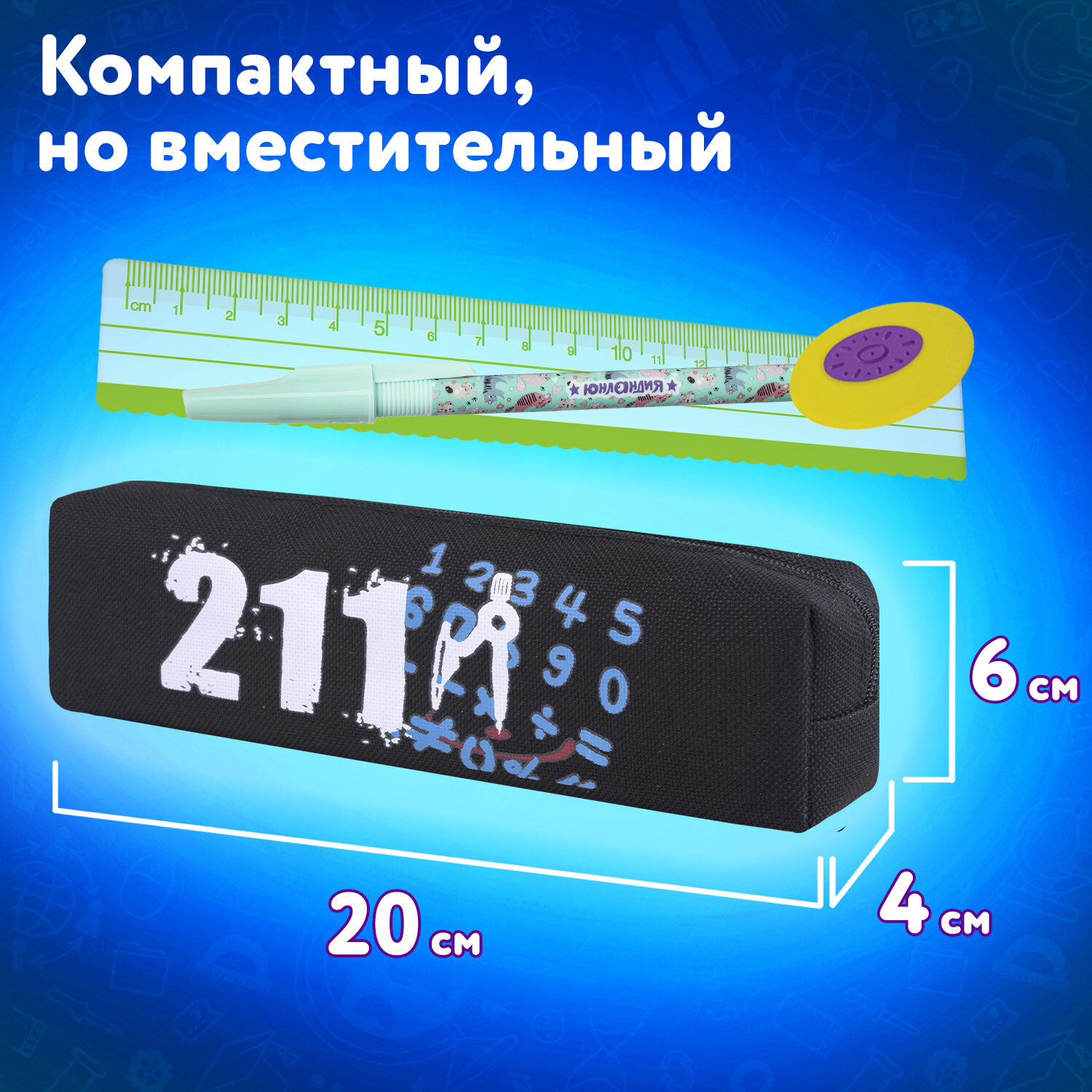 Пенал ЮНЛАНДИЯ ЮНИОР, 1 отделение, полиэстер, "Maths", 20х6х4 см Код товара: 273808 194,69 ₽ Купить Производитель:ЮНЛАНДИЯ Пенал ЮНЛАНДИЯ ЮНИОР предназначен для хранения школьных канцелярских принадлежностей. Застегивается на молнию с металлическим бегунком. Вмещает до 50 предметов. Выполнен из прочного полиэстера, приятного на ощупь. Внутри пенала одно отделение с застежкой-молнией, оснащенной металлическим бегунком. Пенал выполнен в ярких цветах с печатью уникального дизайна. Компактный размер 20х6х4 см делает пенал удобным для ежедневного использования. Идеально подходит для хранения ручек, карандашей, ластиков и других канцелярских принадлежностей. Упакован в прозрачный полиэтиленовый пакет с европодвесом, который сохранит качество и товарный вид при хранении и транспортировке.Производство: КитайТип товара: пенал мягкийЗастежка: молнияНазначение: для мальчиковКоличество отделений: 1Материал: полиэстерСерия: ЮНИОРДизайн: MathsБазовый цвет: черныйДлина: 20 смШирина: 6 смУпаковка: прозрачный пакет с европодвесомВес: 36 грРазмер упаковки: 5.3 × 21.4 × 6.1 смОбъём: 0.0007 м3Промежуточная упаковка: 12 штТранспортная упаковка: 144 штШтрих-код: 4606224493633 Сертификат-1.jpg Сертификат-2.jpg Сертификат-3.jpg