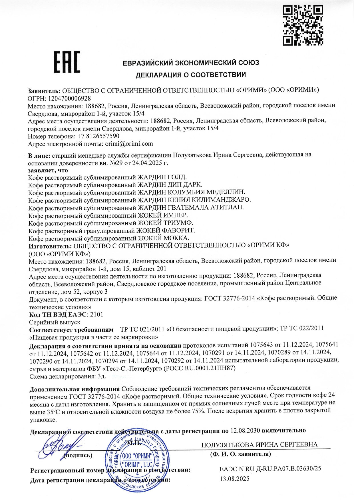 Кофе растворимый ЖОКЕЙ "Триумф" 150 г, сублимированный Код товара: 621134 507,99 ₽ Купить Производитель:ЖОКЕЙ Растворимый сублимированный кофе из отборной арабики отличается мягким, хорошо сбалансированным вкусом и ярким ароматом. Удачная композиция кофейных сортов и безупречная обжарка создают уникальный вкус кофе. Растворимый сублимированный кофе из отборной арабики отличается мягким, хорошо сбалансированным вкусом и ярким ароматом. Удачная композиция кофейных сортов и безупречная обжарка создают уникальный вкус кофе. Состав: Кофе натуральный растворимый сублимированный.Производство: РоссияТип кофе: сублимированныйСерия: ЖОКЕЙВкус: ТриумфВес: 150 гУпаковка: мягкаяСрок годности: 24 месРазмер упаковки: 5.7 × 18.1 × 14 смОбъём: 0.0011 м3Промежуточная упаковка: 8 штТранспортная упаковка: 8 штШтрих-код: 4605246010002 Сертификат-1.jpg Сертификат-2.jpg Сертификат-3.jpg