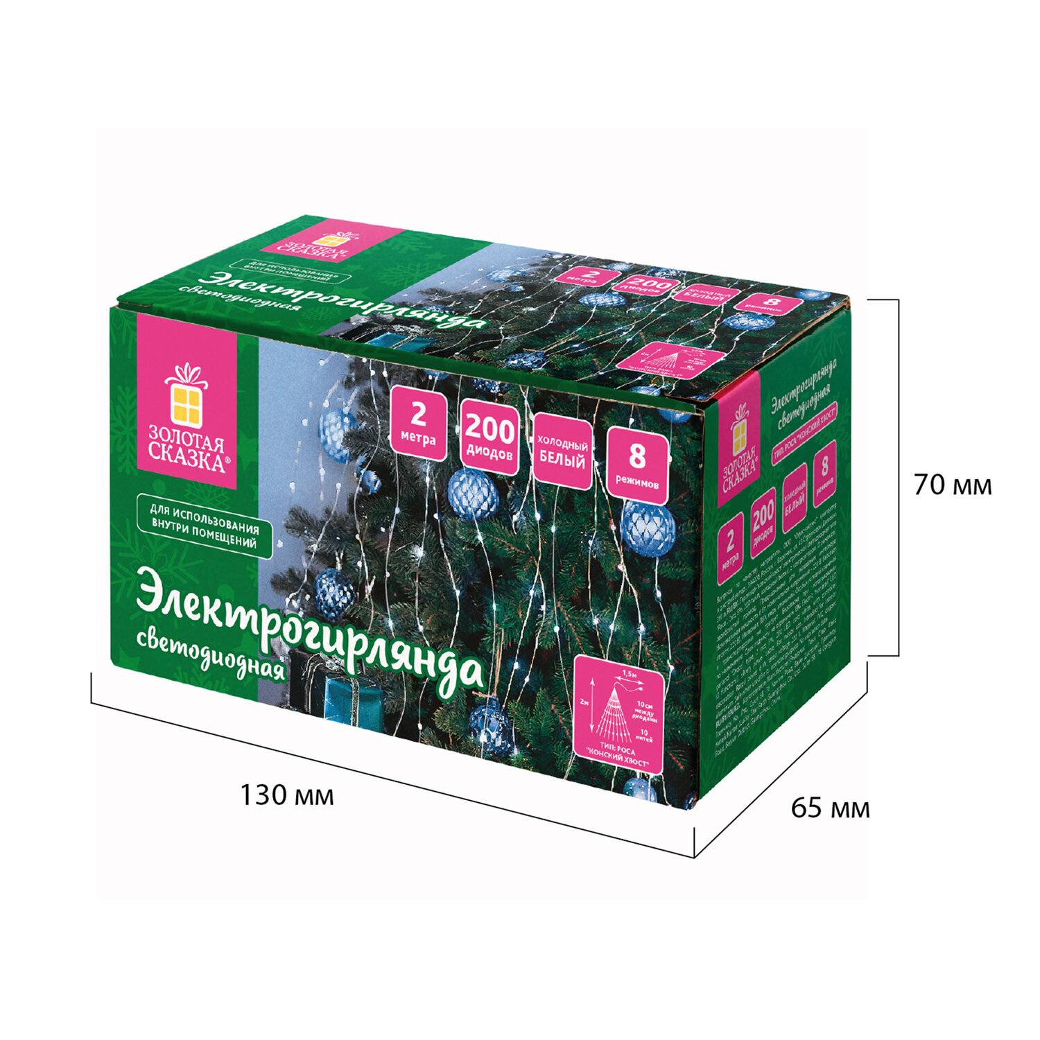 Электрогирлянда-конский хвост комнатная, 2 м, 200 LED, холодный белый, 220 V, ЗОЛОТАЯ СКАЗКА Код товара: 591366 553,98 ₽ Купить Производитель:ЗОЛОТАЯ СКАЗКА Гирлянда "Конский хвост" ЗОЛОТАЯ СКАЗКА – это великолепное украшение для Вашей новогодней ели, которое добавит уникальный шарм и волшебство в праздничную атмосферу! Гирлянда "Конский хвост" представляет собой 10 светодиодных нитей, которые связаны между собой в пучок и закреплены в пластиковый держатель. Длина гирлянды, составляющая 2 метра, позволяет одной гирляндой украсить всю ёлку быстро и стильно. Светодиодные лампы (200 шт.), сделаны на основе технологии LED, которая является более безопасной и эффективной по сравнению с лампой накаливания. Расстояние между светодиодами – 10 см. Цвет свечения гирлянды – холодный белый. Конструкцией гирлянды предусмотрено наличие контроллера для принудительного переключения между режимами свечения. Количество режимов свечения – 8 шт. Прибор работает от сети. Номинальное напряжение электрической цепи гирлянды составляет 220 V. Тип используемой штепсельной вилки для соединения с источником питания – europlug (CEE 7/4). Данный тип вилки рассчитан на напряжение до 220 V. Допускается использование только внутри помещений.Производство: КитайИспользование: помещениеТип электрогирлянды: "Конский хвост"Количество режимов: 8Наличие контроллера: даДлина: 2 мМощность: 6 ВтКоличество ламп: 200 шт.Тип ламп: светодиоднаяФорма ламп/фигуры: капляЦвет ламп: холодный белыйЦвет провода: серебристыйПитание: сеть, 220 ВУпаковка единицы товара: картонная коробкаВес: 100 грРазмер упаковки: 6.5 × 7 × 13 смОбъём: 0.0007 м3Промежуточная упаковка: 20 штТранспортная упаковка: 20 штШтрих-код: 4606224511269 Сертификат-1.jpg Сертификат-2.jpg