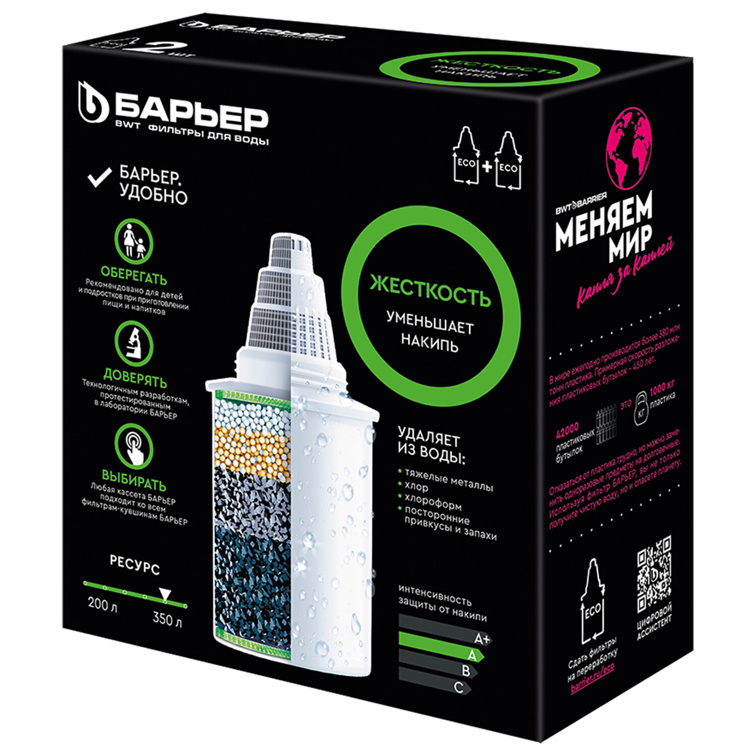 Сменная кассета БАРЬЕР "Жесткость", для жесткой воды, КОМПЛЕКТ 2 шт., ресурс 2х350 л Код товара: 702820 731,2 ₽ Купить Производитель:БАРЬЕР Комплект из двух кассет БАРЬЕР "Жесткость" – это практичное решение для домов и квартир с жёсткой водопроводной водой, где белый налёт в чайнике, известковый осадок на кранах и снижение срока службы бытовой техники становятся повседневной проблемой. Каждая кассета в наборе эффективно уменьшает содержание солей кальция и магния, которые вызывают жёсткость, тем самым предотвращая образование накипи в кофемашинах, утюгах, чайниках и других приборах. При этом вода проходит многоступенчатую очистку: хлор и его соединения, тяжёлые металлы, пестициды, нефтепродукты, органические загрязнители и механические примеси надёжно удаляются благодаря комбинации ионообменных смол и активированного угля. В основе конструкции – герметичное резьбовое соединение, исключающее подмешивание неочищенной воды, и высококачественный пищевой пластик, безопасный для контакта с питьевой водой. Скорость фильтрации составляет 300 мл/мин, а ресурс каждой кассеты – до 350 литров (или до 3 месяцев использования, в зависимости от интенсивности). Для семьи из 2–3 человек комплект обеспечит чистую, мягкую воду на 2–4 месяца. Все кассеты БАРЬЕР универсальны – этот комплект подходит ко всем фильтрам-кувшинам бренда без исключений. Предприятие-изготовитель оставляет за собой право вносить изменения в конструкцию, не влияющие на правила и условия эксплуатации, без отражения в документации. Представленные ниже характеристики носят справочный характер.Производство: РоссияТип модуля: кассетаСерия: ЖесткостьТип воды: жесткий, средней жесткостиСпециализация: умягчение и очистка водыСредний ресурс кассеты: 350 лКоличество в комплекте: 2 шт.Производительность: 0.3 л/минСрок годности: 36 месВес: 318 грРазмер упаковки: 6.5 × 14.6 × 12.5 смОбъём: 0.0014 м3Промежуточная упаковка: 18 штТранспортная упаковка: 18 штШтрих-код: 4601032004224 Файлы Сертификат-1.jpg Сертификат-2.jpg Сертификат-3.jpg Сертификат-4.jpg Сертификат-5.jpg