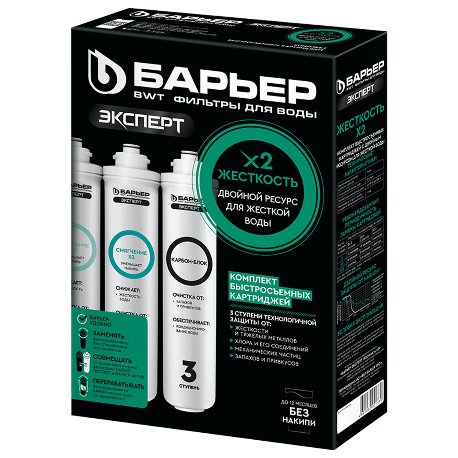 Картриджи сменные БАРЬЕР "ЭКСПЕРТ Жесткость Х2", 3 ступени, ресурс 1000 л, КОМПЛЕКТ 3 шт. Код товара: 702842 3 233,6 ₽ Купить Производитель:БАРЬЕР Комплект сменных картриджей БАРЬЕР "ЭКСПЕРТ Жесткость Х2" – это усиленное решение для домов с жёсткой водой, разработанное, чтобы вы забыли о накипи на целый год! Сменные быстросъемные картриджи для проточного фильтра БАРЬЕР "ЭКСПЕРТ". Комплект сменных картриджей БАРЬЕР "ЭКСПЕРТ Жесткость х2" для жесткой городской воды обладает повышенным ресурсом против накипи и позволяет забыть об осадке в чайнике на целый год. Производительность – 2 л/мин, ресурс до 12 месяцев. Вода проходит три этапа очистки: 1 ступень – картридж "Смягчение х1" для фильтра БАРЬЕР "ЭКСПЕРТ". Сочетание сорбционной и механической очистки, предварительное умягчение. Удаляет соли жесткости, тяжелые металлы, соединения хлора и механические частицы. 2 ступень – картридж "Смягчение х2" для фильтра БАРЬЕР "ЭКСПЕРТ". Сорбционная очистка и второй этап умягчения. Удаляет остаточные тяжелые металлы и соли жесткости. 3 ступень – картридж "Карбон-Блок" для фильтра БАРЬЕР "ЭКСПЕРТ". Убирает остаточные соединения хлора, кондиционирует воду и улучшает вкусовые свойства. Картриджи подходят к фильтрам линеек БАРЬЕР "ЭКСПЕРТ", БАРЬЕР "ЭКСПЕРТ СЛИМ", БАРЬЕР "Актив", БАРЬЕР "ОНИКС". Картриджи БАРЬЕР "ЭКСПЕРТ" не совместимы с линейками БАРЬЕР "ПРОФИ", БАРЬЕР "МАСТЕР", БАРЬЕР "Компакт", БАРЬЕР "Эволюшн". Не требуют для замены специальных ключей, инструментов или навыков. Производитель оставляет за собой право без предварительного уведомления вносить изменения в технические характеристики, комплектацию и конструкцию, не ухудшающие эксплуатационные характеристики изделия.Производство: РоссияТип модуля: картриджСерия: ЭкспертТип воды: жесткий, средней жесткостиСпециализация: умягчение и очистка водыСредний ресурс кассеты: 1000 лКоличество в комплекте: 3 шт.Производительность: 2 л/минСрок годности: 36 месВес: 2,3 кгРазмер упаковки: 8 × 33.8 × 23 смОбъём: 0.0074 м3Промежуточная упаковка: 5 штТранспортная упаковка: 5 штШтрих-код: 4601032001339 Файлы Сертификат-1.jpg Сертификат-2.jpg Сертификат-3.jpg Сертификат-4.jpg
