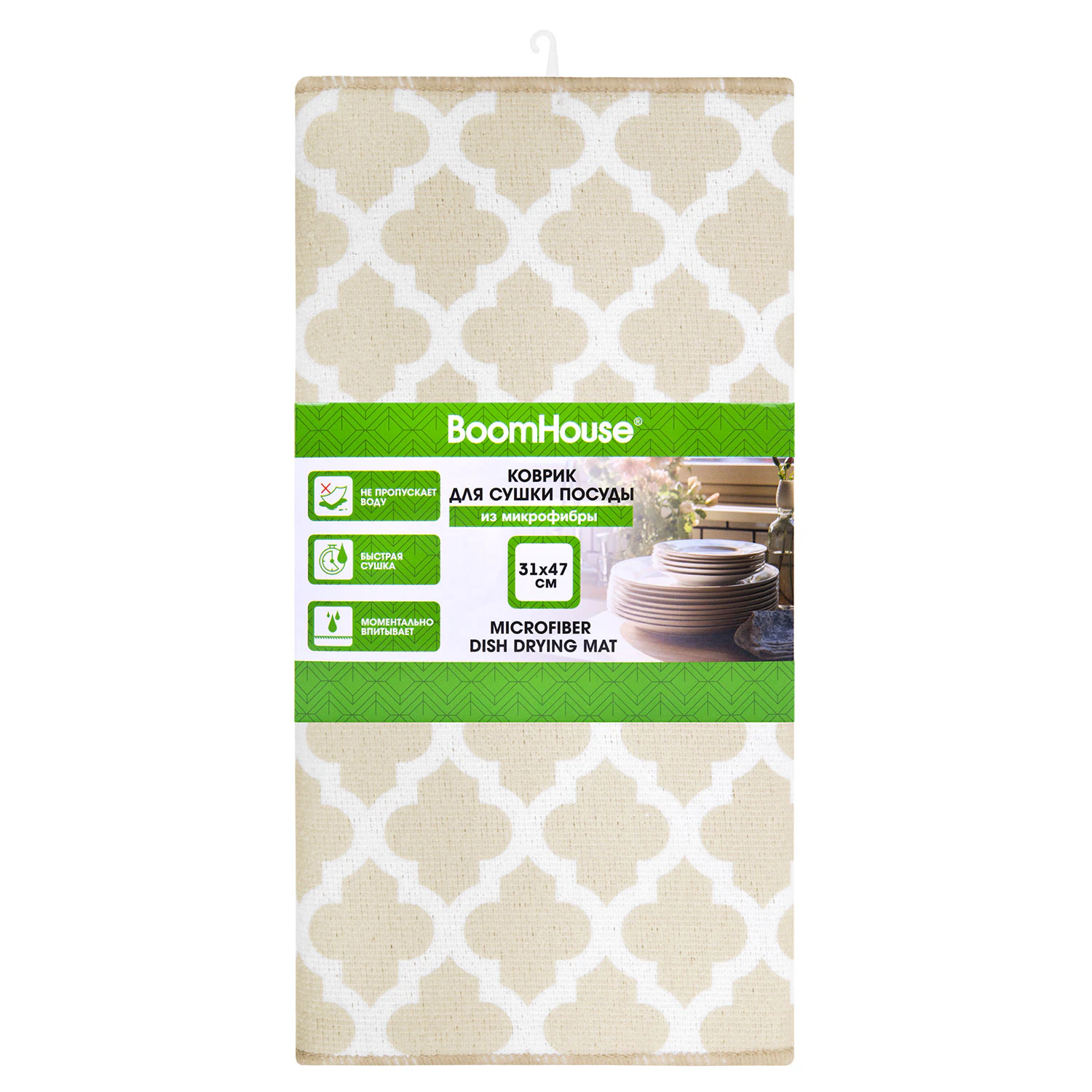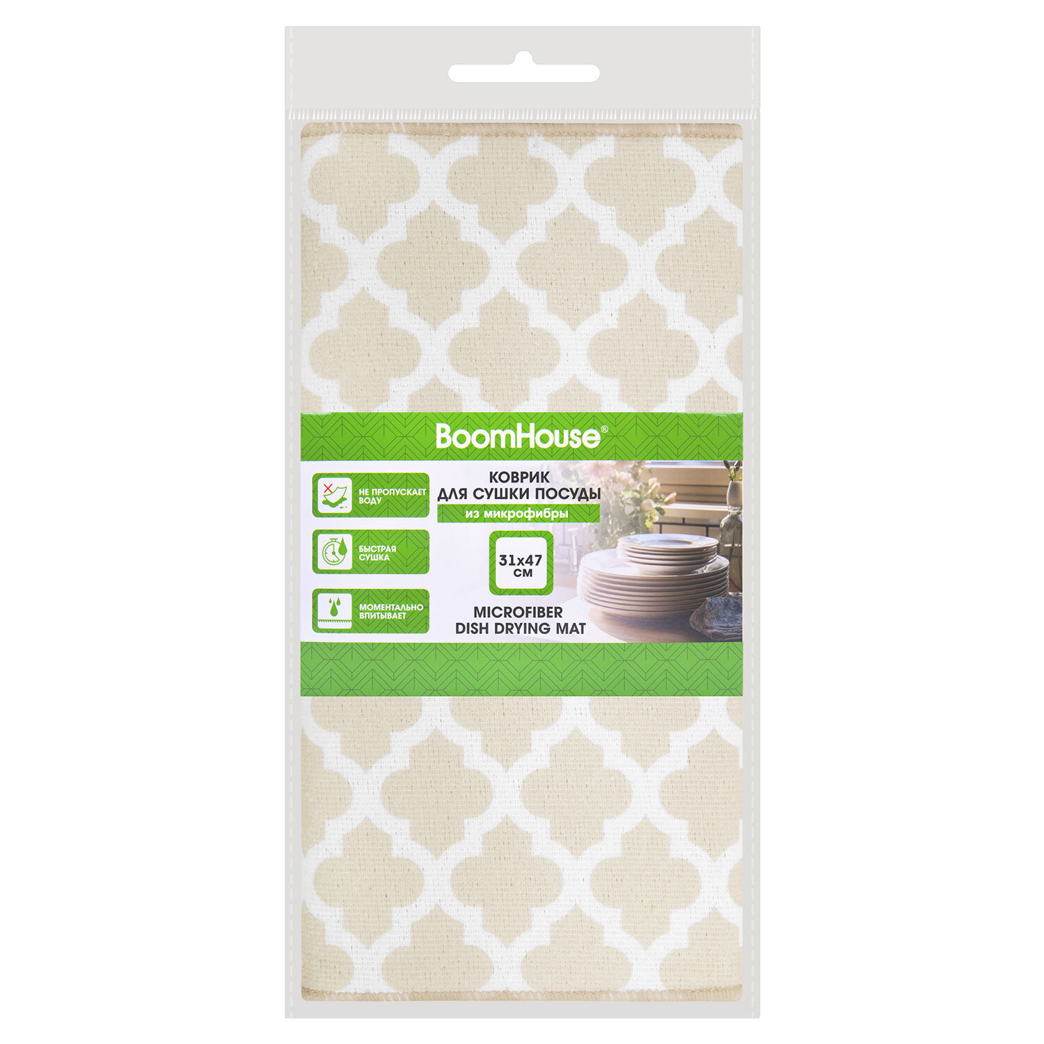 Коврик для сушки посуды из микрофибры, 31х47 см, "МАРОККАНСКИЙ УЗОР", 440 г/м2, BOOMHOUSE (БУМХАУС) Код товара: 701157 144,18 ₽ Купить Производитель:BoomHouse Коврик для сушки посуды BOOMHOUSE из микрофибры эффективно впитывает влагу и быстро сохнет, обеспечивая чистоту и порядок на кухне. Стильный и гигиеничный аксессуар идеально подойдёт для тех, кто заботится о собственном комфорте! Коврик для сушки посуды BOOMHOUSE – это современное гигиеничное решение для быстрой сушки любой посуды. Благодаря микрофибре и наличию внутренней прослойки из поролона, коврик для сушки посуды BOOMHOUSE моментально впитывает всю влагу, гарантируя, что поверхность под ним и вокруг раковины останется идеально сухой, что предотвращает появление луж и размножение бактерий. Коврик быстро сохнет и прост в уходе. Внешние стороны коврика изготовлены из микрофибры с суммарной плотностью 440 г/м2. Края обработаны оверлоком, что гарантирует долговечность и отсутствие распускания даже после многократных стирок. Толщина – 5 мм. Размер коврика (31x47 см) оптимален для размещения на ограниченном пространстве, но при этом позволяет сушить сразу несколько тарелок или крупную кухонную утварь. Форма коврика – прямоугольная. Каждый коврик BOOMHOUSE поставляется в индивидуальном пакете, а также имеет удобный пластиковый крючок для вывешивания на стойку.Производство: КитайТип коврика: ВлаговпитывающийНазначение: Для сушки посудыМатериал: Микрофибра, поролонРазмер: 31х47 смТолщина: 5 ммРисунок: даТип рисунка: Принт "Марокко"Цвет: бежевыйВес: 105 грРазмер упаковки: 1.9 × 32.2 × 17.1 смОбъём: 0.0011 м3Промежуточная упаковка: 48 штТранспортная упаковка: 48 штШтрих-код: 4606224506937 Файлы Сертификат-1.jpg Сертификат-2.jpg