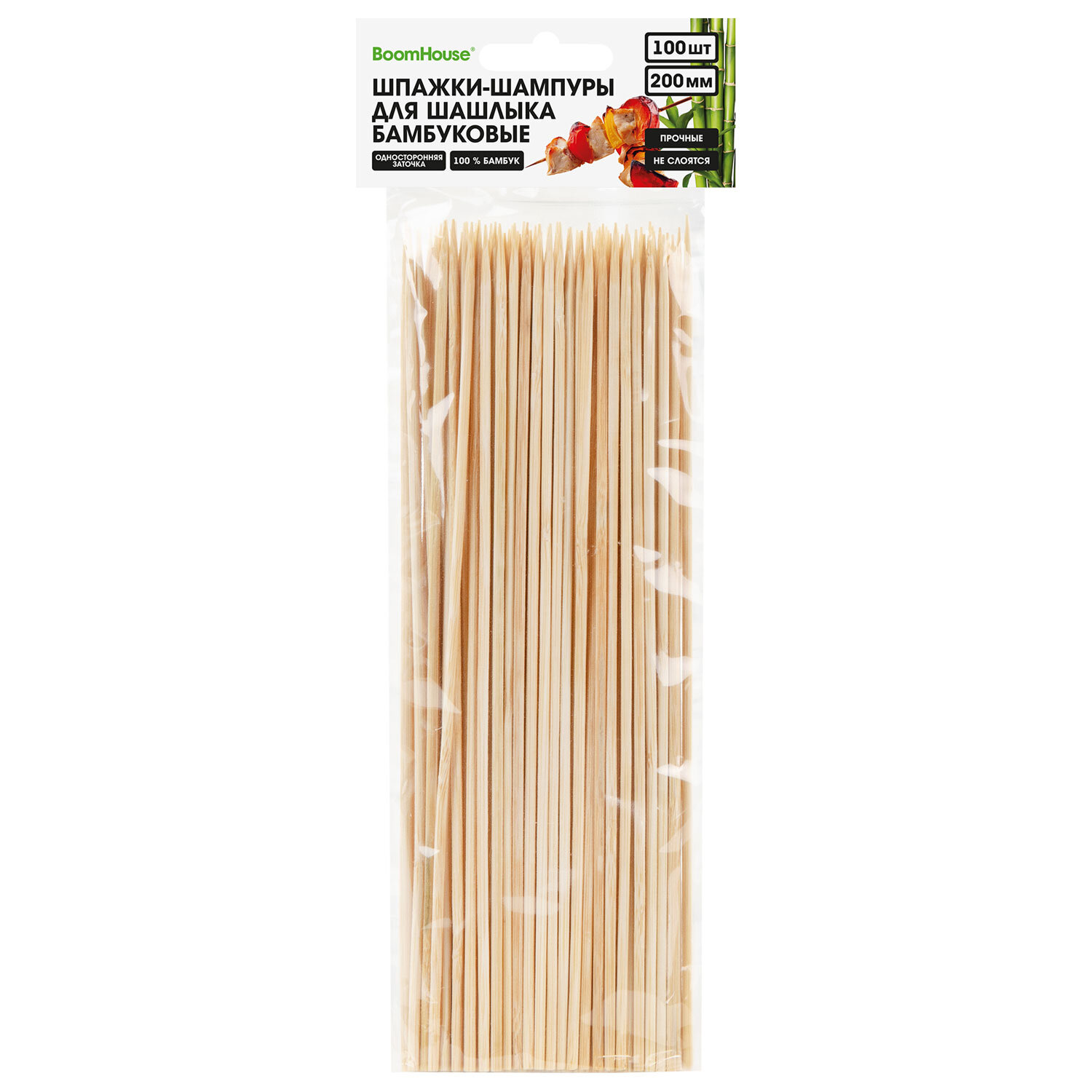 Шпажки-шампуры для шашлыка бамбуковые 200 мм, 100 шт., BOOMHOUSE (БУМХАУС) Код товара: 701958 36,37 ₽ Купить Производитель:BoomHouse Шампуры одноразовые BOOMHOUSE используются в быту и в заведениях общественного питания, предназначены для приготовления мяса, рыбы, овощей. Шампуры изготовлены из бамбука. Безопасны при использовании, так как не выделяют вредных веществ и не меняют вкус продуктов. Шампур представляет собой шпажку с заостренным концом с одной стороны и имеет круглое сечение. Длина - 200 мм. В комплекте 100 штук. Упакованы в пакет с европодвесом.Производство: КитайТип товара: шампуры для шашлыкаДлина: 200 ммДиаметр: 2.5 ммМатериал: бамбукКоличество в упаковке: 100 шт.Вес: 81 грРазмер упаковки: 1.2 × 20.2 × 8.7 смОбъём: 0.0002 м3Промежуточная упаковка: 100 штТранспортная упаковка: 100 штШтрих-код: 4606224518398 Файлы