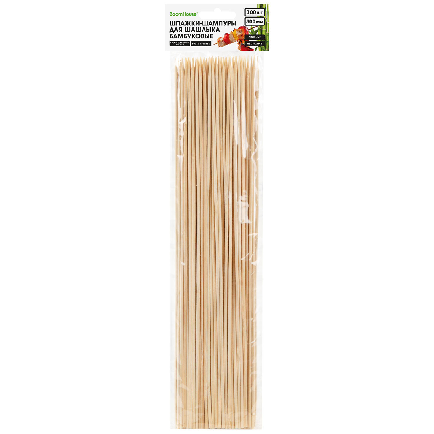 Шпажки-шампуры для шашлыка бамбуковые 300 мм, 100 шт., BOOMHOUSE (БУМХАУС) Код товара: 701960 48,3 ₽ Купить Производитель:BoomHouse Шампуры одноразовые BOOMHOUSE используются в быту и в заведениях общественного питания, предназначены для приготовления мяса, рыбы, овощей. Шампуры изготовлены из бамбука. Безопасны при использовании, так как не выделяют вредных веществ и не меняют вкус продуктов. Шампур представляет собой шпажку с заостренным концом с одной стороны и имеет круглое сечение. Длина - 300 мм. В комплекте 100 штук. Упакованы в пакет с европодвесом.Производство: КитайТип товара: шампуры для шашлыкаДлина: 300 ммДиаметр: 2.5 ммМатериал: бамбукКоличество в упаковке: 100 шт.Вес: 123 грРазмер упаковки: 1.3 × 30.1 × 8.7 смОбъём: 0.0003 м3Промежуточная упаковка: 100 штТранспортная упаковка: 100 штШтрих-код: 4606224518411 Файлы