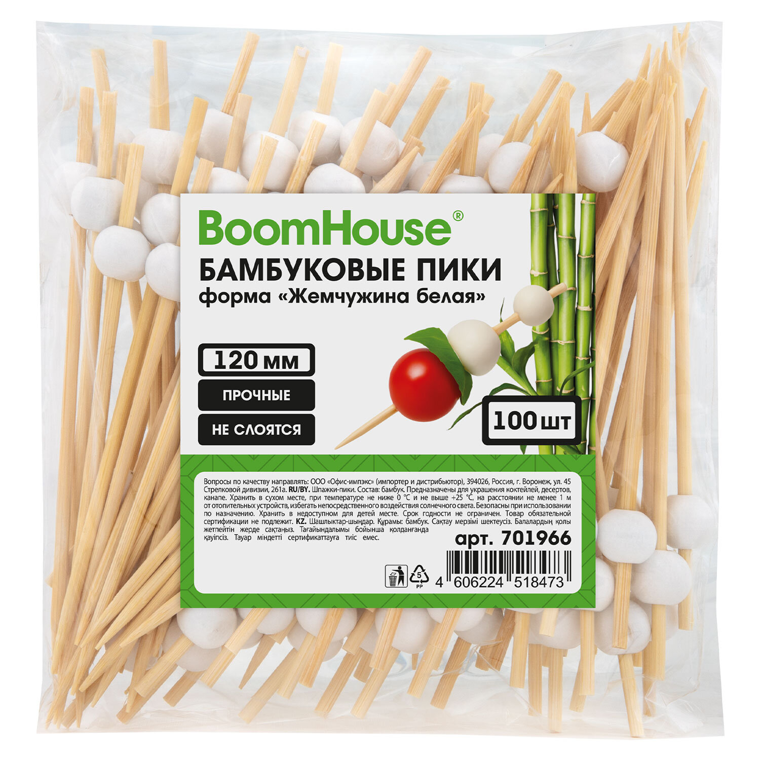 Шпажки-пики для канапе бамбуковые форма "Жемчужина белая" 12 см, 100 шт., BOOMHOUSE (БУМХАУС) Код товара: 701966 163,63 ₽ Купить Производитель:BoomHouse Шпажки-пики форма "Жемчужина белая" BOOMHOUSE отлично подходят для украшения закусок, создания мини-бутербродов и канапе на банкетах и фуршетах. Шпажки-пики изготовлены из бамбука. Безопасны при использовании, так как не выделяют вредных веществ и не меняют вкус продуктов. Изделия имеют наконечник в форме жемчужины. Длина - 12 см. В комплекте 100 шт. Упакованы в пакет.Производство: КитайТип товара: пики для канапеДлина: 120 ммДиаметр: 3 ммМатериал: бамбукКоличество в упаковке: 100 шт.Серия: Жемчужина белаяВес: 124 грРазмер упаковки: 4.5 × 14.5 × 13.6 смОбъём: 0.0007 м3Промежуточная упаковка: 100 штТранспортная упаковка: 100 штШтрих-код: 4606224518473 Файлы