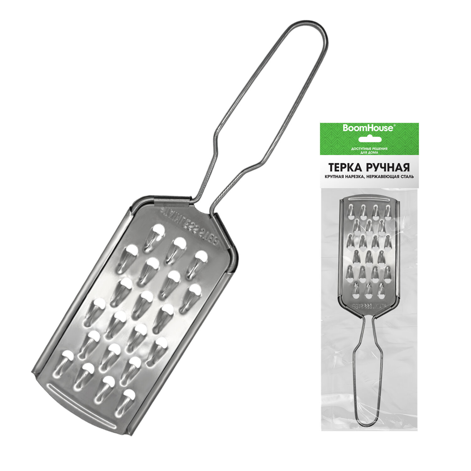 Терка ручная, крупная нарезка, нержавеющая сталь, BOOMHOUSE (БУМХАУС) Код товара: 702093 59,18 ₽ Купить Производитель:BoomHouse Ручная терка BOOMHOUSE – ваша незаменимая помощница на кухне. Благодаря острым лезвиям, прочной конструкции, компактному размеру и удобной ручке она легко справится с любыми продуктами и сделает приготовление блюд максимально простым и комфортным. Терки и овощерезки находятся в прямом контакте с пищевыми продуктами, поэтому важную роль играет материал, из которого сделан инструмент. Терка BOOMHOUSE изготовлена из качественного материала, который соответствует всем требованиям безопасности – это мартенситная нержавеющая сталь SUS410, отличающаяся высокой коррозионной стойкостью, прочностью и устойчивостью к окислению. Крупная терка отличается от стандартных лезвий терок уменьшенным размером отверстий (4 мм), что позволяет измельчать продукты в 2–3 раза мельче. Является универсальным решением для работы абсолютно с любыми продуктами. Часто используется при создании салатов, закусок или кондитерских изделий, идеальна для измельчения сыра, цедры, шоколада, орехов и овощей. Все лезвия превосходно заточены, что обеспечивает качественное и быстрое измельчение продуктов. Терку удобно держать использовать и хранить благодарю оптимальному размеру – 21,5х6х0,3 см. А легкий вес изделия (30 г) позволит вам не уставать при долгом использовании. Рекомендации по использованию: 1) Сразу после каждого использования терку следует очистить, тщательно вымыть и высушить. 2) При засорении отверстий не рекомендуется использовать абразивные средства или металлические скребки – можно воспользоваться щеткой, которой удобно очистить все поверхности. 3) Храните терку в сухом месте, вдали от агрессивных химикатов, которые могут вызвать коррозию, и металлических приборов, подверженных коррозии.Производство: КитайТип товара: терка ручнаяНазначение: универсальнаяКоличество типов лезвий: 1Тип лезвий: крупныеМатериал граней: Нержавеющая стальМатериал ручки: Нержавеющая стальЦвет ручки: стальнойВысота: 21.5 смШирина: 6 смГлубина: 0.3 смУпаковка: пакет с европодвесомВес: 32 грРазмер упаковки: 0.4 × 21.3 × 7.4 смОбъём: 0.0001 м3Промежуточная упаковка: 250 штТранспортная упаковка: 250 штШтрих-код: 4606224520001 Файлы