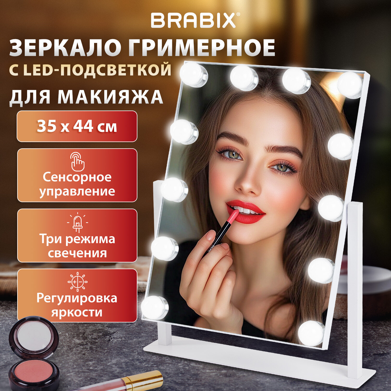Зеркало для макияжа гримерное с подсветкой, 12 LED-ламп, 3 режима свечения, размер 29х38 см, работа от сети 220V, цвет белый, BRABIX Код товара: 609336 3 027,28 ₽ Купить Производитель:BRABIX Гримерное зеркало BRABIX с LED-подсветкой – это красивый и практичный аксессуар, которому будет рада любая женщина. Три режима подсветки позволят подобрать оптимальный свет для нанесения макияжа и проведения процедур по уходу за лицом. Зеркало с LED-подсветкой, которая работает при помощи сенсорного управления. 12 LED-ламп расположены с 3-х сторон на поверхности зеркального полотна. В нижней части зеркального полотна расположены 3 сенсорные кнопки, предназначенные для включения/выключения, выбора света, а также регулировки яркости освещения. Короткое нажатие кнопки "M" позволяет выбрать цвет света: теплый белый, нейтральный белый или холодный белый. Длительное нажатие кнопки "Р" регулирует яркость в выбранном режиме. Зеркало в пластиковой рамке с устойчивой подставкой. Подвижное соединение обеспечивает плавный поворот на 360° и настройку угла наклона. Работает от сети 220 V или любого устройства, оснащенного USB-портом. Для подключения используется USB-кабель с адаптером (входит в комплектацию). Размеры зеркала – 38х29 см. Габариты зеркала с подставкой: высота – 44 см, длина – 35 см, ширина – 7 см. Питание – от сети 220 V. Количество LED ламп – 12. Длина USB-кабеля – 150 см. Цвет – белый. Упаковка – коричневый гофрокороб с одноцветной печатью.Производство: КитайТип размещения: настольноеФорма: прямоугольнаяВысота: 38 смШирина: 29 смВращающееся: даОбъем аккумулятора: работа от сетиМатериал оправы: пластикЦвет оправы*: белыйЦвет оправы: белыйВес: 2,63 кгРазмер упаковки: 7.4 × 45.5 × 36 смОбъём: 0.0145 м3Промежуточная упаковка: 6 штТранспортная упаковка: 6 штШтрих-код: 4606224440408 Файлы Сертификат-1.jpg Сертификат-2.jpg Сертификат-3.jpg Сертификат-4.jpg Сертификат-5.jpg