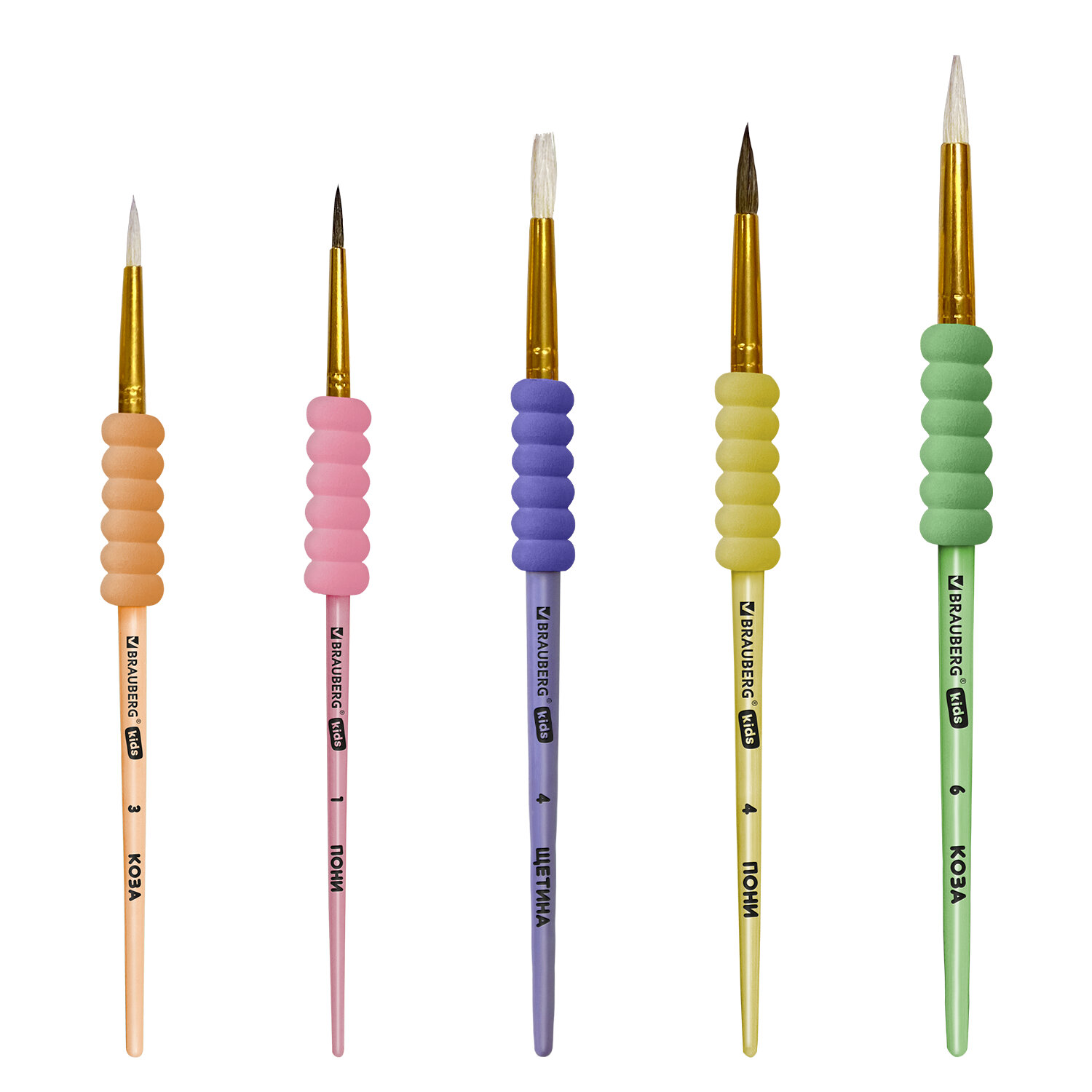 Кисти c EVA вставкой НАБОР 5 шт (ПОНИ круглые 1,4;КОЗА круглые 3,6;ЩЕТИНА плоская 4), BRAUBERG KIDS Код товара: 201091 165,8 ₽ Купить Производитель:BRAUBERG KIDS Набор из пяти кистей разного размера c мягкой EVA вставкой BRAUBERG KIDS позволяет начинающим художникам решать любые творческие задачи в детском саду, школе и дома. Кисти из волоса пони отлично впитывают и отдают краску, хорошо держат форму, долговечны и надежны. Благодаря кистям № 1, 3 и 4 ребенку будет комфортно прорисовывать мелкие детали. Кисть № 6 позволит делать более крупные мазки и линии. Пластиковую рукоятку c мягкой EVA вставкой удобно держать в руке.Производство: КитайКол-во кистей в наборе: 5 шт.Тип кисти: круглая, плоскаяНомер кисти: 1, 3, 4, 6Ворс: коза, пони, щетинаРучка: стандартнаяУпаковка: пакет с европодвесомСерия: -Вес: 35 грРазмер упаковки: 0.5 × 6.5 × 25 смОбъём: 0.0002 м3Промежуточная упаковка: 12 штТранспортная упаковка: 240 штШтрих-код: 4606224518152
