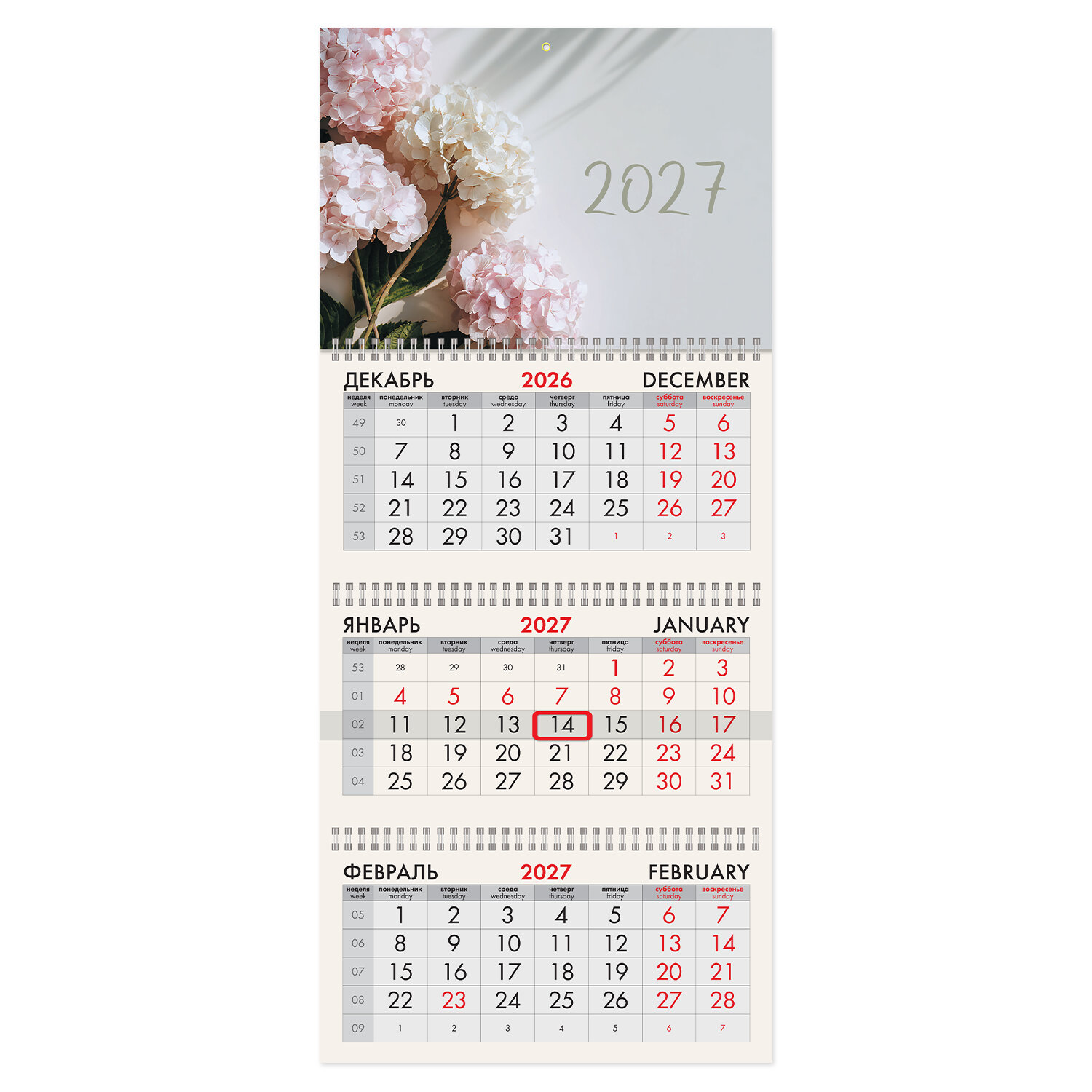 Календарь квартальный 2027г, 3 блока 3 гребня, бегунок, офсет, BRAUBERG, "Букет гортензий" Код товара: 118255 298,35 ₽ Купить Производитель:BRAUBERG Квартальный календарь BRAUBERG "Букет гортензий" предназначен для делового планирования. Офисный календарь на 2027 год на 3 гребнях. Состоит из 3 блоков с календарными сетками на три месяца – предыдущий, текущий и последующий. Блок календаря напечатан на офсетной бумаге плотностью 65 г/м2. Подложка изготовлена из мелованного картона плотностью 250 г/м2. Курсор-бегунок выделяет текущую дату. Вертикальный формат. Размер – 29,5х68,2 см. Поставляется в индивидуальной упаковке (полибег) с европодвесом и прокладкой из гофрокартона, что обеспечивает дополнительную защиту товара.Производство: РоссияТип календаря: квартальный на 3 гребняхГод: 2027Тип скрепления: гребеньРазмер: 29,5х68,2 смВнутренний блок: офсетная бумагаПлотность внутреннего блока: 65 г/м2Подложка: мелованный картонПлотность подложки: 250 г/м2Курсор: даПикколо: даДизайн: Букет гортензийКалендарная сетка: с разбивкой на 3 месяцаИндивидуальная упаковка: даВес: 250 грРазмер упаковки: 2 × 29.7 × 22.5 смОбъём: 0.0016 м3Промежуточная упаковка: 40 штТранспортная упаковка: 40 штШтрих-код: 4606224527390 Файлы