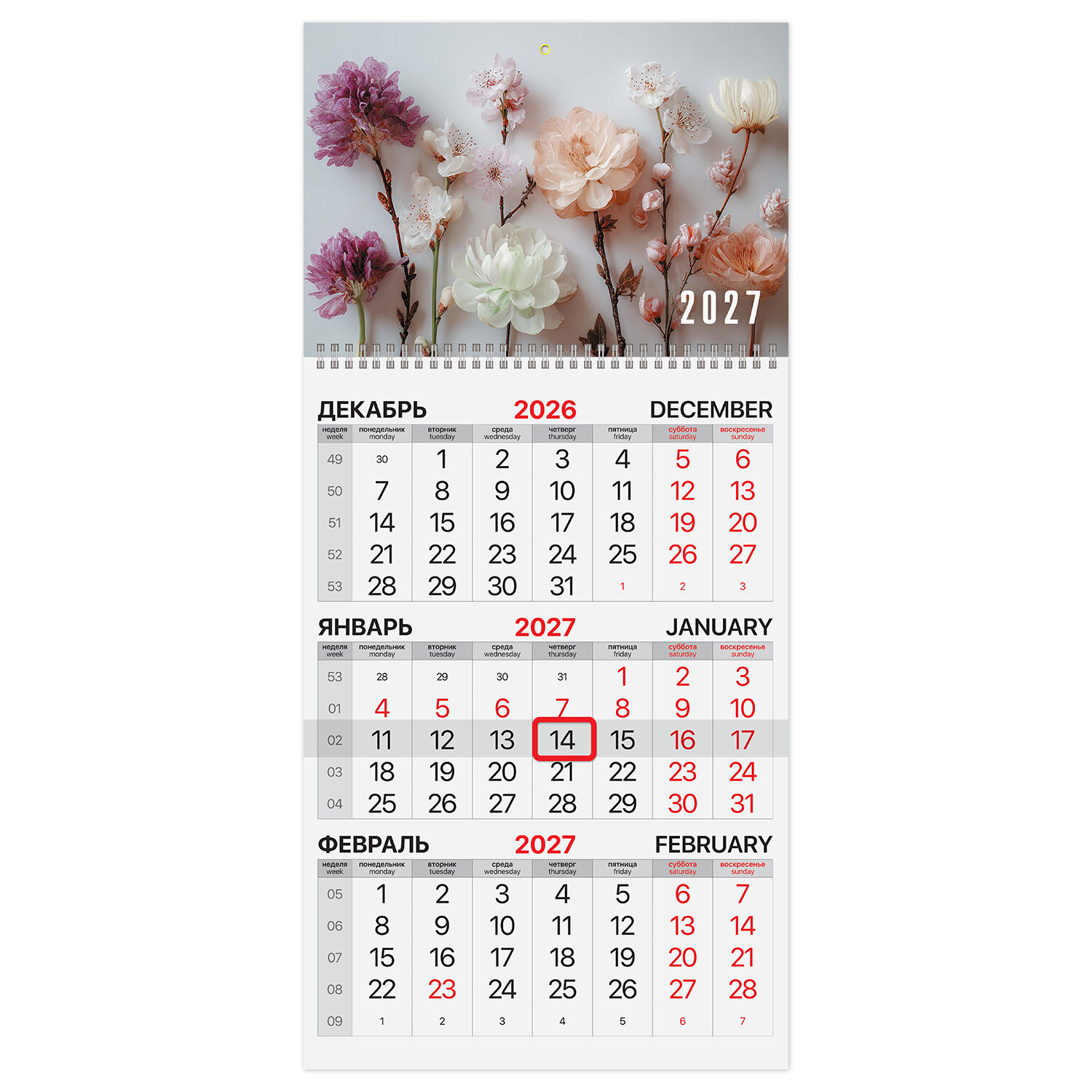 Календарь квартальный на 2027 г., 1 блок, 1 гребень, бегунок, мелованная бумага, BRAUBERG, "Цветы" Код товара: 118402 246,84 ₽ Купить Производитель:BRAUBERG Квартальный календарь BRAUBERG "Цветы" предназначен для делового планирования. Офисный календарь на 2027 год на гребне. Состоит из 1 блока с календарными сетками на три месяца - предыдущий, текущий и последующий. Блок календаря напечатан на мелованной бумаге плотностью 80 г/м2. Подложка изготовлена из мелованного картона плотностью 250 г/м2. Курсор-бегунок выделяет текущую дату. Вертикальный формат. Размер - 29,5х60 см. Календари ТМ BRAUBERG российского производства отпечатаны на современном высокотехнологичном оборудовании и соответствуют стандартам качества.Производство: РоссияТип календаря: квартальный на 1 гребнеГод: 2027Тип скрепления: гребеньРазмер: 29,5х60 смВнутренний блок: мелованная бумагаПлотность внутреннего блока: 80 г/м2Подложка: мелованный картонПлотность подложки: 250 г/м2Курсор: даПикколо: даДизайн: ЦветыКалендарная сетка: с разбивкой на 3 месяцаИндивидуальная упаковка: даВес: 198 грРазмер упаковки: 0.9 × 44.4 × 29.8 смОбъём: 0.0005 м3Промежуточная упаковка: 30 штТранспортная упаковка: 30 штШтрих-код: 4606224528861 Файлы
