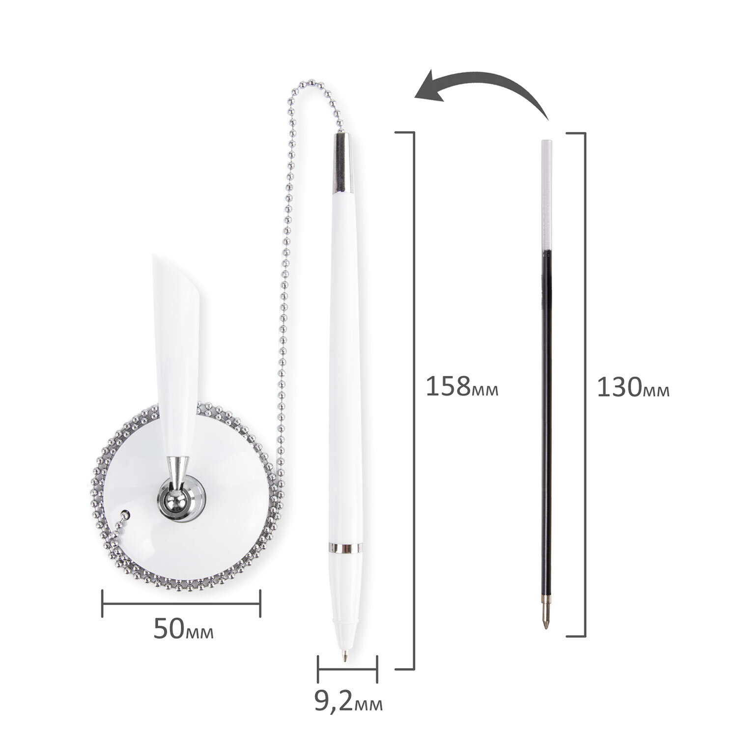Ручка шариковая настольная BRAUBERG "Стенд-Пен Уайт1", СИНЯЯ, цепочка, корпус белый, линия письма 0,5 мм Код товара: 141044 450,25 ₽ Купить Производитель:BRAUBERG Настольная шариковая ручка BRAUBERG "Стенд-Пен Уайт1" с классическим дизайном прекрасно впишется в интерьер любого офиса, информационного бюро и т.д. Корпус ручки и подставки выполнен из пластика белого цвета с хромированными деталями. Ручка крепится к подставке с помощью крепкой цепочки и фиксируется на любой ровной поверхности с помощью клейкого основания. Длина стержня составляет 130 мм. Диаметр основания - 5 см. Создает линию письма толщиной 0,5 мм. Цвет чернил - синий.Производство: КитайЦвет чернил: синийТолщина линии письма: 0.5 ммКрепление ручки к подставке: цепочкаСерия: Стенд-Пен 1Цвет корпуса: белыйСрок годности: 48 месВес: 52 грРазмер упаковки: 3 × 20.1 × 5.9 смОбъём: 0.0004 м3Промежуточная упаковка: 50 штТранспортная упаковка: 250 штШтрих-код: 4606224027067 Файлы Сертификат-1.jpg Сертификат-2.jpg Сертификат-3.jpg