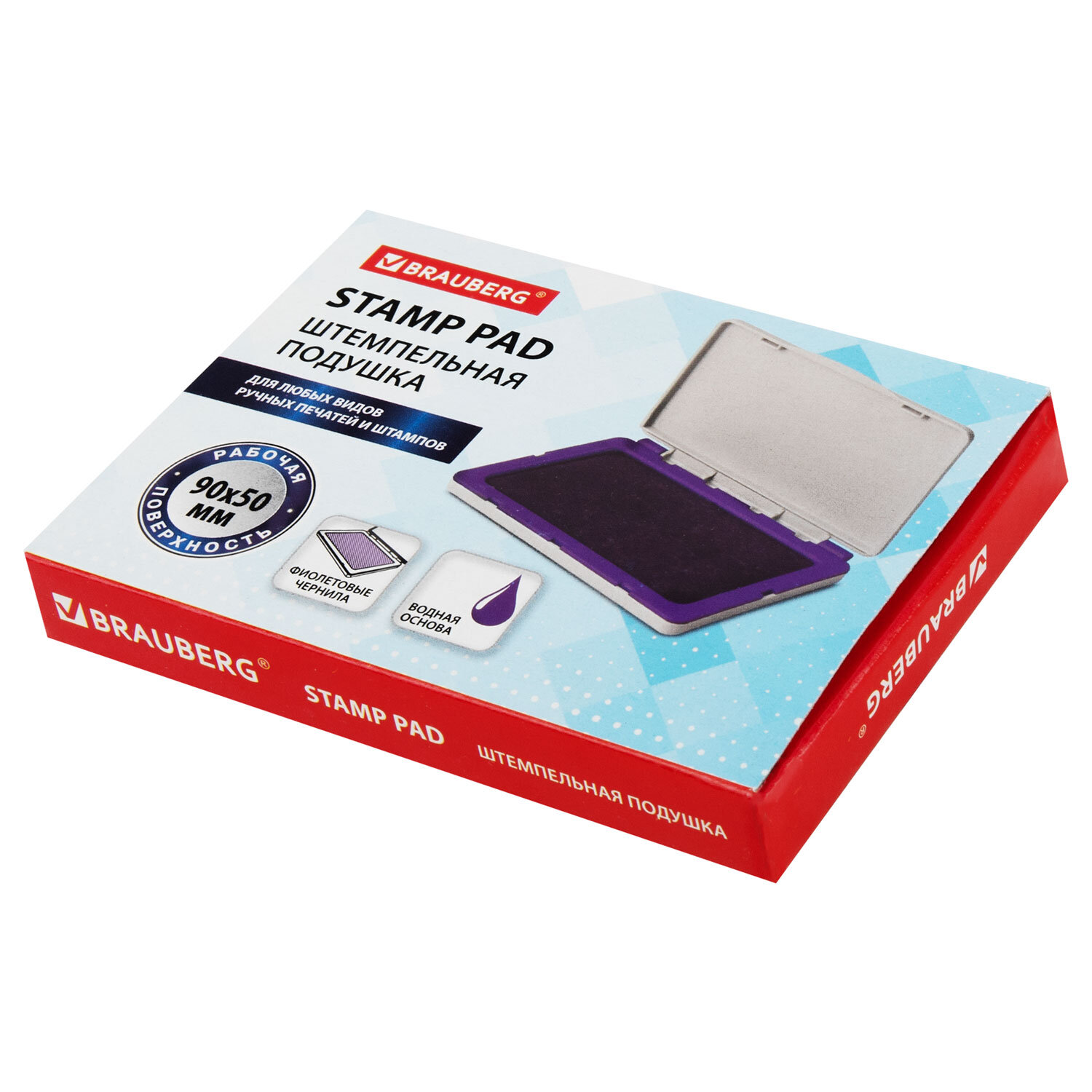 Высококачественные чернила на водной основе. Штемпельная подушка заправлена фиолетовой краской. Крышка пластикового корпуса коробочки закрывается плотно, препятствуя испарению влаги. Размер - 100х80 мм, рабочая поверхность - 90х50 мм.