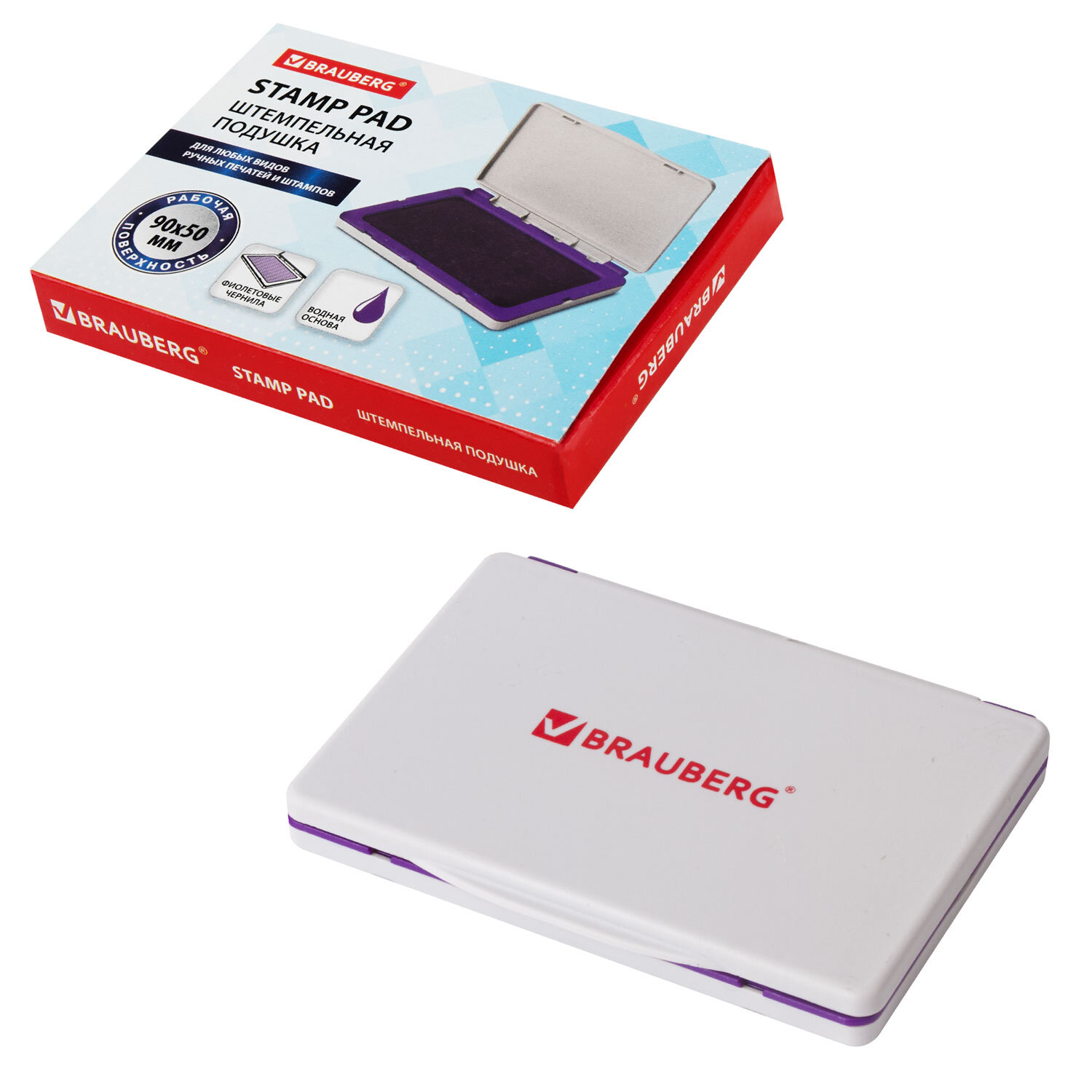 Штемпельная подушка BRAUBERG, 100х80 мм (рабочая поверхность 90х50 мм), фиолетовая краска