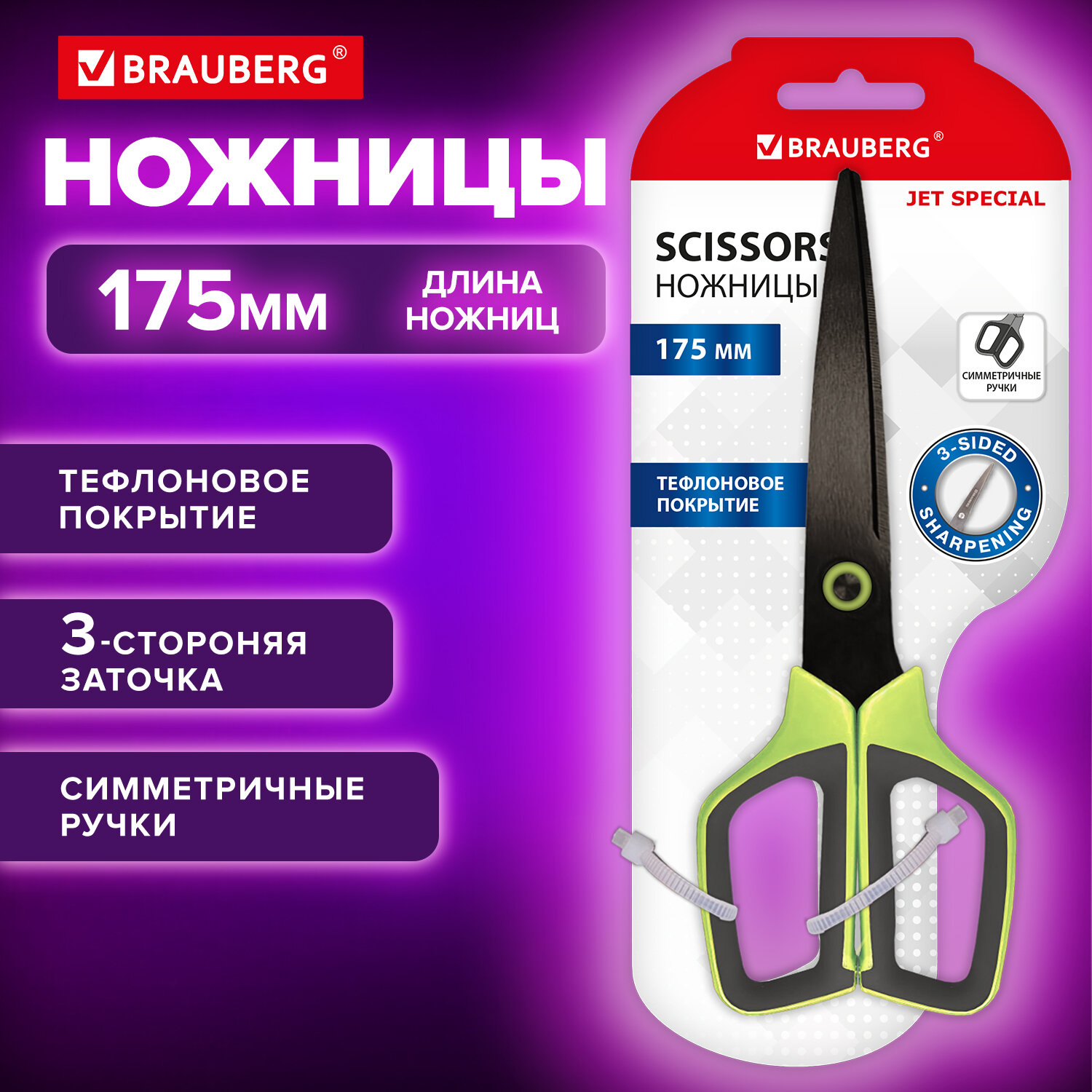 Ножницы BRAUBERG "JET Special", салатовые, 175 мм, 3-сторонняя заточка, тефлоновое покрытие Код товара: 238851 512,87 ₽ Купить Производитель:BRAUBERG BRAUBERG "JET Special" – это ножницы для разрезания бумаги и картона. Идеальный вариант для регулярного применения в офисе или дома. Лезвия имеют 3-стороннюю заточку, ручки из пластика с резиновыми вставками. Специальная форма ручек в значительной степени облегчает выполнение работы. Прочные и долговечные лезвия обеспечивают необходимую устойчивость к износу. Тефлоновое антискользящее покрытие позволяет регулярно использовать ножницы при резке скотча, не беспокоясь о возможном его прилипании к лезвиям и появлении следов от липкой поверхности клейкой ленты. Резиновые вставки исключают скольжение пальцев рук. Это ножницы для тех, кто хочет добавить в набор канцелярских принадлежностей удобный, стильный и красивый инструмент, позволяющий в кратчайшие сроки и без лишних сложностей справиться с любой поставленной задачей – разрезанием бумаги, картона и т.д.Производство: КитайДлина: 175 ммТип ножниц: для правшиЗаточка лезвий: трёхсторонняяСимметричные ручки: даФорма лезвий: остроконечныеДлина лезвий: 111 ммСерия: JET SpecialМатериал лезвия: тефлоновое покрытиеМатериал ручек: пластик с резиновыми вставкамиЦвет ручек: черный/салатовыйУпаковка: блистер с европодвесомВес: 80 грРазмер упаковки: 1.3 × 21.9 × 9.1 смОбъём: 0.0003 м3Промежуточная упаковка: 12 штТранспортная упаковка: 96 штШтрих-код: 4606224472577 Файлы Сертификат-1.jpg Сертификат-2.jpg Сертификат-3.jpg Сертификат-4.jpg Сертификат-5.jpg Сертификат-6.jpg Сертификат-7.jpg Сертификат-8.jpg Сертификат-9.jpg Сертификат-10.jpg Сертификат-11.jpg Сертификат-12.jpg Сертификат-13.jpg Сертификат-14.jpg Сертификат-15.jpg Сертификат-16.jpg Сертификат-17.jpg Сертификат-18.jpg Сертификат-19.jpg Сертификат-20.jpg Сертификат-21.jpg Сертификат-22.jpg Сертификат-23.jpg Сертификат-24.jpg Сертификат-25.jpg Сертификат-26.jpg