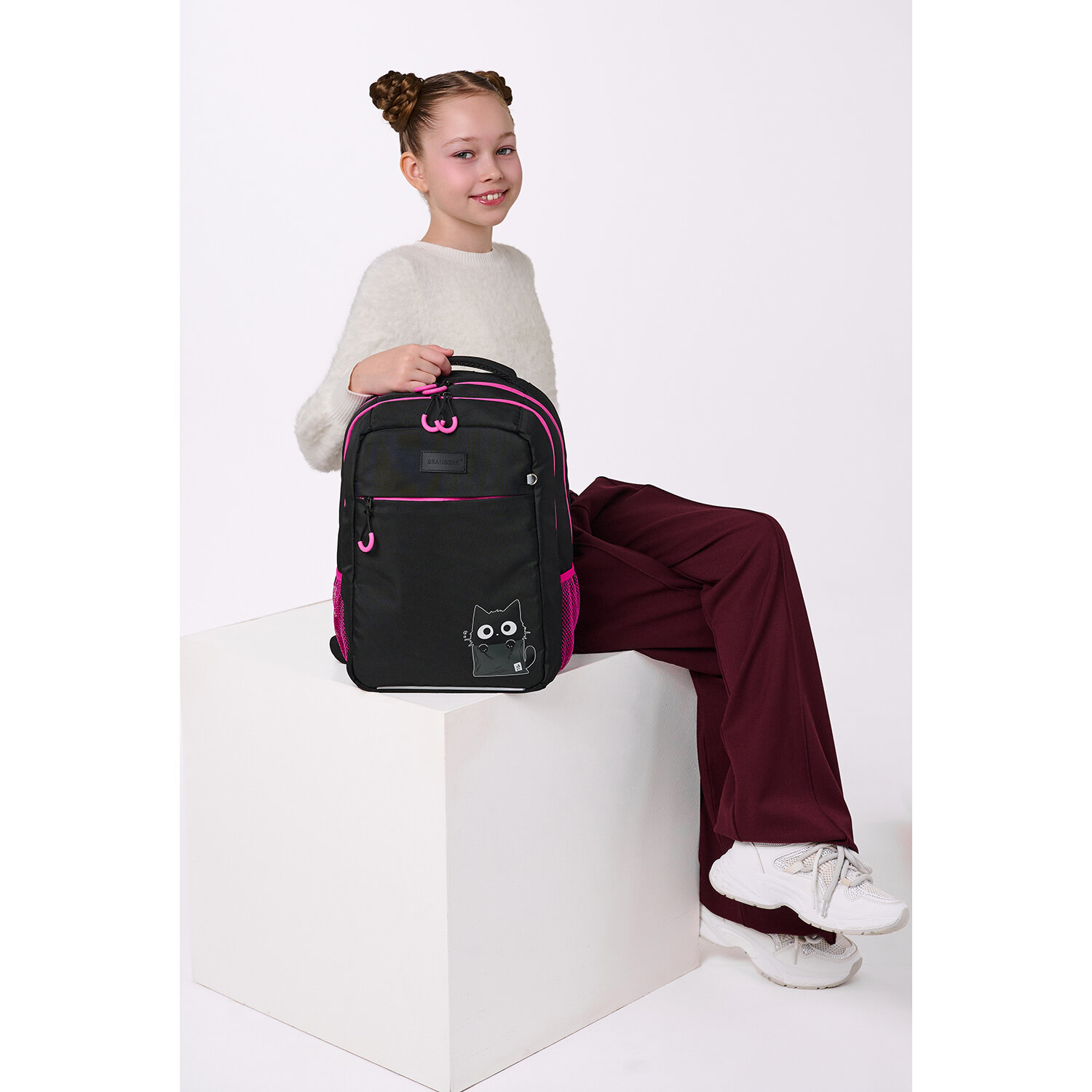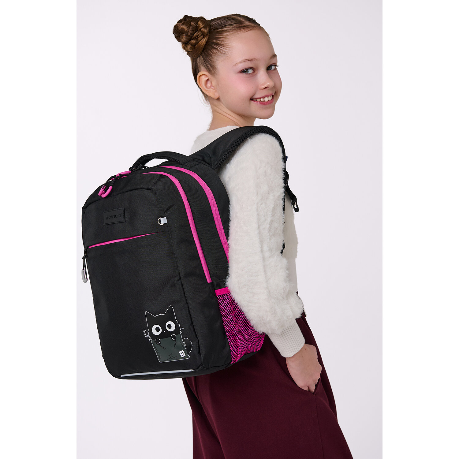 Рюкзак BRAUBERG MAIN, 2 отделения, 3 кармана, "Carton kitten", 38х26х17 см Код товара: 274398 2 398,84 ₽ Купить Производитель:BRAUBERG Серия универсальных рюкзаков BRAUBERG MAIN предназначена для учеников, которые предпочитают сдержанный, лаконичный стиль в сочетании с яркими элементами в дизайне. Размер и организация отделений рюкзака идеально подходят для школьников всех возрастов. Рюкзак изготовлен из высококачественной влагоотталкивающей нейлоновой ткани – кордура, в которой за счёт особой структуры нити достигнута четырёхкратная стойкость к истиранию по сравнению с простым нейлоном. Ткань легко чистится. Широкие дышащие лямки имеют S-образную форму. Особая конструкция лямок (пришиты по всему верхнему краю) позволила сделать этот элемент еще надёжнее и удобнее, поэтому носить рюкзак еще комфортнее. Съёмные нагрудные ремешки помогают равномерно распределять нагрузку на спину. Свисток, встроенный в пряжку нагрудного ремешка, обеспечит дополнительную защиту школьника в случае опасности. Удобная мягкая вентилируемая спинка с воздушными спонжевыми панелями разработана с учетом анатомических особенностей детей младшего и среднего школьного возраста. В процессе эксплуатации равномерное распределение нагрузки позволит сохранить правильную осанку. В основном отделении рюкзака можно легко и быстро разместить учебники и тетради формата А4+, а также воспользоваться прижимным отделением и дополнительным карманом на молнии. Также в основном отделении находится именная карточка школьника. Большое переднее отделение на молнии вмещает тетради и учебники формата А4+. Внутри переднего отделения находится съемный карабин для ключей, отделение из сетки и карман для телефона. Такая организация пространства поможет держать принадлежности в сохранности и приучить ребенка к порядку. В основном отделении рюкзака имеется жесткое откидное дно, которое необходимо для усиления каркаса рюкзака. Рюкзак легко открывать и закрывать одной рукой с любой стороны – каждое отделение имеет долговечную реверсивную молнию с двумя металлическими бегунками. В боковых карманах на резинке можно разместить бутылочку, термос или зонт. Нести рюкзак будет удобно не только на плечах, но и в руке за прочную уплотненную ручку. Также имеется специальная петелька из плетеной нейлоновой нити, чтобы вешать рюкзак на крючок парты. Светоотражающие элементы рюкзака расположены спереди, на торцах и на лямках. Они необходимы для безопасности ребенка в темное время суток. Рюкзак имеет специальное кольцо для крепления брелока, бейджа или школьного пропуска. Яркая этикетка расположена на передней стороне рюкзака, делая его более заметным на полке магазина, а информация на ней отражает главные потребительские свойства, помогая покупателю принять решение о покупке. Рюкзак упакован в плотный ПЭТ-пакет с замком Zip Lock, что поможет сохранить качество и товарный вид изделия при хранении и транспортировке.Производство: КитайПол ребенка: для девочекСерия: MAINДизайн: Carton kittenВозрастная группа: от 9 летОбъем: 18 лТип спинки: анатомическая, вентилируемая, формоустойчиваяНагрудный ремешок: даКоличество отделений: 2Количество карманов: 3 шт.Фронтальный карман: даБоковые карманы: даСветоотражающие элементы: даНаличие ручки для переноса: даРегулируемые лямки: даВентилируемые лямки: даМатериал спинки: сп