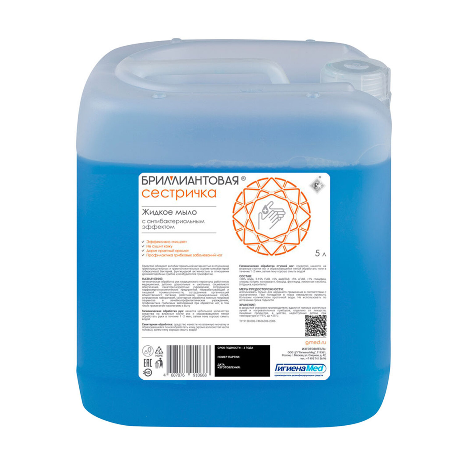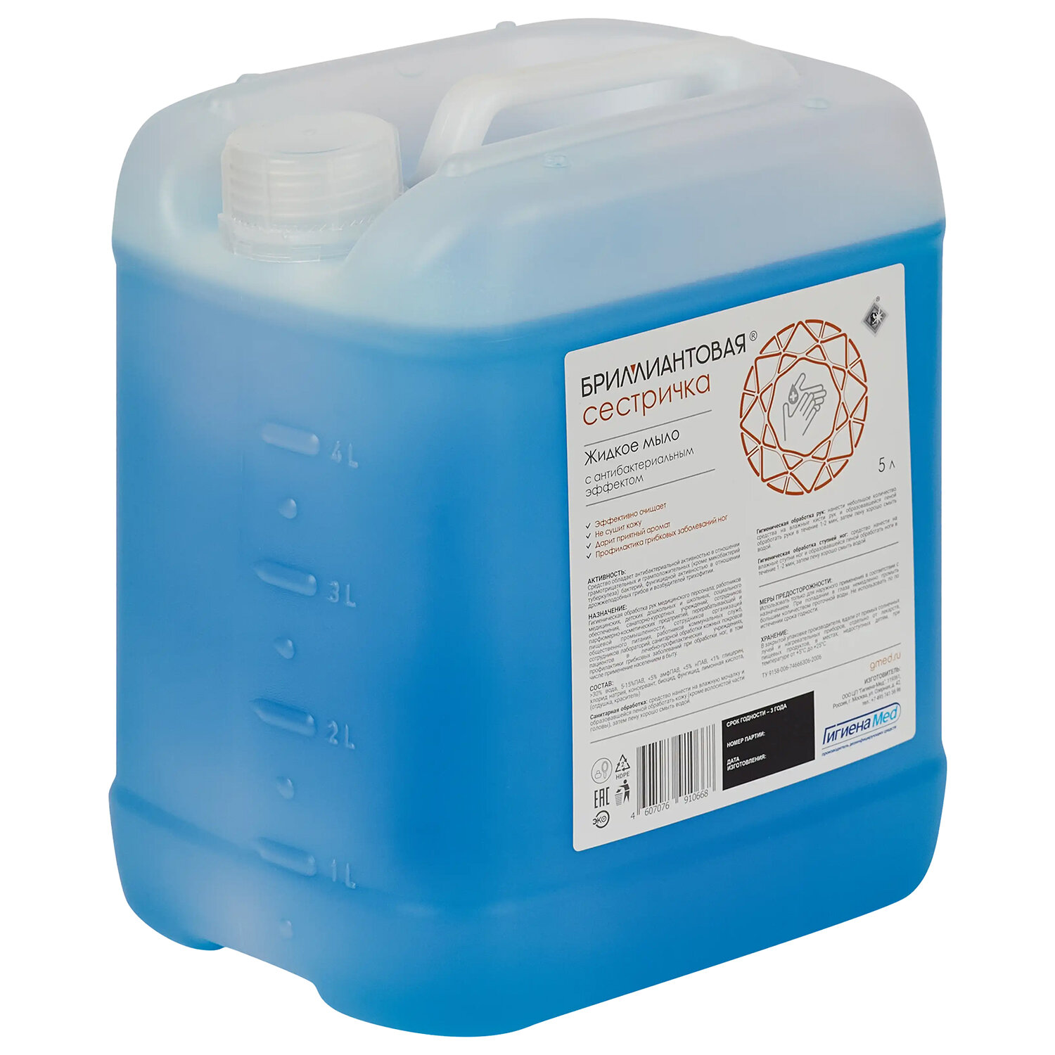 Мыло жидкое антибактериальное 5 л БРИЛЛИАНТОВАЯ СЕСТРИЧКА, гипоаллергенное Код товара: 605913 975,75 ₽ Купить Производитель:БРИЛЛИАНТ Жидкое гигиеническое мыло светло-голубого цвета - косметическое средство по уходу за кожей, обладает антибактериальной активностью в отношении грамотрицательных и грамположительных бактерий. Жидкое мыло предназначено для гигиенической обработки рук медицинского персонала; санитарной обработки кожных покровов пациентов в лечебно-профилактических учреждениях; гигиенической обработки рук медицинских работников детских дошкольных и школьных учреждений; гигиенической обработки рук работников учреждений соцобеспечения; гигиенической обработки рук сотрудников парфюмерно-косметических предприятий; гигиенической обработки рук сотрудников организаций общественного питания и пищевой промышленности; гигиенической обработки рук работников коммунальной службы; гигиенической обработки рук сотрудников санаторно-курортных учреждений; гигиенической обработки рук сотрудников лабораторий; профилактики грибковых заболеваний при обработке ног населением в быту.Состав: смесь ПАВ, биоциды, фунгициды, функциональные добавки, вода.Производство: РоссияОбъем: 5 лНазначение: для гигиенической обработки рукДействие: антибактериальное, противогрибковоеБез запаха: даПодходит для использования в детских учреждениях: даСерия: БРИЛЛИАНТОВАЯ СЕСТРИЧКАСоответствует требованиям ГОСТа: ТР ТС 009/2011pH: 6Упаковка: канистраСрок годности: 36 месВес: 5,54 кгРазмер упаковки: 22.6 × 19.4 × 14.5 смОбъём: 0.0077 м3Промежуточная упаковка: 4 штТранспортная упаковка: 4 штШтрих-код: 4607076910668 Файлы Приложение-1.pdf Сертификат-1.jpg Сертификат-2.jpg