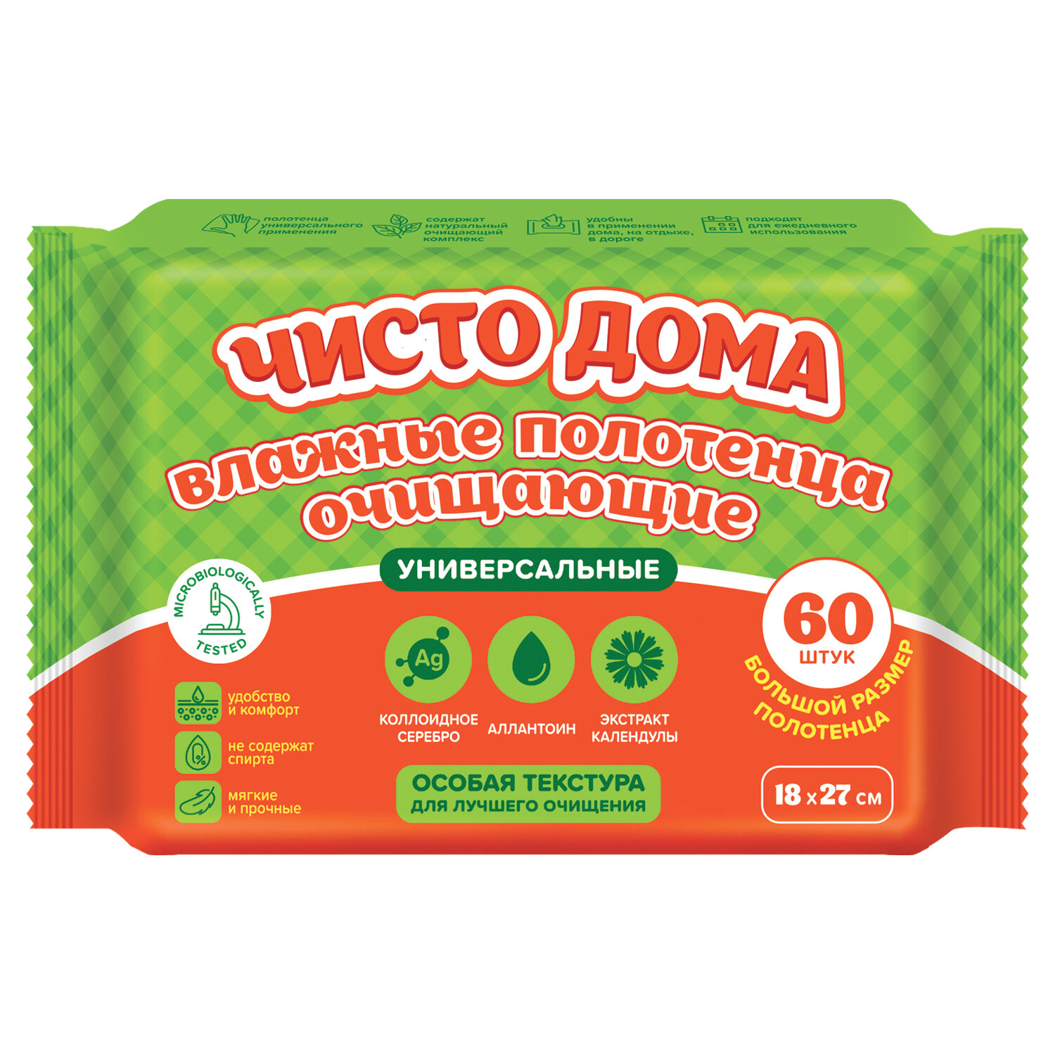 Полотенца влажные хозяйственные "УНИВЕРСАЛЬНЫЕ", 18х27 см, антибак, 60 шт, ЧИСТО ДОМА, ш/к 28433 Код товара: 702933 176,32 ₽ Купить Производитель:ЧИСТО ДОМА Влажные очищающие полотенца Чисто дома большого размера предназначены для мягкого очищения без использования воды и мыла. Используются в различных местах, при первой необходимости и если нет возможности провести полноценный уход. Влажные очищающие полотенца Чисто дома предназначены для бережного очищения кожи и эффективного удаления загрязнений. Благодаря экстракту календулы, входящему в состав, обладают противовоспалительным действием и дарят коже ощущение нежности и увлажнения. Не содержат спирт. Размер салфетки в развернутом виде - 180х270 мм. 60 штук в упаковке. Данный товар - отличный пример соотношения цены и качества.Производство: РоссияПрименение: универсальныеКоличество в упаковке: 60 шт.Особенности: антибактериальныеДлина салфетки: 27 смШирина салфетки: 18 смУпаковка: флоупакСрок годности: 30 месВес: 465 грРазмер упаковки: 25 × 13 × 4.5 смОбъём: 0.0013 м3Промежуточная упаковка: 18 штТранспортная упаковка: 18 штШтрих-код: 4610080728433 Файлы