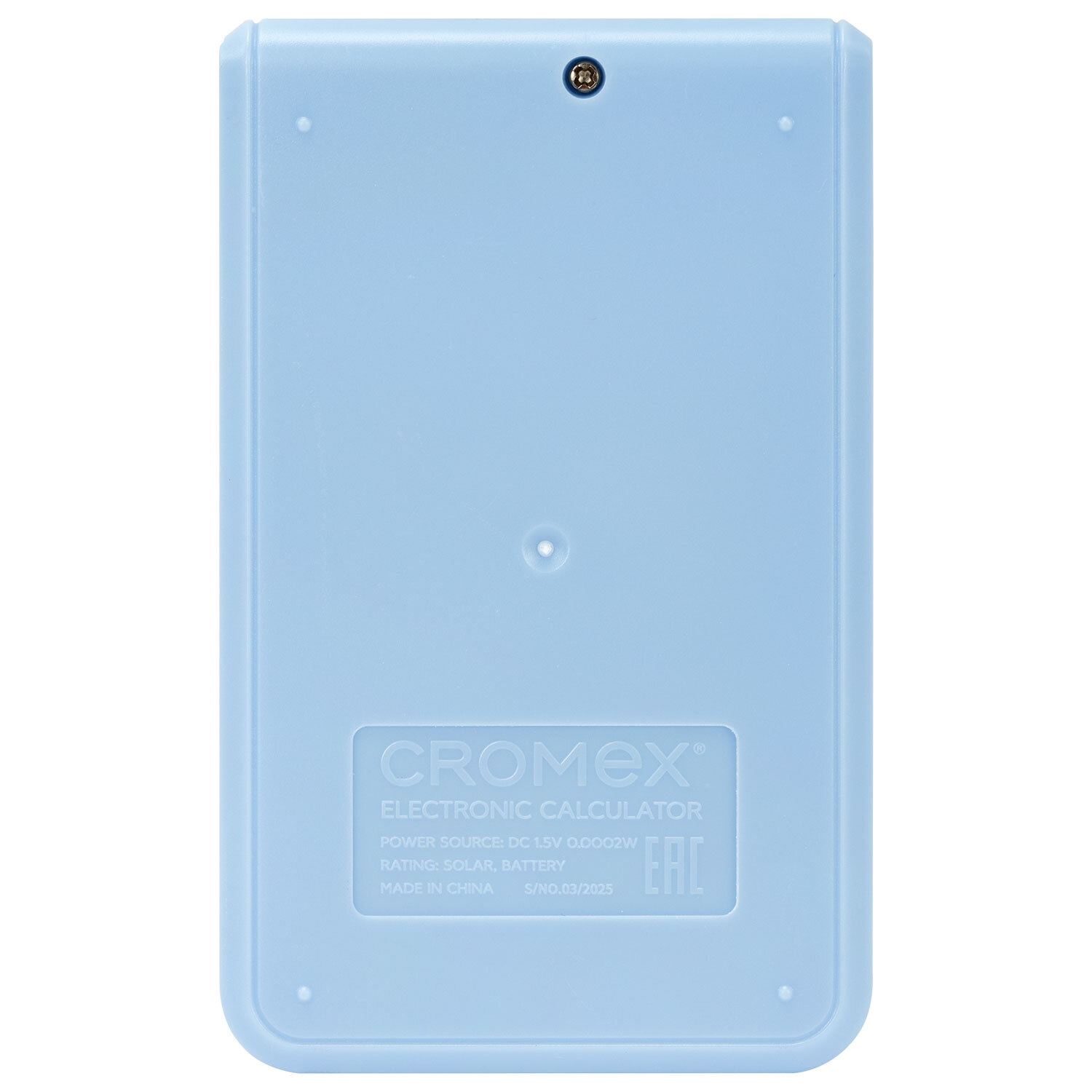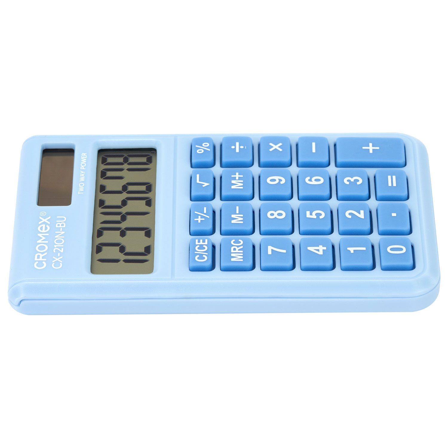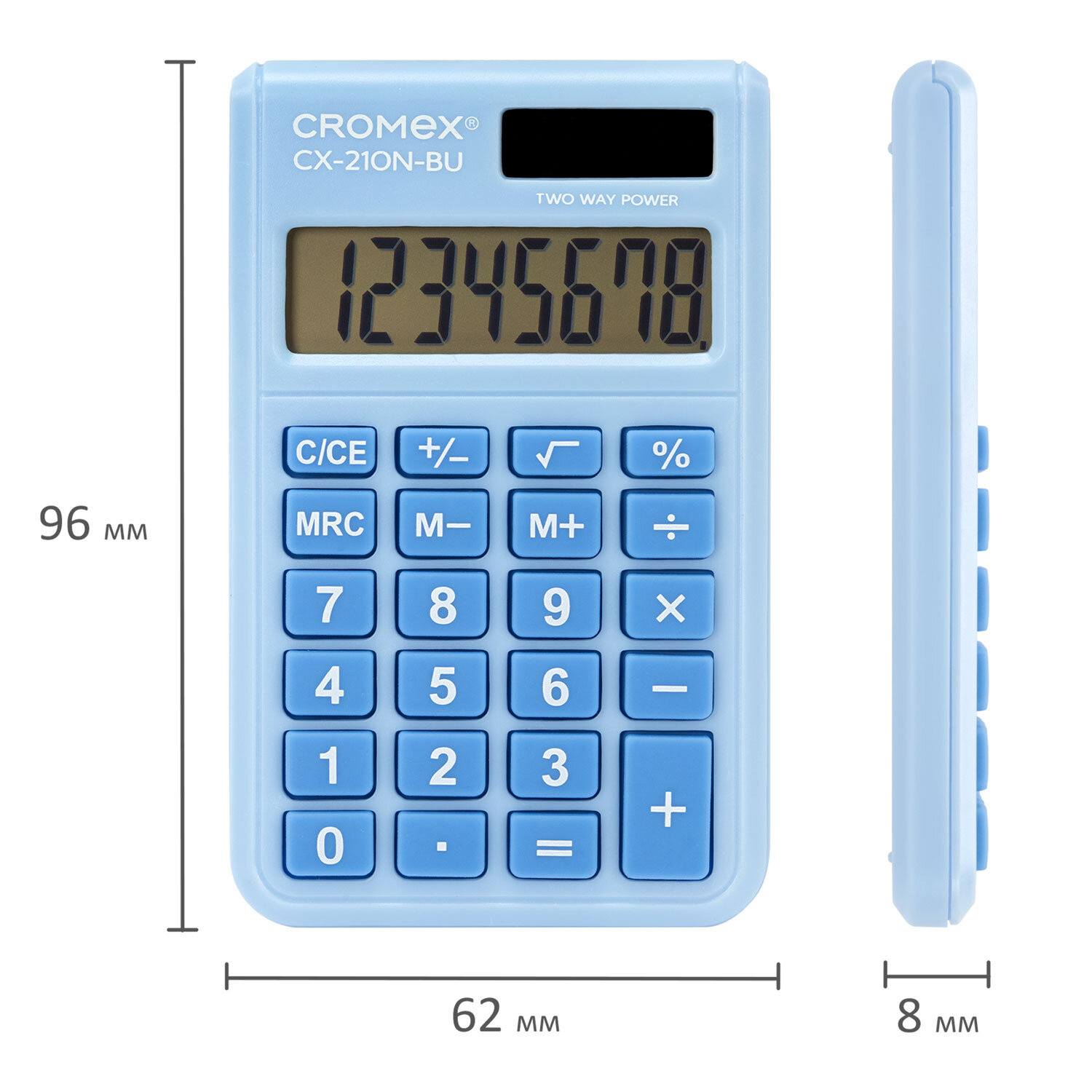 Калькулятор карманный CROMEX (КРОМЕКС) CX-210N-BU (96х62 мм), 8 разрядов, двойное питание, голубой Код товара: 273835 211,52 ₽ Купить Производитель:CROMEX Карманный калькулятор CROMEX CX-210N-BU – простой и надежный помощник в ежедневных расчетах в работе, учебе и дома. Нежный пастельно-голубой цвет корпуса принесет удовольствие при работе с расчетами. Калькулятор выполняет все базовые арифметические действия, операции с памятью и процентами, извлечение квадратного корня. Контрастный дисплей, резиновые кнопки для комфортной работы. Встроенный аккумулятор рассчитан на многолетнюю работу и оснащён функцией автоматического отключения (через 8–10 минут бездействия), что увеличивает срок службы без замены батареи. Размер – 96х62 мм. Гарантия – 12 месяцев. Инструкция на русском языке. Выполнен в пастельном голубом цвете.Производство: КитайРазрядность дисплея: 8Серия: CX-210NТип питания: 1 батарейка LR54 (LR1130/AG10), солнечный элементКонструктивные особенности: нетЦвет панели: голубойИсполнение: карманныйМатериал клавиш: резинаДлина корпуса: 96 ммШирина корпуса: 62 ммТолщина корпуса: 8 ммВес: 37 гФункционал: вычисление с памятью, извлечение квадратного корня, расчет процентов, сложение, вычитание, деление, умножениеУпаковка: картонная коробка с европодвесомРазмер упаковки: 1.7 × 12.8 × 7 смОбъём: 0.0002 м3Промежуточная упаковка: 100 штТранспортная упаковка: 600 штШтрих-код: 4606224498409 Файлы Сертификат-1.jpg Сертификат-2.jpg Сертификат-3.jpg