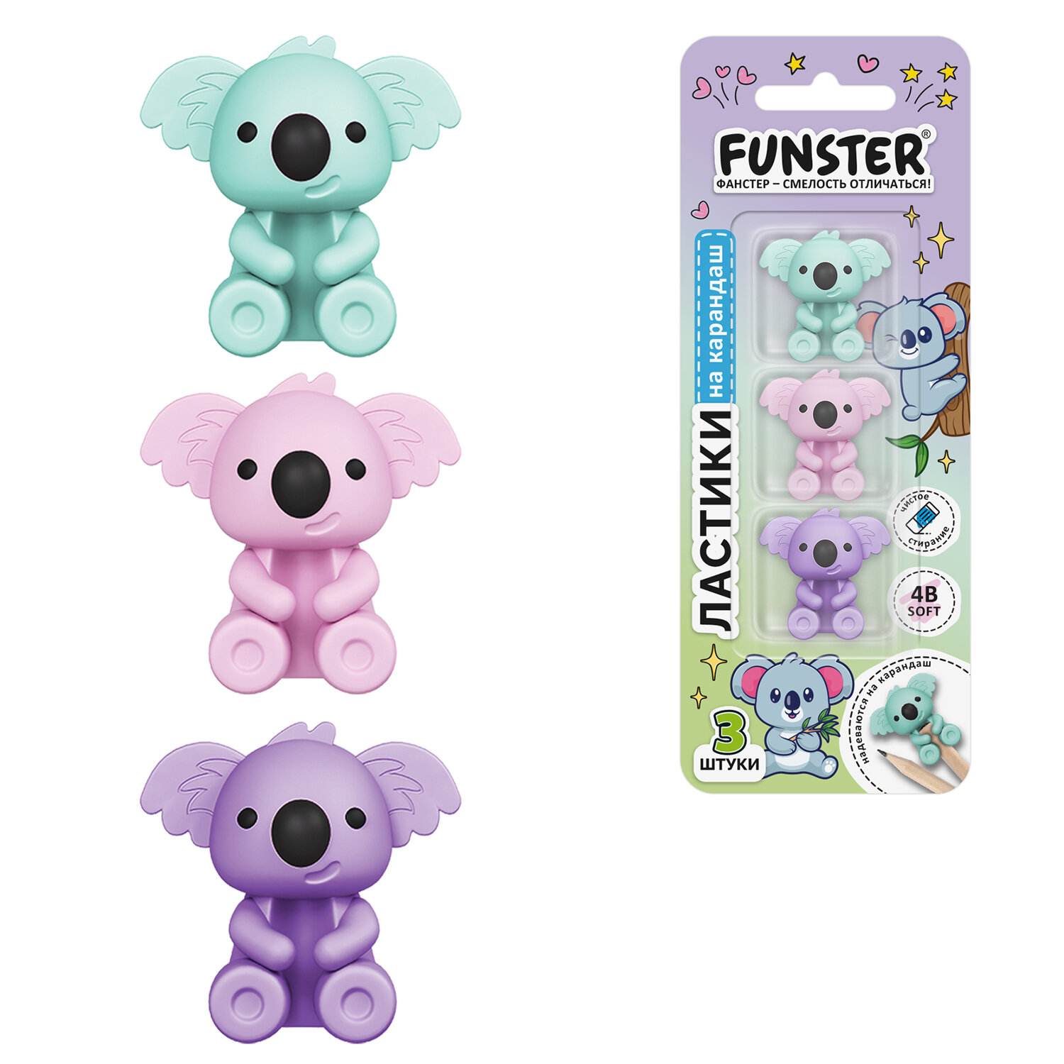 Ластик-топпер для карандаша FUNSTER (ФАНСТЕР) "КОАЛЫ", НАБОР 3 штуки, пастельные цвета ассорти, блистер Код товара: 274013 276,3 ₽ Купить Производитель:FUNSTER Ластик-топпер для карандаша FUNSTER "КОАЛЫ" предназначен для удаления надписей, сделанных чернографитным карандашом. Надевается на незаточенную сторону карандаша, всегда под рукой и не теряется. Идеальный подарок детям и взрослым. Ластики представляют из себя комбинированное канцелярское изделие: ластик для удаления графита с бумаги и декоративный топпер (насадка) на незаточенную часть карандаша. Выполнены в виде объемных фигурок коалы в трех пастельных цветах. Благодаря компактному размеру (32х31х19 мм) ластик не утяжеляет карандаш и плотно фиксируется на нём. Подходят для карандашей диаметром 6-8 мм. Ластики изготовлены из термопластичной резины. Материал безопасен, нетоксичен, не имеет резкого запаха, сертифицирован для детских товаров. Эластичная структура обеспечивает мягкое и чистое стирание без повреждения бумаги. Упакованы в прозрачный блистер с подвесом. В наборе три штуки. Ластики предназначены для детей и взрослых, используются в школе, офисе и дома как функциональный аксессуар и как сувенир.Производство: КитайКоличество в упаковке: 3 шт.Материал: термопластичная резинаФорма: фигурнаяЦвет: пастельный ассортиСерия: Ластики-топперыНе оставляет бумажной пыли: даРазмер: 32х31х19 ммИндивидуальная упаковка: даУпаковка: блистер с подвесомВес: 48 грРазмер упаковки: 2.1 × 16.9 × 6.1 смОбъём: 0.0002 м3Промежуточная упаковка: 24 штТранспортная упаковка: 96 штШтрих-код: 4606224512419 Файлы Сертификат-1.jpg Сертификат-2.jpg Сертификат-3.jpg