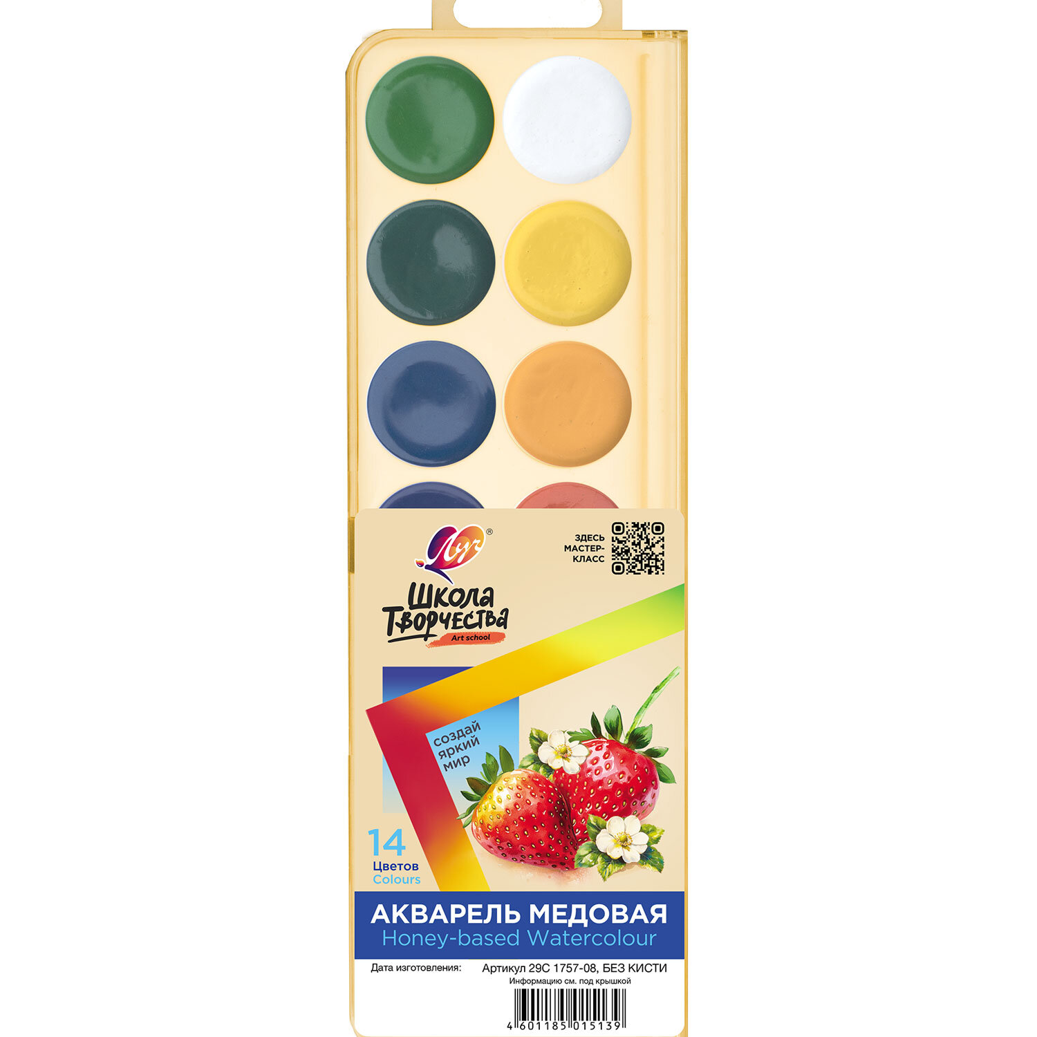 Краски акварельные ЛУЧ "Школа творчества", 14 цветов, медовые, без кисти, пластиковая коробка Код товара: 191595 185 ₽ Купить Производитель:ЛУЧ Краски акварельные изготовлены на основе органических пигментов и натурального связующего с добавлением пчелиного мёда. Предназначены для детского творчества и различных живописных работ. Отличаются хорошей прозрачностью, яркостью и чистотой цвета. Цвета: белила, желтый, оранжевый, желтый темный, розовый, изумрудно-зеленый, голубой, черный, коричневый, фиолетовый, светло-зеленый, алый, сиреневый, синий.Производство: РоссияКоличество цветов в наборе: 14 шт.Добавка в основу: мёдОтделение для кисточки: даФорма кювет: круглаяСпецэффект: нетСерия: Школа творчестваУпаковка: пластиковая коробка с европодвесомВес: 105 грРазмер упаковки: 1.2 × 8 × 22.8 смОбъём: 0.0002 м3Промежуточная упаковка: 36 штТранспортная упаковка: 36 штШтрих-код: 4601185015139 Файлы Сертификат-1.jpg Сертификат-2.jpg