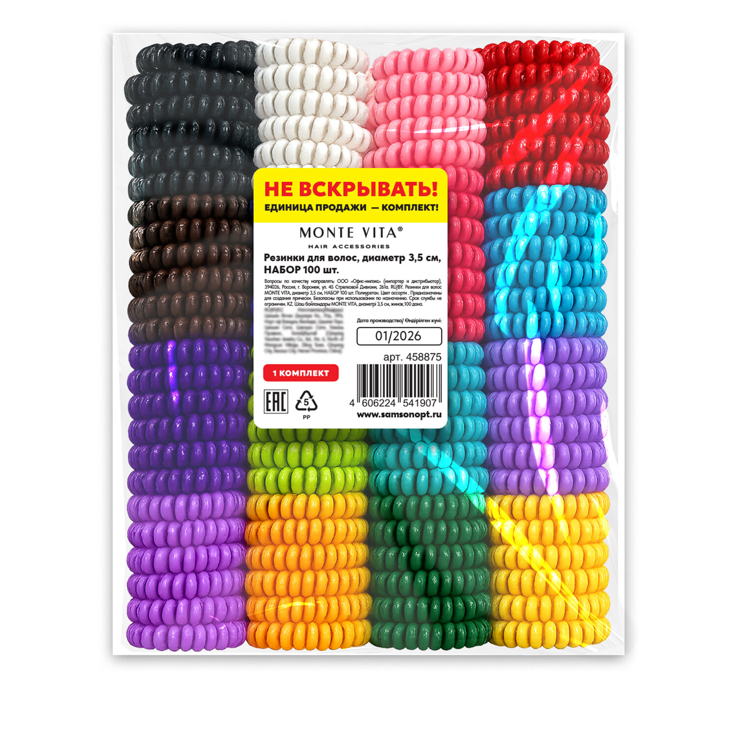 Резинки для волос НАБОР 100 шт, 3,5 см, пружинки, яркие цвета, MONTE VITA Код товара: 458875 789,06 ₽ Купить Производитель:MONTE VITA Резинки для волос — идеальное решение для создания прически. Резинки помогают поддерживать волосы в аккуратном состоянии, придают прическе законченный вид. Резинки скранч обеспечивают надежную фиксацию, удобно снимаются, не цепляют и не рвут волосы. 100 резинок-пружинок в ярком цвете диаметром 3,5 см подойдут для создания эффектного образа. Такие оттенки будут идеально смотреться с летним образом. Резинки обеспечивают надежную фиксацию, удобно снимаются, не цепляют и не рвут волосыПроизводство: КитайТип товара: резинка для волосТип резинки: пружинкаЦвет: ассортиДекор: нетНабор: даКоличество в наборе: 100 шт.Размер: 3,5 смМатериал: полиуретанСерия: -Упаковка: пакет со стикеромВес: 300 грРазмер упаковки: 22 × 22 × 4 смОбъём: 0.002 м3Промежуточная упаковка: 50 штТранспортная упаковка: 50 штШтрих-код: 4606224541907 Файлы