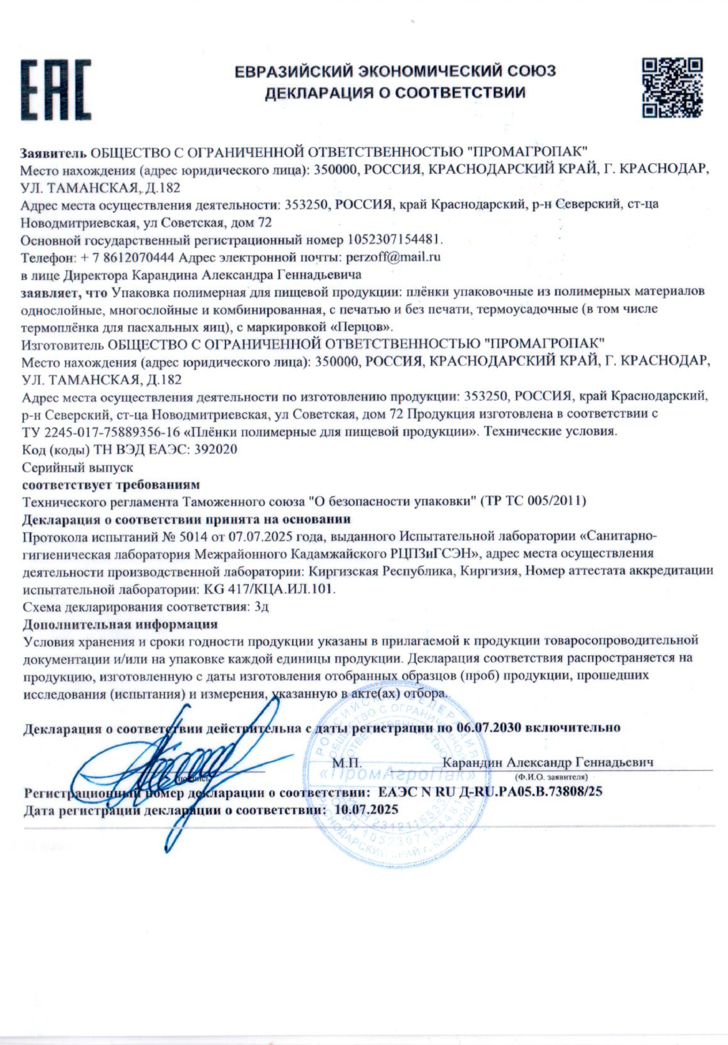 Термоплёнка пасхальная, 5 дизайнов ассорти по 7 штук на пленке, 0649, 0656, 0658, 0665, 0666 Код товара: 592668 29,52 ₽ Купить Производитель:ПЕРЦОВ Превратите обычное яйцо в настоящее пасхальное украшение – быстро, красиво и без лишних усилий с пасхальной термопленкой. Лента из ПВХ длиной 38 см рассчитана на 7 яиц. Поставляется в 5 дизайнах (без возможности выбора). Каждый дизайн уникален: цветочные мотивы, весенние узоры, символы праздника в ярких и нежных тонах. Просто разрежьте дизайны по линии, наденьте термопленку на сваренное охлаждённое яйцо, затем окуните его в кипяток на 5–10 секунд. Под воздействием тепла плёнка плотно обтянет яйцо, идеально принимая его форму. Готовые яйца станут изюминкой праздничного стола, отличным подарком или элементом декора для пасхальной корзины и фотозоны. В верхней части каждой ленты – круглое отверстие диаметром 5 мм.Производство: РоссияТип товара: термоплёнка пасхальнаяМатериал: ПВХРазмер: 38х7 смКоличество в комплекте: 1 шт.Дизайн: Пасхальные традицииВес: 3 грРазмер упаковки: 0.1 × 39.4 × 6.9 смПромежуточная упаковка: 50 штТранспортная упаковка: 1600 штШтрих-код: 4631140442670 Файлы Сертификат-1.jpg Сертификат-2.jpg Сертификат-3.jpg