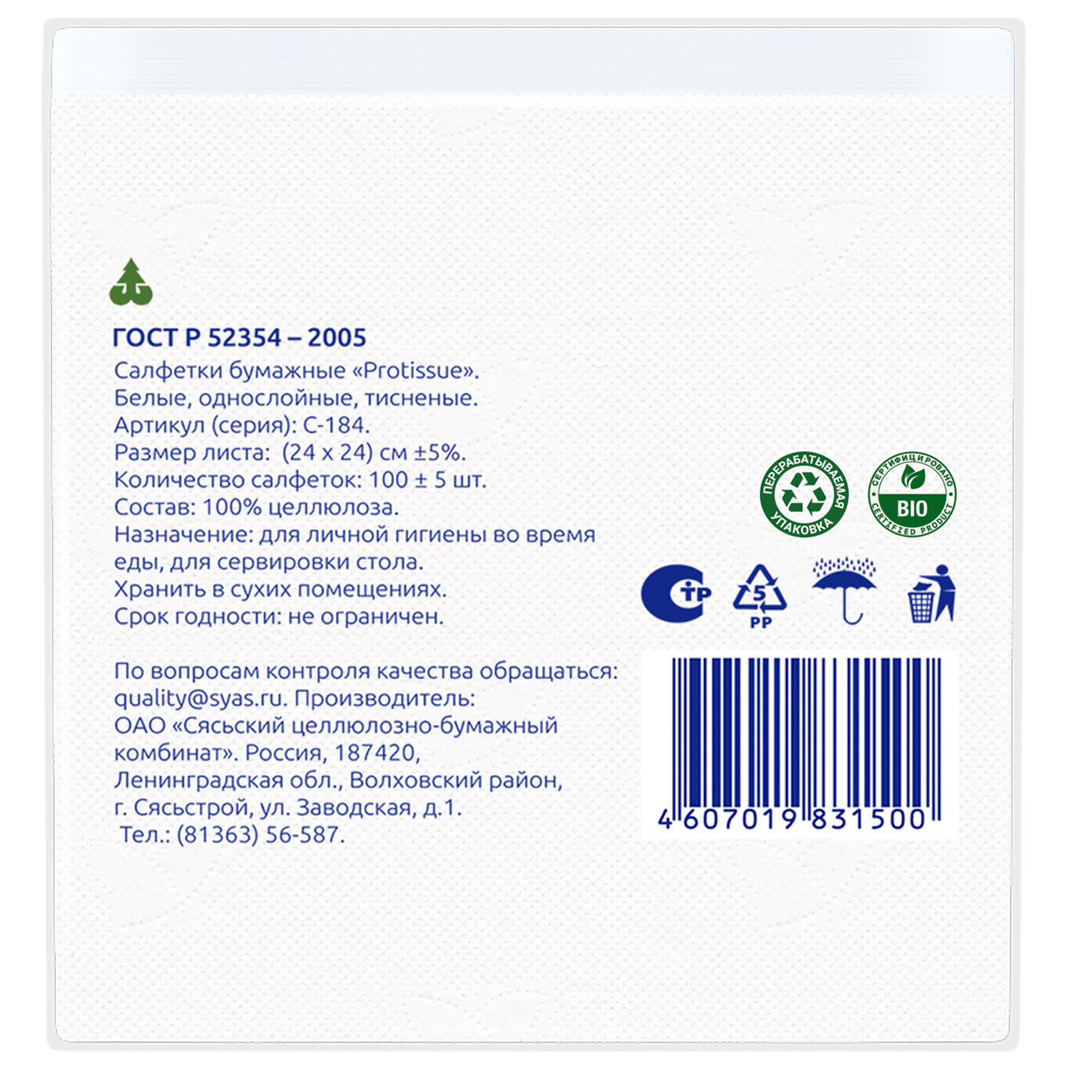 Салфетки бумажные 100 шт., 24х24 см, PROtissue COMFORT, белые, 100% целлюлоза Код товара: 118805 48,07 ₽ Купить Производитель:PROtissue Однослойные салфетки PROtissue стандартного размера сочетают в себе все необходимые характеристики для деликатного очищения. Размер салфетки – 24х24 см. Комплект – 100 шт. Безопасность бумажной продукции подтверждена сертификатом соответствия требованиям биологической безопасности.Производство: РоссияКоличество в комплекте: 100 шт.Длина: 24 смШирина: 24 смКоличество слоев: 1Форма салфетки: квадратнаяСложение салфетки: 1/4Серия: ComfortТиснение: даМатериал: 100% целлюлозаДоля вторичного сырья: 0 %Цвет: белыйВес: 101 грРазмер упаковки: 10.5 × 12.4 × 11.8 смОбъём: 0.0015 м3Промежуточная упаковка: 40 штТранспортная упаковка: 40 штШтрих-код: 4607019831500 Файлы Приложение-1.pdf Сертификат-1.jpg Сертификат-2.jpg