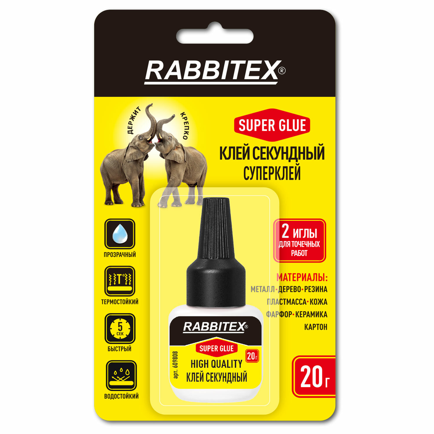 Клей секундный "HQ" суперклей УЛЬТРАПРОЧНЫЙ, 2 иглы для точечных работ, 20 г, RABBITEX (РАББИТЕКС) "ДВА СЛОНА" Код товара: 609808 154,05 ₽ Купить Производитель:RABBITEX Клей-секундный RABBITEX – это профессиональное качество и прочное решение любых бытовых и профессиональных задач. Идеальный помощник в доме, на даче, в мастерской или офисе. Клей секундный RABBITEX – это мгновенная прочность, качество и долговечность. Идеально подходит для ремонта пластика, керамики, дерева, металла, кожи и других материалов. Не применяется для посуды, контактирующей с пищей! Состав на основе высококачественного этилцианоакрилата обеспечивает молниеносное схватывание всего за 5 секунд. После высыхания образует прочное, прозрачное и влагостойкое соединение, устойчивое к механическим нагрузкам и температурным перепадам. 2 иглы для точечных работ в комплекте обеспечат максимально аккуратное нанесение клея на любые поверхности. Преимущества: - прозрачность, - влагостойкость, - термостойкость, - мгновенная фиксация, - широкий спектр применения, - ультрапрочность. Время схватывания: 5 секунд. Температурный диапазон эксплуатации: от -30 до + 80 °С. Вес нетто: 20 г.Производство: КитайНазначение: универсальныйВид: суперклейФорма выпуска: клейВремя схватывания: 0.08 минутВес/объем: 20 г/млМногоразовое применение: даВодостойкий: даСклеивает: войлок, дерево, картон, керамика, кожа, металл, оргстекло, пластик, резина, стекло, фарфор, фибергласСпециальный колпачок позволяет использовать клей многократно: даЦвет клея: прозрачныйСерия: ДВА СЛОНАУпаковка: блистер с европодвесомСрок годности: 48 месВес: 76 грРазмер упаковки: 2.8 × 17.4 × 10.5 смОбъём: 0.0009 м3Промежуточная упаковка: 12 штТранспортная упаковка: 144 штШтрих-код: 4606224458151 Файлы Сертификат-1.jpg Сертификат-2.jpg Сертификат-3.jpg Сертификат-4.jpg Сертификат-5.jpg Сертификат-6.jpg Сертификат-7.jpg Сертификат-8.jpg Сертификат-9.jpg Сертификат-10.jpg Сертификат-11.jpg Сертификат-12.jpg Сертификат-13.jpg Сертификат-14.jpg Сертификат-15.jpg Сертификат-16.jpg Сертификат-17.jpg Сертификат-18.jpg Сертификат-19.jpg Сертификат-20.jpg Сертификат-21.jpg Сертификат-22.jpg Сертификат-23.jpg Сертификат-24.jpg Сертификат-25.jpg Сертификат-26.jpg Сертификат-27.jpg