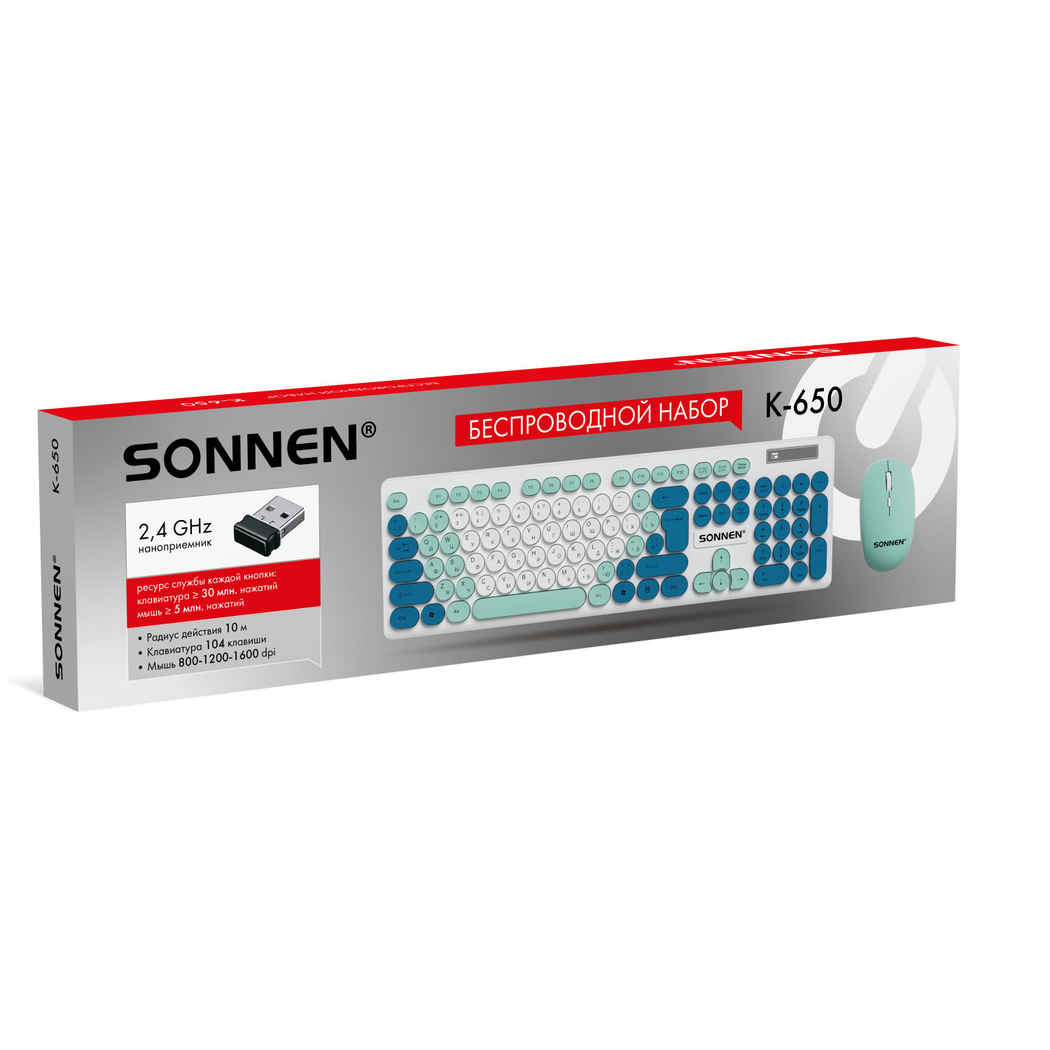 Набор беспроводной тихий: клавиатура 104 клавиши, мышь 4 кнопки 800/1200/1600 dpi, SONNEN K-650, белый / мятный / бирюзовый Код товара: 513953 1 237,16 ₽ Купить Производитель:SONNEN SONNEN K-650 – классический стильный комплект, сочетающий в себе функциональность, долговечность и исключительное удобство в работе. Внимание! Адаптер находится в отсеке для батареек клавиатуры! Беспроводное подключение: радиус действия – до 10 метров от компьютера или ноутбука. Клавиатура мембранного типа. Размер – 435,5х133х22 мм. Клавиатура имеет 104 основные клавиши. Также в комплект входит беспроводная мышь: 4 кнопки, разрешение сенсора (меняется с помощью дополнительной кнопки) – 800-1200-1600 dpi. Размеры – 60,2x32,5x110 мм. Питание клавиатуры – 1 батарея АА, мыши – 1 батарея АА (в комплект не входят!). Клавиатура и мышь выполнены в оригинальном дизайне. Цвет – белый / мятный / бирюзовый.Производство: КитайБеспроводное подключение: даРазъем клавиатуры и мыши: USBКоличество клавиш клавиатуры: 104Количество кнопок мыши: 4Технология сенсора мыши: оптическаяМаксимальное разрешение курсора: 1600 dpiРадиус действия: 10 мТип клавиатуры: мембраннаяЦвет: белый/мятный/бирюзовыйПитание клавиатуры: 1 батарея ААПитание мыши: 1 батарея ААШирина клавиатуры: 435.5 ммГлубина клавиатуры: 133 ммВысота клавиатуры: 22 ммСерия: K-650Вес клавиатуры: 368 гДлина мыши: 110 ммШирина мыши: 60.2 ммВысота мыши: 32.5 ммВес мыши: 52.4 гВес: 579 грРазмер упаковки: 4.7 × 51.4 × 14.1 смОбъём: 0.0037 м3Промежуточная упаковка: 20 штТранспортная упаковка: 20 штШтрих-код: 4606224458090 Файлы Сертификат-1.jpg Сертификат-2.jpg