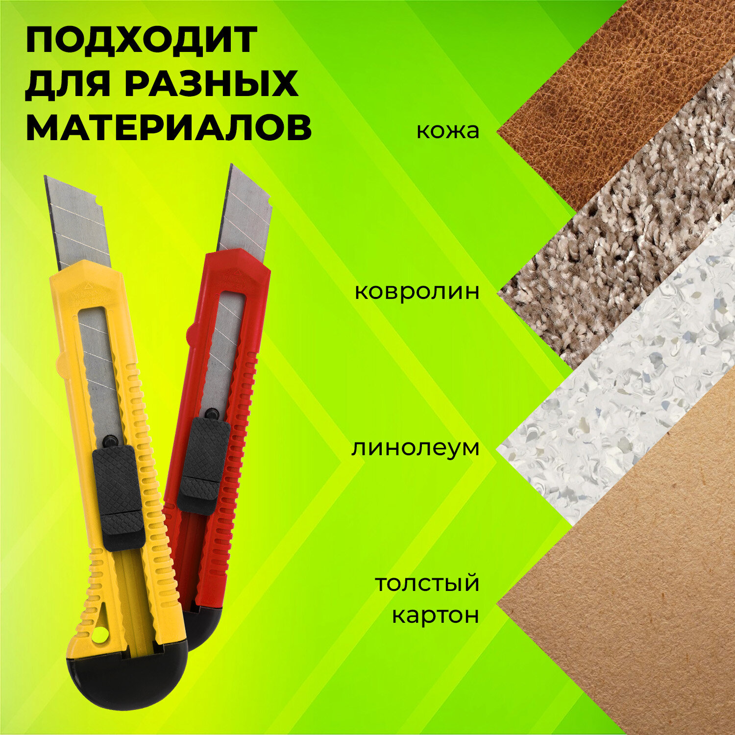 Нож канцелярский 18 мм КОМПЛЕКТ "10 шт. + 3 шт. В ПОДАРОК", фиксатор, STAFF EVERYDAY Код товара: 238771 339,07 ₽ Купить Производитель:STAFF Канцелярский нож STAFF относится к категории товаров, которые должны быть в каждом офисе и доме. С этой классической моделью можно ускорить процесс резки бумаги, картона и других материалов, сохраняя при этом максимальную аккуратность среза. Острые лезвия шириной 18 мм из высокопрочной стали в надежном пластиковом корпусе со специальной защелкой. Защелка позволяет фиксировать лезвие в нужном положение и регулировать длину ножа. Если лезвие затупилось, достаточно выдвинуть часть, пришедшую в негодность, и обломать ее по наклонной черте, нанесенной на поверхности ножа. Имеется отверстие для подвеса. Поставляется в нескольких вариантах цвета (без возможности выбора).Производство: КитайШирина лезвия: 18 ммКоличество ножей в комплекте: 13 шт.Тип механизма фиксации: защелкаМатериал корпуса: пластикСерия: EVERYDAYОтверстие для подвеса: даЦвет корпуса: ассортиУпаковка: картонная коробкаВес: 402 грРазмер упаковки: 6.4 × 17.1 × 11.5 смОбъём: 0.0016 м3Промежуточная упаковка: 12 штТранспортная упаковка: 48 штШтрих-код: 4606224459622 Файлы Сертификат-1.jpg Сертификат-2.jpg Сертификат-3.jpg Сертификат-4.jpg Сертификат-5.jpg Сертификат-6.jpg Сертификат-7.jpg Сертификат-8.jpg Сертификат-9.jpg Сертификат-10.jpg Сертификат-11.jpg Сертификат-12.jpg Сертификат-13.jpg Сертификат-14.jpg Сертификат-15.jpg Сертификат-16.jpg Сертификат-17.jpg Сертификат-18.jpg Сертификат-19.jpg Сертификат-20.jpg Сертификат-21.jpg Сертификат-22.jpg Сертификат-23.jpg Сертификат-24.jpg Сертификат-25.jpg Сертификат-26.jpg