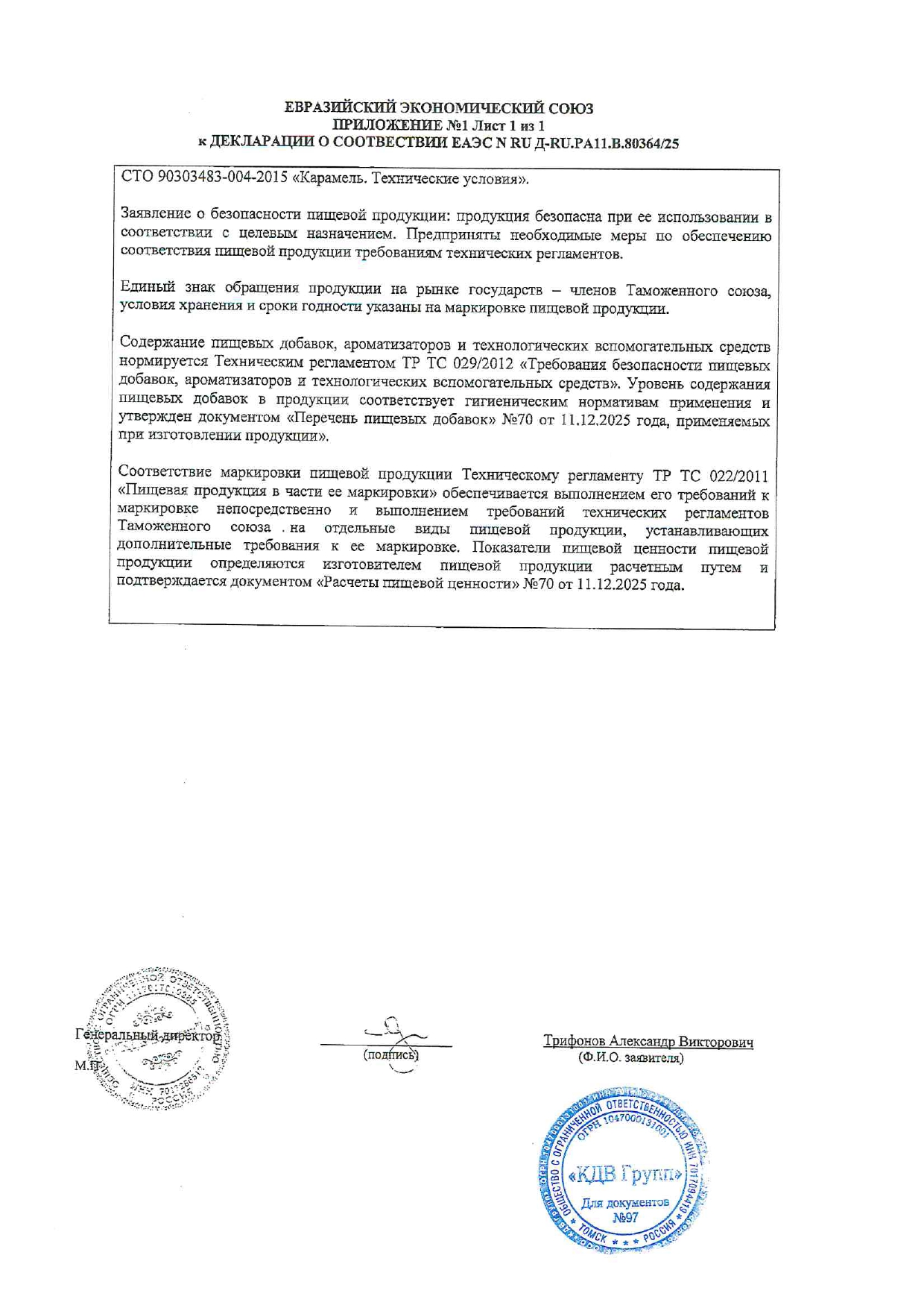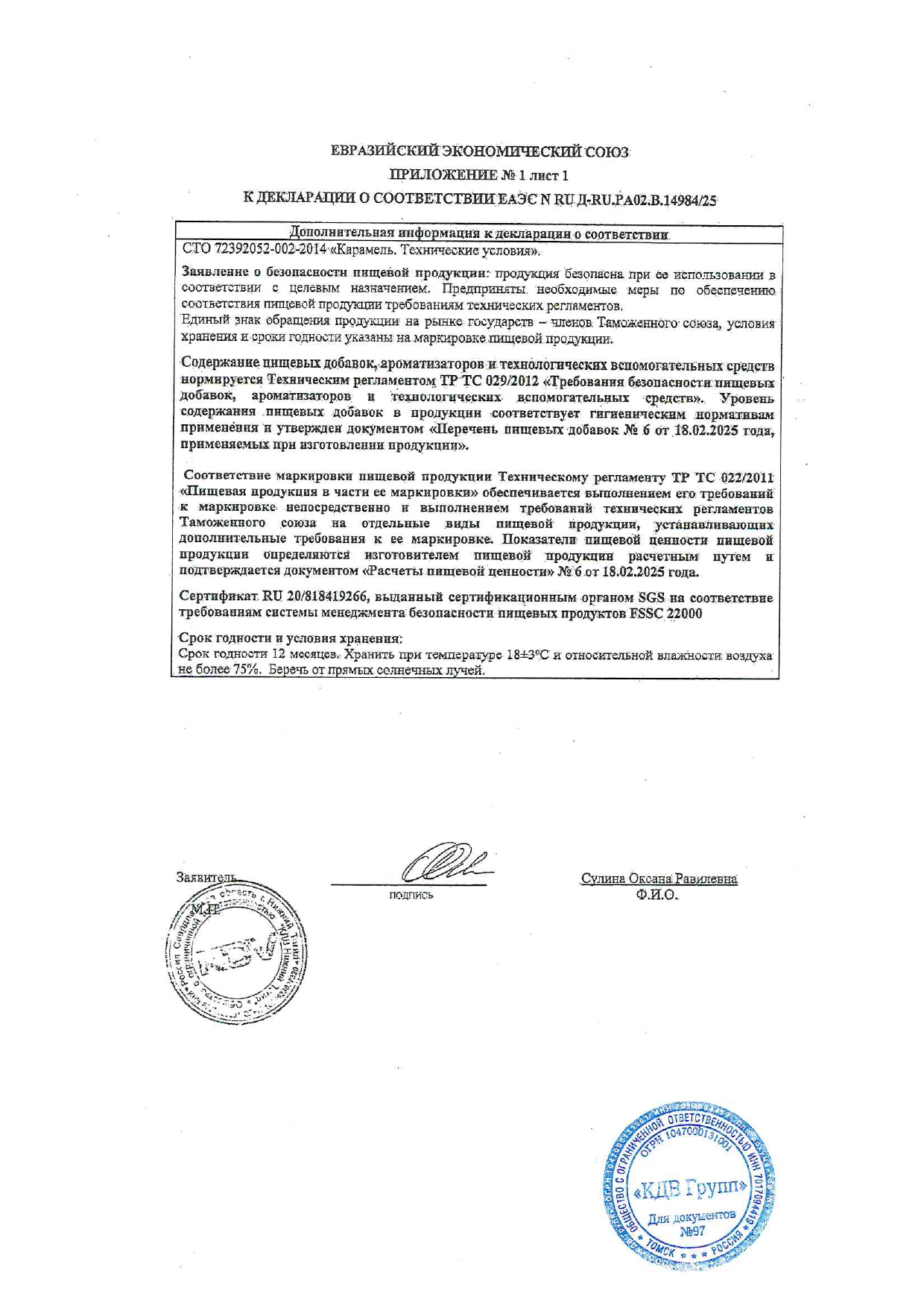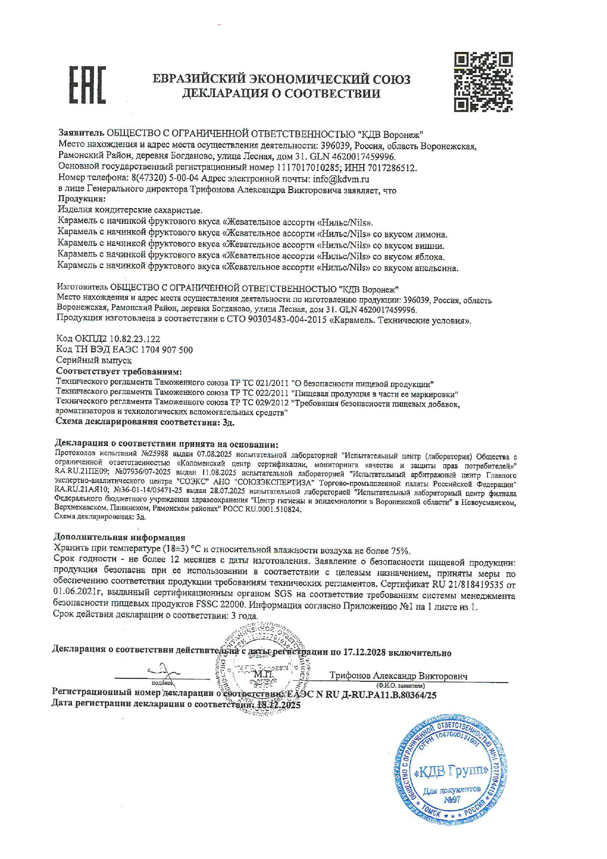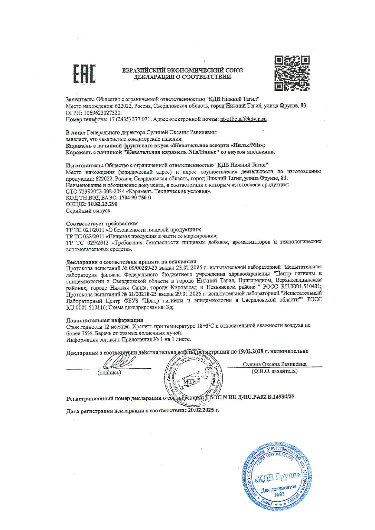 Карамель жевательная ЯШКИНО "Нильс", ассорти (вишня, апельсин, яблоко), 500 г Код товара: 622130 234,29 ₽ Купить Производитель:ЯШКИНО Ассорти из мягкой жевательной карамели со вкусами вишни, яблока и апельсина. Жевательная карамель «Нильс» – уникальный продукт, не имеющий аналогов в России. Особенность конфеты – щелчок, который ощущается при раскусывании. В составе нет искусственных красителей. Начинка карамели из натуральных соков.Энергетическая ценность на 100 г: Белки - 0 г Жиры - 4.83 г Углеводы - 81.08 г Калории - 390 ккалСтандарт - СТО 72392052-002-2014Состав: Сахар, патока, масло пальмовое рафинированное дезодорированное, крахмал кукурузный, стабилизатор: гуммиарабик; влагоудерживающий агент: сорбитовый сироп; регуляторы кислотности: кислота молочная, кислота лимонная; влагоудерживающий агент: лактат натрия; желирующий агент: пектин; сок концентрированный из яблока, ароматизаторы, эмульгатор: лецитин соевый; красители: паприка "Оранжевый", медные комплексы хлорофиллинов, куркумин; концентрированный сок фиолетовой моркови. Содержит сорбитовый сироп. При чрезмерном употреблении может оказывать слабительное действие. Может содержать диоксид серы, следы глютена, яиц, молока, арахиса, орехов и продуктов их переработки.Производство: РоссияТип товара: карамель жевательнаяВес нетто: 500 гВесовые: даВкус: ассортиФормат: карамель леденцоваяУпаковка: флоу-пакСоответствует требованиям ГОСТа: СТО 72392052-002-2014Срок годности: 12 мес.Фирма-производитель: КДВ-группСрок годности: 12 месВес: 549 грРазмер упаковки: 5.6 × 18.5 × 18.5 смОбъём: 0.0017 м3Промежуточная упаковка: 10 штТранспортная упаковка: 10 штШтрих-код: 4607109844793 Файлы Сертификат-1.jpg Сертификат-2.jpg Сертификат-3.jpg Сертификат-4.jpg Сертификат-5.jpg Сертификат-6.jpg