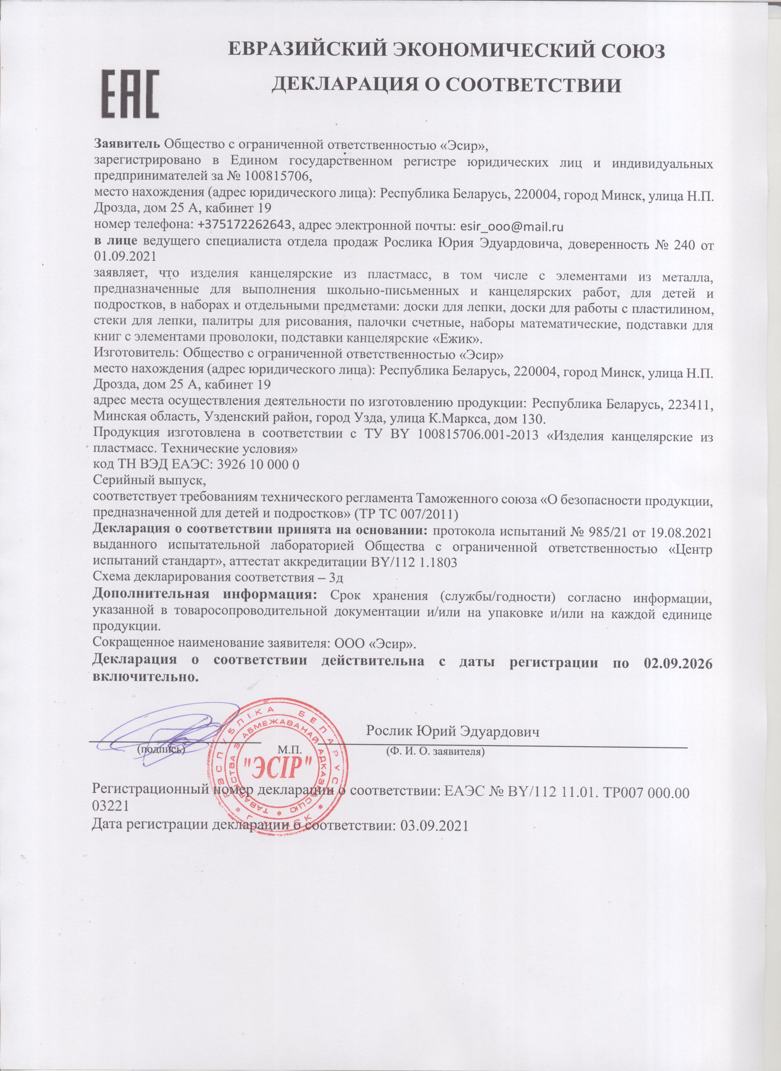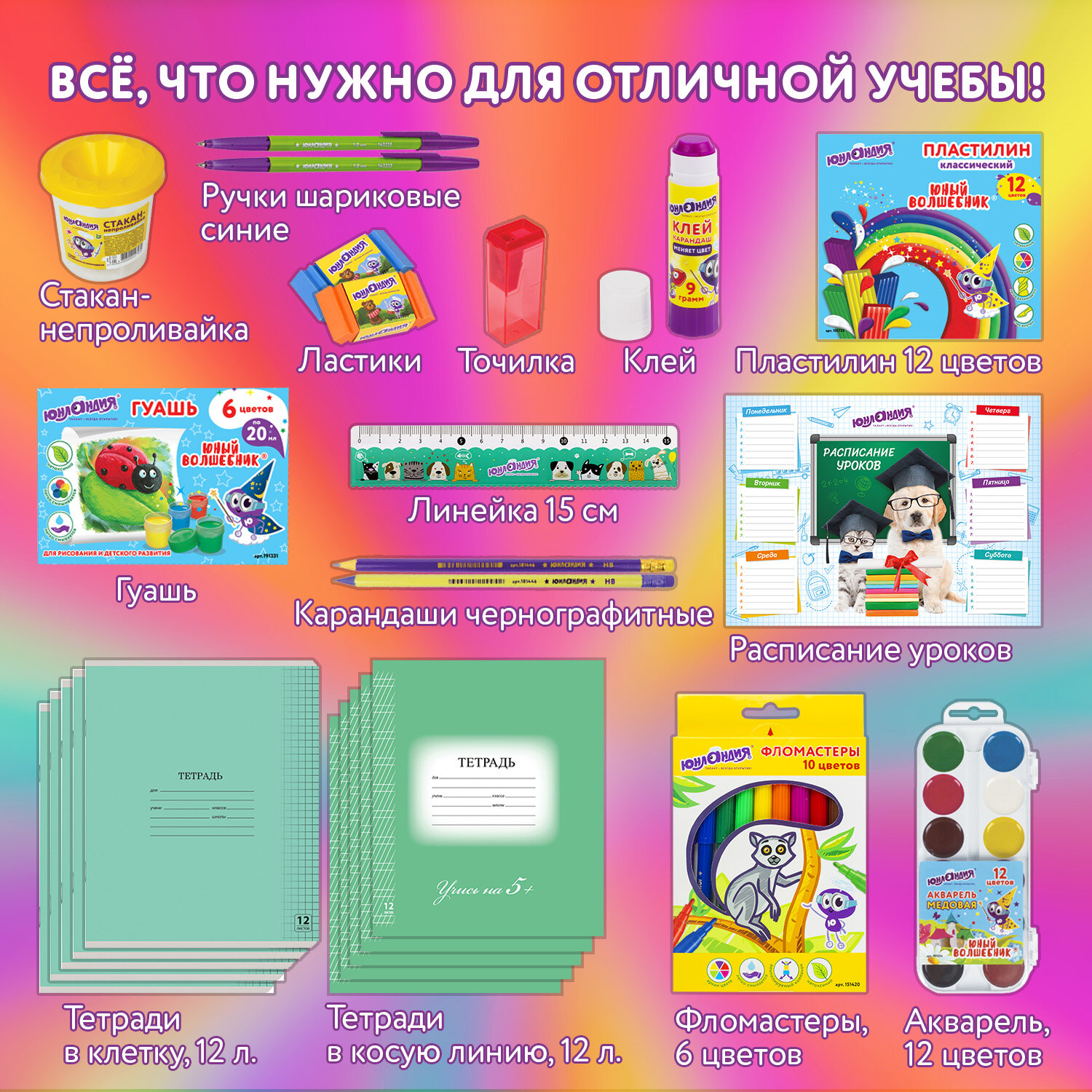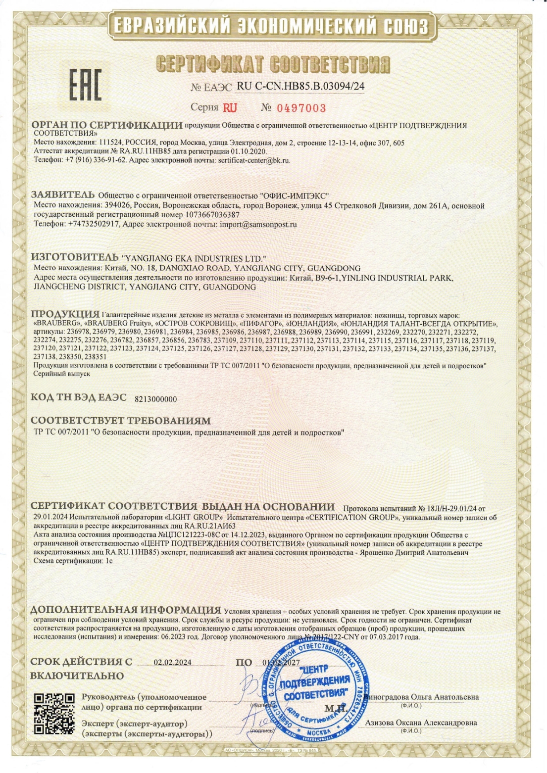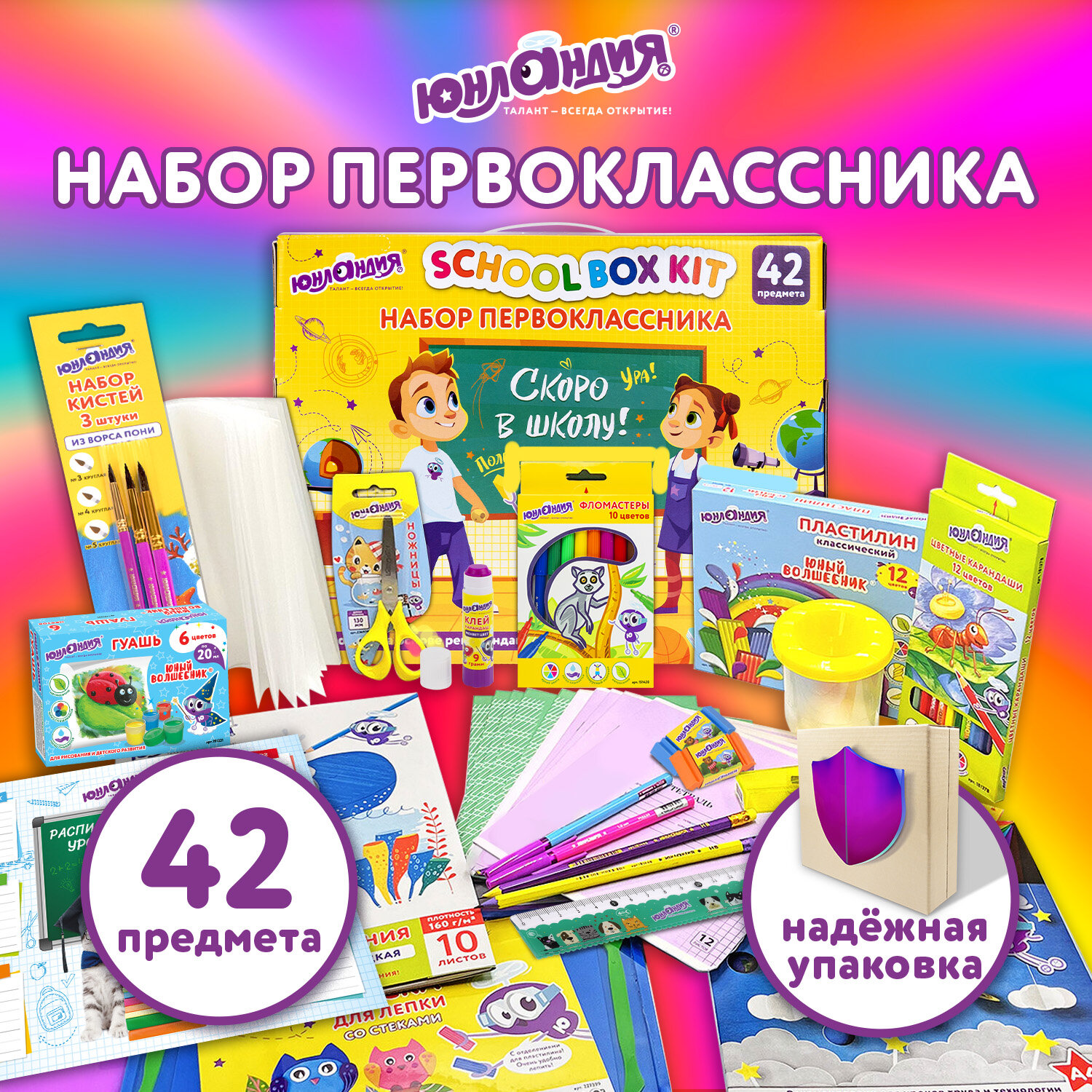 Набор школьных принадлежностей в подарочной коробке ЮНЛАНДИЯ "НАБОР ПЕРВОКЛАССНИКА", 42 предмета Код товара: 880118 1 351,46 ₽ Купить Производитель:ЮНЛАНДИЯ Набор канцелярских принадлежностей ЮНЛАНДИЯ "ПЕРВОКЛАССНИК" для выпускников детского сада и первоклассников в красочной упаковке. Скомплектован на основе рекомендаций учителей начальных классов. Все самые необходимые школьные принадлежности упакованы в удобный чемоданчик с ручкой. Состав набора: - краски акварельные 12 цветов – 1 шт.; - гуашь – 1 шт.; - бумага для рисования 10 л., А4 – 1 шт.; - набор цветного картона и бумаги 8+8 цветов – 1 шт.; - доска для лепки – 1 шт.; - карандаши чернографитные – 2 шт.; - карандаши цветные 12 цветов – 1 шт.; - клей-карандаш – 1 шт.; - ластик – 2 шт.; - линейка 15 см – 1 шт.; - ножницы – 1 шт.; - пластилин 12 цветов – 1 шт.; - ручки шариковые синие – 2 шт.; - тетрадь в клетку 12 л. – 5 шт.; - тетрадь в косую линию 12 л. – 5 шт.; - точилка – 1 шт.; - фломастеры 6 цветов – 1 шт.; - набор кистей из 3 шт. – 1 шт.; - стакан-непроливайка – 1 шт.; - обложки для тетрадей и дневников – 10 шт.; - папка-конверт с кнопкой А4 – 1 шт.; - расписание уроков – 1 шт; - короб подарочный – 1 шт. Набор представляет собой подарочную коробку-чемоданчик из плотного картона с красочным дизайном и наполнением. Короб дополнительно упакован в термоусадку. Состав набора разработан на основе рекомендаций учителей и пожеланий родителей таким образом, чтобы обеспечить юного ученика всем необходимым. В состав набора входят только высококачественные сертифицированные отечественные и импортные школьные принадлежности, соответствующие требованиям безопасности детских товаров законодательства РФ.Производство: РоссияТип товара: набор первоклассникаКоличество предметов: 42 шт.Пол ребенка: универсальныйДлина: 33.7 смШирина: 25.7 смГлубина: 7.9 смМатериал упаковки: микрогофрокартонПодарочная упаковка: даСрок годности: 36 месВес: 2,23 кгРазмер упаковки: 10.2 × 34.7 × 29 смОбъём: 0.0121 м3Промежуточная упаковка: 4 штТранспортная упаковка: 4 штШтрих-код: 4606224320472 Файлы Сертификат-1.jpg Сертификат-2.jpg Сертификат-3.jpg Сертификат-4.jpg Сертификат-5.jpg Сертификат-6.jpg Сертификат-7.jpg Сертификат-8.jpg Сертификат-9.jpg Сертификат-10.jpg Сертификат-11.jpg Сертификат-12.jpg Сертификат-13.jpg Сертификат-14.jpg Сертификат-15.jpg Сертификат-16.jpg Сертификат-17.jpg Сертификат-18.jpg Сертификат-19.jpg Сертификат-20.jpg Сертификат-21.jpg Сертификат-22.jpg Сертификат-23.jpg Сертификат-24.jpg Сертификат-25.jpg Сертификат-26.jpg Сертификат-27.jpg Сертификат-28.jpg Сертификат-29.jpg Сертификат-30.jpg Сертификат-31.jpg Сертификат-32.jpg Сертификат-33.jpg Сертификат-34.jpg Сертификат-35.jpg Сертификат-36.jpg Сертификат-37.jpg