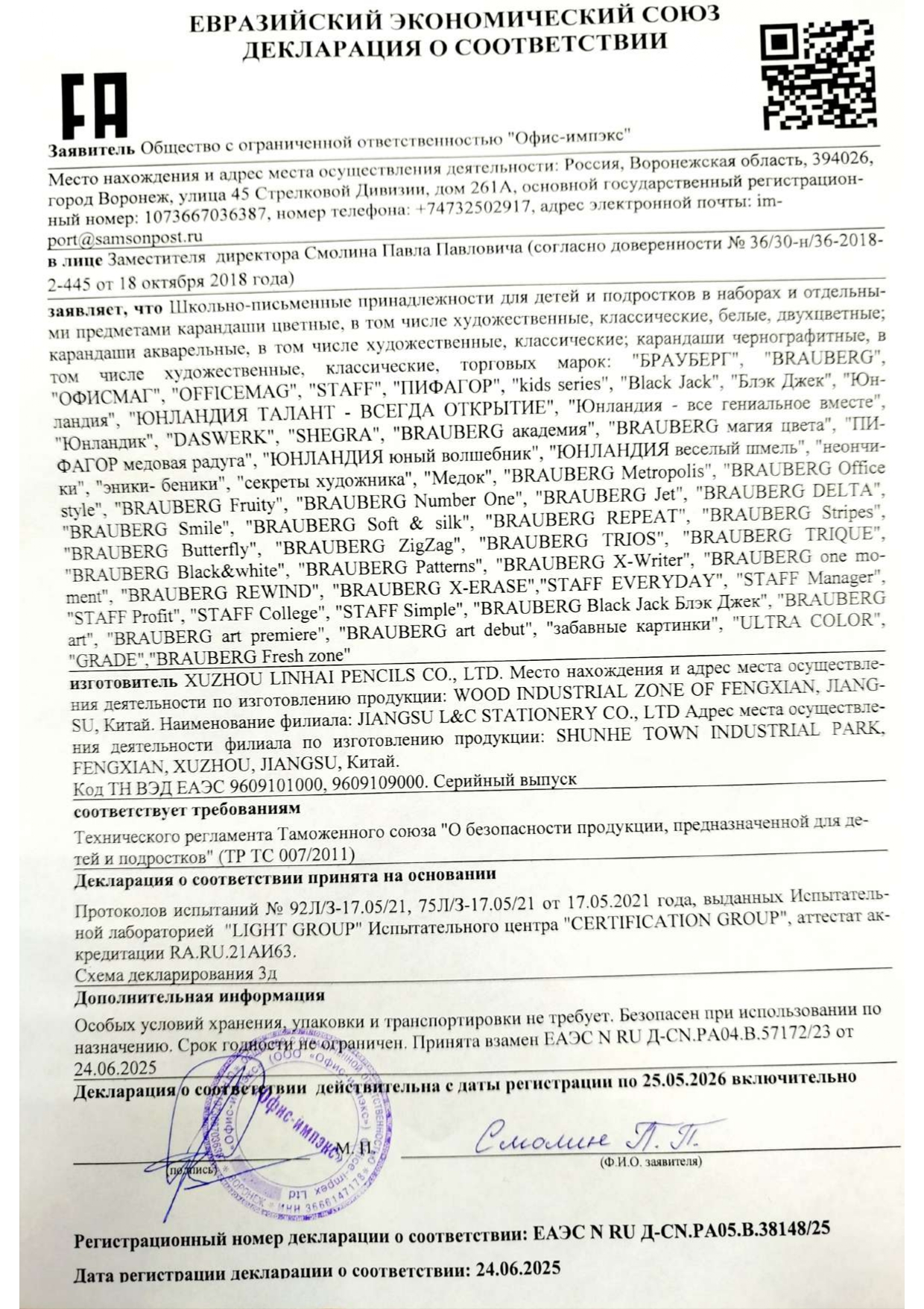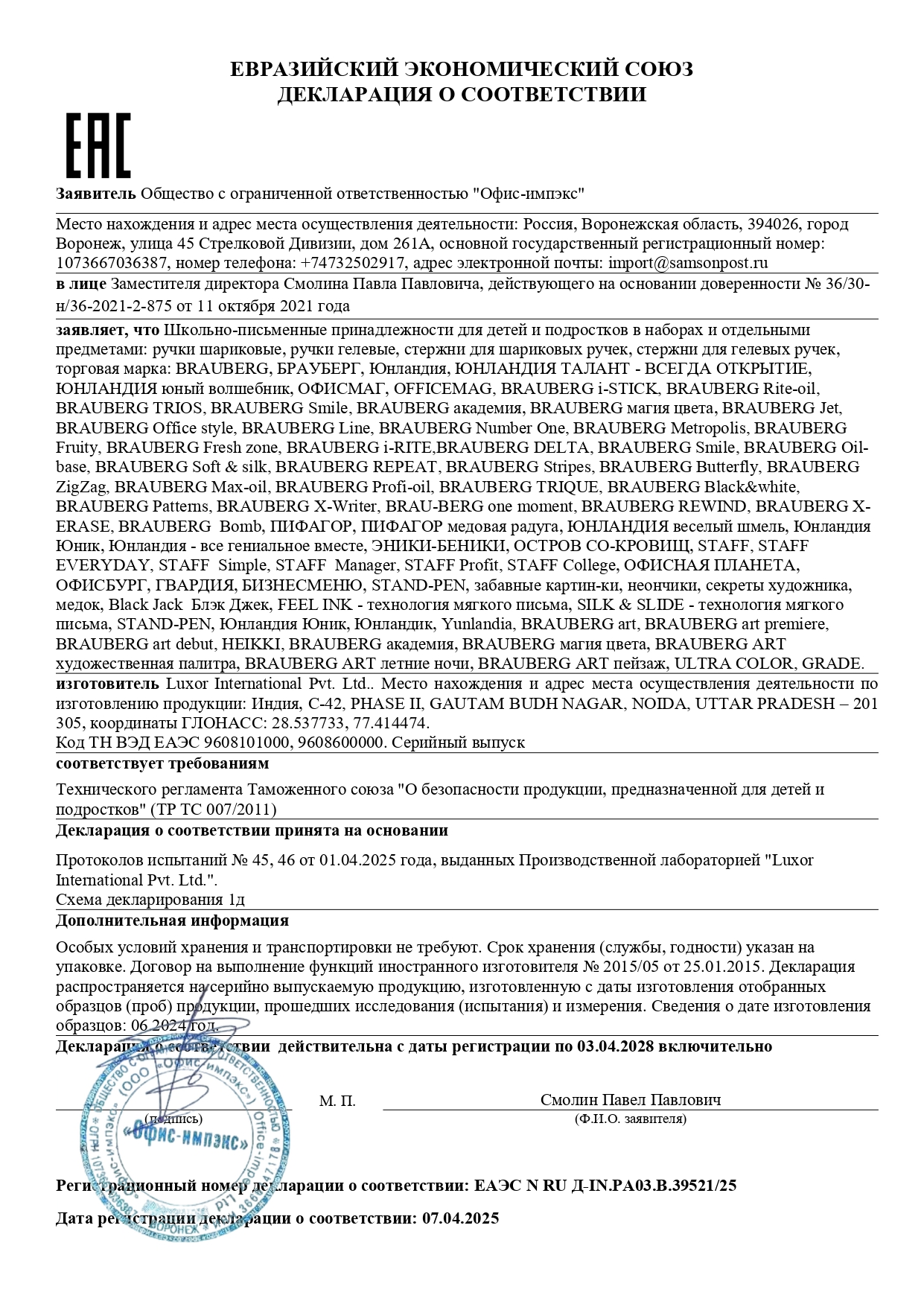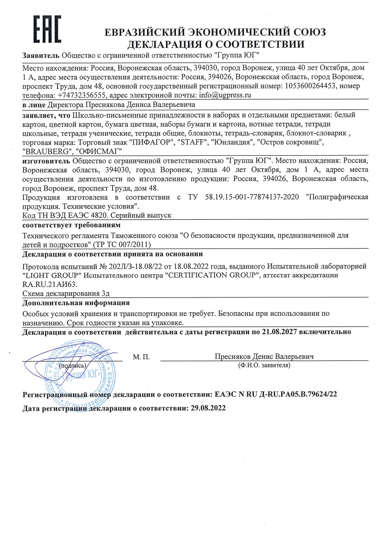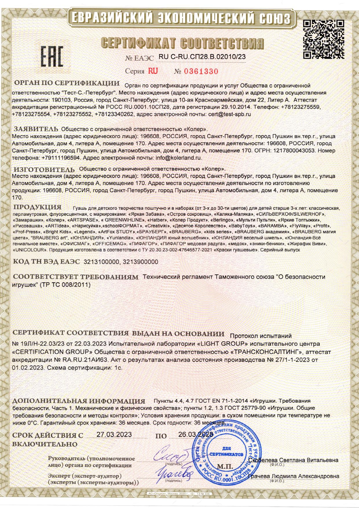 Набор школьных принадлежностей в подарочной коробке ЮНЛАНДИЯ "НАБОР ПЕРВОКЛАССНИКА", 42 предмета Код товара: 880118 1 351,46 ₽ Купить Производитель:ЮНЛАНДИЯ Набор канцелярских принадлежностей ЮНЛАНДИЯ "ПЕРВОКЛАССНИК" для выпускников детского сада и первоклассников в красочной упаковке. Скомплектован на основе рекомендаций учителей начальных классов. Все самые необходимые школьные принадлежности упакованы в удобный чемоданчик с ручкой. Состав набора: - краски акварельные 12 цветов – 1 шт.; - гуашь – 1 шт.; - бумага для рисования 10 л., А4 – 1 шт.; - набор цветного картона и бумаги 8+8 цветов – 1 шт.; - доска для лепки – 1 шт.; - карандаши чернографитные – 2 шт.; - карандаши цветные 12 цветов – 1 шт.; - клей-карандаш – 1 шт.; - ластик – 2 шт.; - линейка 15 см – 1 шт.; - ножницы – 1 шт.; - пластилин 12 цветов – 1 шт.; - ручки шариковые синие – 2 шт.; - тетрадь в клетку 12 л. – 5 шт.; - тетрадь в косую линию 12 л. – 5 шт.; - точилка – 1 шт.; - фломастеры 6 цветов – 1 шт.; - набор кистей из 3 шт. – 1 шт.; - стакан-непроливайка – 1 шт.; - обложки для тетрадей и дневников – 10 шт.; - папка-конверт с кнопкой А4 – 1 шт.; - расписание уроков – 1 шт; - короб подарочный – 1 шт. Набор представляет собой подарочную коробку-чемоданчик из плотного картона с красочным дизайном и наполнением. Короб дополнительно упакован в термоусадку. Состав набора разработан на основе рекомендаций учителей и пожеланий родителей таким образом, чтобы обеспечить юного ученика всем необходимым. В состав набора входят только высококачественные сертифицированные отечественные и импортные школьные принадлежности, соответствующие требованиям безопасности детских товаров законодательства РФ.Производство: РоссияТип товара: набор первоклассникаКоличество предметов: 42 шт.Пол ребенка: универсальныйДлина: 33.7 смШирина: 25.7 смГлубина: 7.9 смМатериал упаковки: микрогофрокартонПодарочная упаковка: даСрок годности: 36 месВес: 2,23 кгРазмер упаковки: 10.2 × 34.7 × 29 смОбъём: 0.0121 м3Промежуточная упаковка: 4 штТранспортная упаковка: 4 штШтрих-код: 4606224320472 Файлы Сертификат-1.jpg Сертификат-2.jpg Сертификат-3.jpg Сертификат-4.jpg Сертификат-5.jpg Сертификат-6.jpg Сертификат-7.jpg Сертификат-8.jpg Сертификат-9.jpg Сертификат-10.jpg Сертификат-11.jpg Сертификат-12.jpg Сертификат-13.jpg Сертификат-14.jpg Сертификат-15.jpg Сертификат-16.jpg Сертификат-17.jpg Сертификат-18.jpg Сертификат-19.jpg Сертификат-20.jpg Сертификат-21.jpg Сертификат-22.jpg Сертификат-23.jpg Сертификат-24.jpg Сертификат-25.jpg Сертификат-26.jpg Сертификат-27.jpg Сертификат-28.jpg Сертификат-29.jpg Сертификат-30.jpg Сертификат-31.jpg Сертификат-32.jpg Сертификат-33.jpg Сертификат-34.jpg Сертификат-35.jpg Сертификат-36.jpg Сертификат-37.jpg