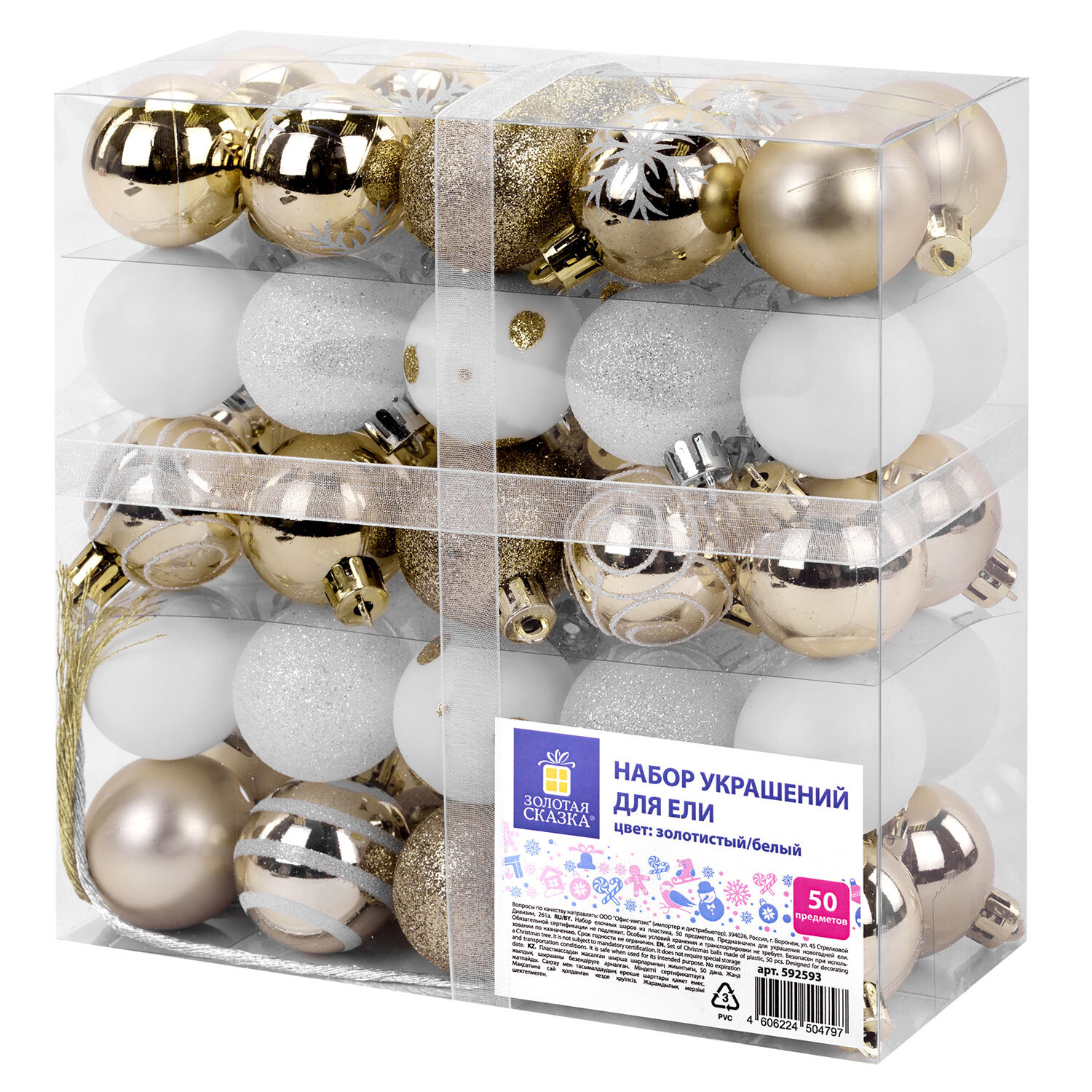 Шары елочные НАБОР 50 предметов "Новогодняя Сказка", пластик, золото/белый, ЗОЛОТАЯ СКАЗКА Код товара: 592593 1 194,29 ₽ Купить Производитель:ЗОЛОТАЯ СКАЗКА Елочные шары – непременный атрибут Нового Года. Они будут отлично смотреться как на зеленой, так и на белой хвое ели. Насыщенные цвета в сочетании с отделкой разной фактуры создадут атмосферу праздника и волшебства. • В наборе: - 4 шара золотистого цвета с матовым эффектом (диаметром 4 см), - 6 шаров золотистого цвета с эффектом глиттер (диаметром 4 см), - 8 шаров золотистого цвета с глянцевым эффектом (диаметром 4 см), - 8 шаров белого цвета с эффектом глиттер ( диаметром 4 см), - 8 шаров белого цвета с матовым эффектом (диаметром 4 см), - 4 шара белого цвета с золотистым рисунком и матовым эффектом (диаметром 4 см), - 12 шаров золотистого цвета с глянцевым эффектом и рисунком (диаметром 4 см). Набор упакован в ПВХ-бокс, дополнительно упакован в индивидуальный трехслойный гофрокороб.Производство: КитайТип украшения: набор украшений для елиКоличество в наборе: 50 шт.Материал: пластикЦвет: белый/золотойВес: 322 грРазмер упаковки: 8.3 × 10.8 × 23.3 смОбъём: 0.0043 м3Промежуточная упаковка: 10 штТранспортная упаковка: 10 штШтрих-код: 4606224504797 Файлы Сертификат-1.jpg Сертификат-2.jpg Сертификат-3.jpg Сертификат-4.jpg Сертификат-5.jpg Сертификат-6.jpg Сертификат-7.jpg Сертификат-8.jpg Сертификат-9.jpg Сертификат-10.jpg Сертификат-11.jpg Сертификат-12.jpg Сертификат-13.jpg Сертификат-14.jpg Сертификат-15.jpg Сертификат-16.jpg Сертификат-17.jpg Сертификат-18.jpg Сертификат-19.jpg Сертификат-20.jpg Сертификат-21.jpg Сертификат-22.jpg Сертификат-23.jpg Сертификат-24.jpg Сертификат-25.jpg Сертификат-26.jpg Сертификат-27.jpg Сертификат-28.jpg