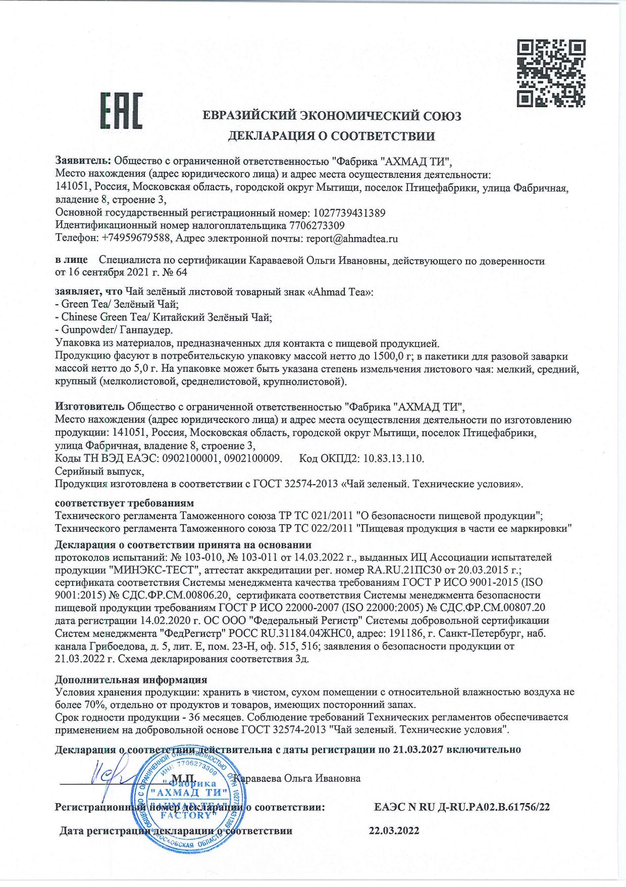 Чай AHMAD "Professional Chinese Green Tea" зеленый, 300 пакетиков в конвертах по 1,8 г Код товара: 622787 1 616,2 ₽ Купить Производитель:AHMAD Прекрасный зеленый чай, обладающий приятными вкусовыми характеристиками и массой полезных качеств. Это легкий, освежающий напиток с едва уловимой горчинкой во вкусе, покоряющий своей невесомостью и чистыми нотками чайного букета. Чай AHMAD "Chinese Green Tea" – это листовой мелкий китайский зеленый чай. Хранить в чистом, сухом помещении при относительной влажности воздуха не более 70%, отдельно от продуктов и товаров, имеющих посторонний запах при температуре от +4 до +30° C.Производство: РоссияВид чая: зеленыйКоличество пакетиков: 300 шт.Аромат: классическийНаличие ярлычка: даНаличие конвертика: даТип пакетика: стандартныйСерия: ProfessionalТип упаковки: картонная упаковкаСрок годности: 36 мес.Фирма-производитель: Ahmad TeaСрок годности: 36 месВес: 1,09 кгРазмер упаковки: 17.2 × 30.5 × 26.2 смОбъём: 0.0137 м3Промежуточная упаковка: 1 штТранспортная упаковка: 1 штШтрих-код: 0005488111565 Сертификат-1.jpg Сертификат-2.jpg Сертификат-3.jpg