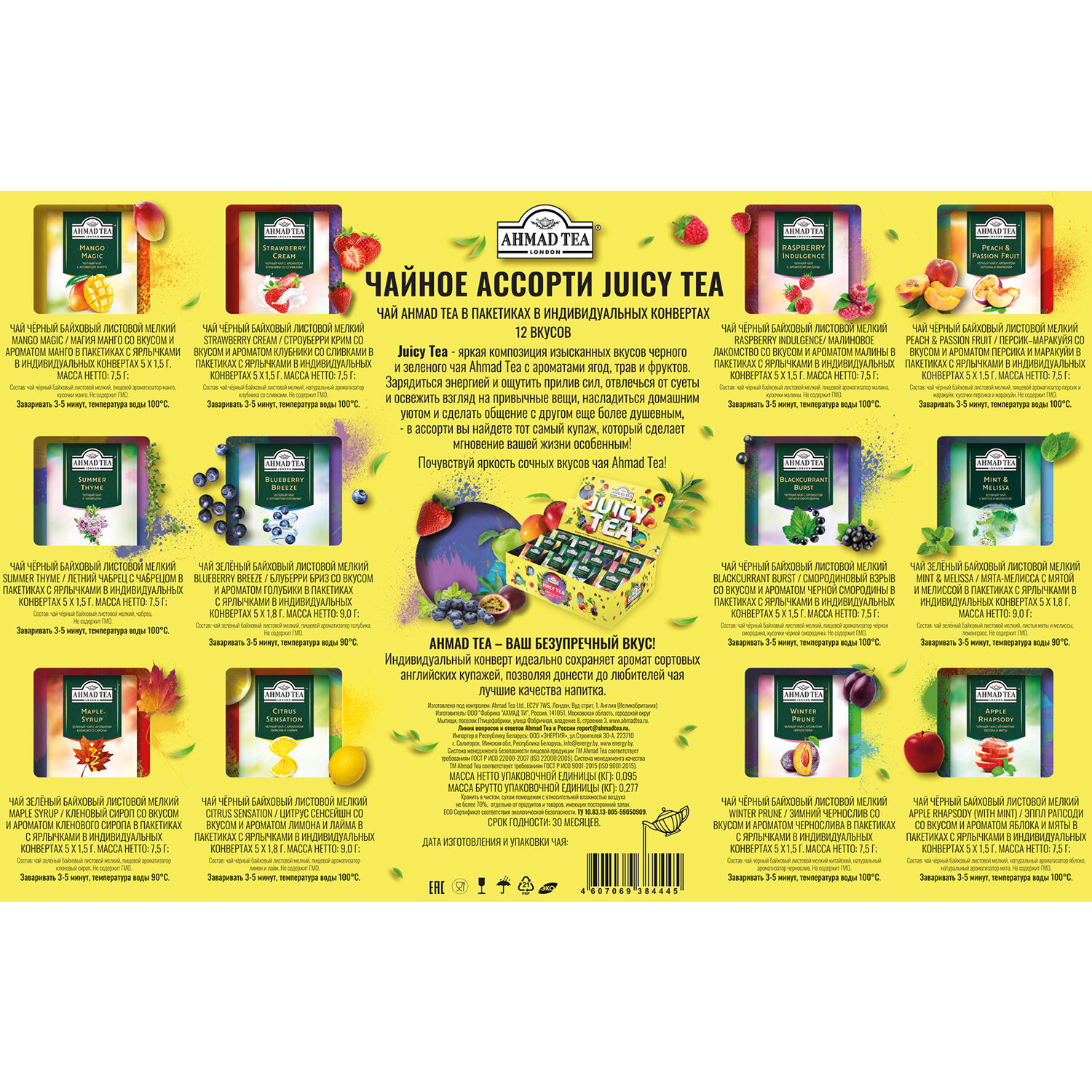Чай AHMAD "Juicy tea" ассорти 12 вкусов, НАБОР 60 пакетиков Код товара: 623511 559,4 ₽ Купить Производитель:AHMAD "Juicy Tea" – яркая композиция изысканных вкусов черного и зеленого чая Ahmad Tea с ароматами ягод, трав и фруктов. В наборе 12 вкусов: Летний чабрец, Зимний чернослив, Персик-маракуйя, Магия манго, Мята-мелисса, Смородиновый взрыв, Малиновое лакомство, Яблочная рапсодия, Клубника со сливками, Цитрус сенсейшн (лимон и лайм), Кленовый сироп, Блуберри бриз (голубика). Условия хранения: хранить в чистом, сухом помещении при относительной влажности воздуха не более 70%, отдельно от продуктов и товаров, имеющих посторонний запах, при температуре от +4 до +30 °С. Продукт не содержит ГМО.Производство: РоссияТип упаковки: картонная коробкаВид чая: ассортиИдеи для подарка: для всехТип чая: пакетированныйМасса нетто: 450 гКоличество пакетиков: 60 шт.Срок годности: 30 мес.Фирма-производитель: Ahmad TeaСрок годности: 30 месВес: 326 грРазмер упаковки: 7.5 × 28 × 18.5 смОбъём: 0.0042 м3Промежуточная упаковка: 10 штТранспортная упаковка: 10 штШтрих-код: 4607069384445 Файлы Сертификат-1.jpg Сертификат-2.jpg Сертификат-3.jpg Сертификат-4.jpg Сертификат-5.jpg