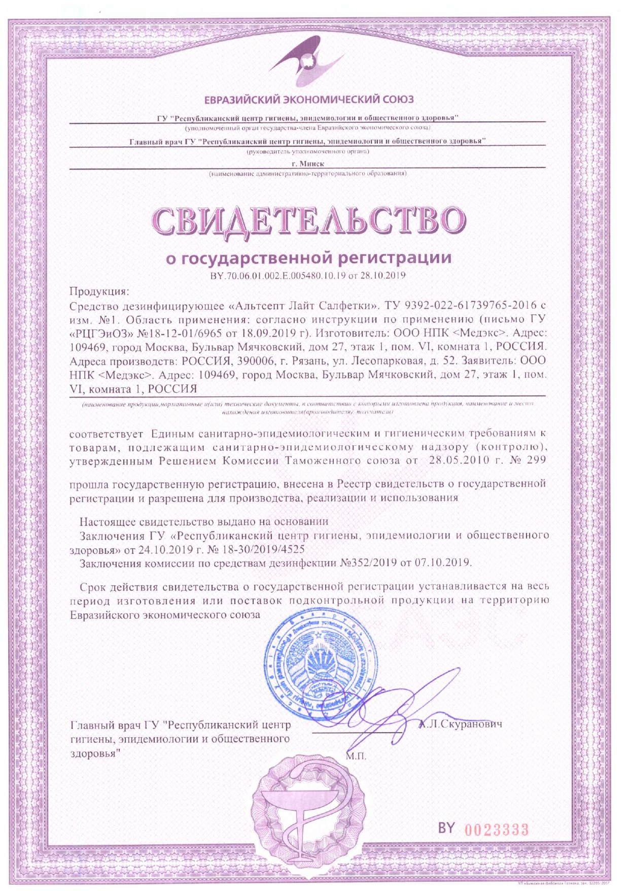 Область применения: в ЛПУ, включая акушерские стационары, в вирусологических и паразитологических лабораториях, противотуберкулезных, патологоанатомических отделениях, ССМП, детских учреждениях, на коммунальных объектах, предприятиях общественного питания, в пенитенциарных учреждениях, учреждениях МО, ГО и МЧС, торговли, образования, культуры, отдыха и спорта, объектов санаторно-курортного хозяйства, фармацевтической промышленности, аптек и других учреждений
