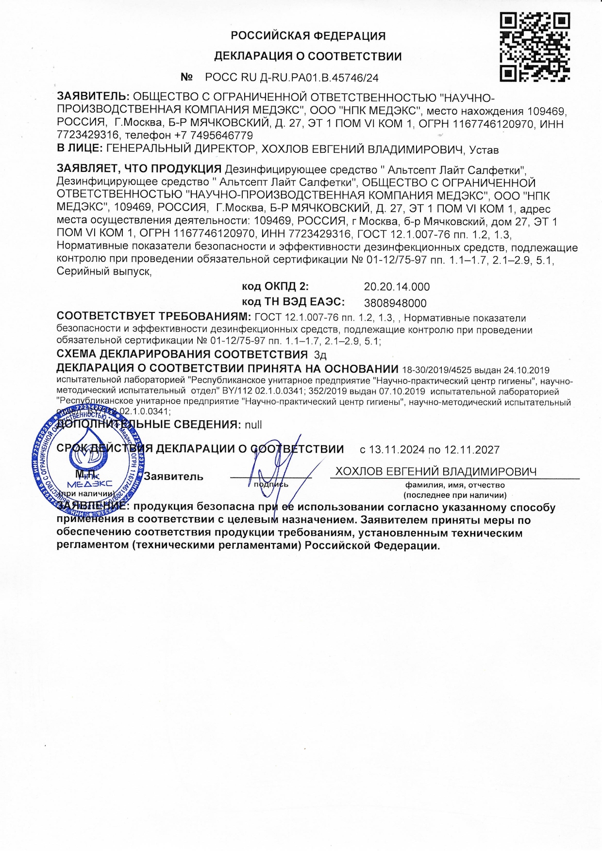 Состав: Пропиточный состав салфеток содержит изопропиловый спирт 25-27%, синергетические функциональные добавки (ЧАС, амин, гуанидин).