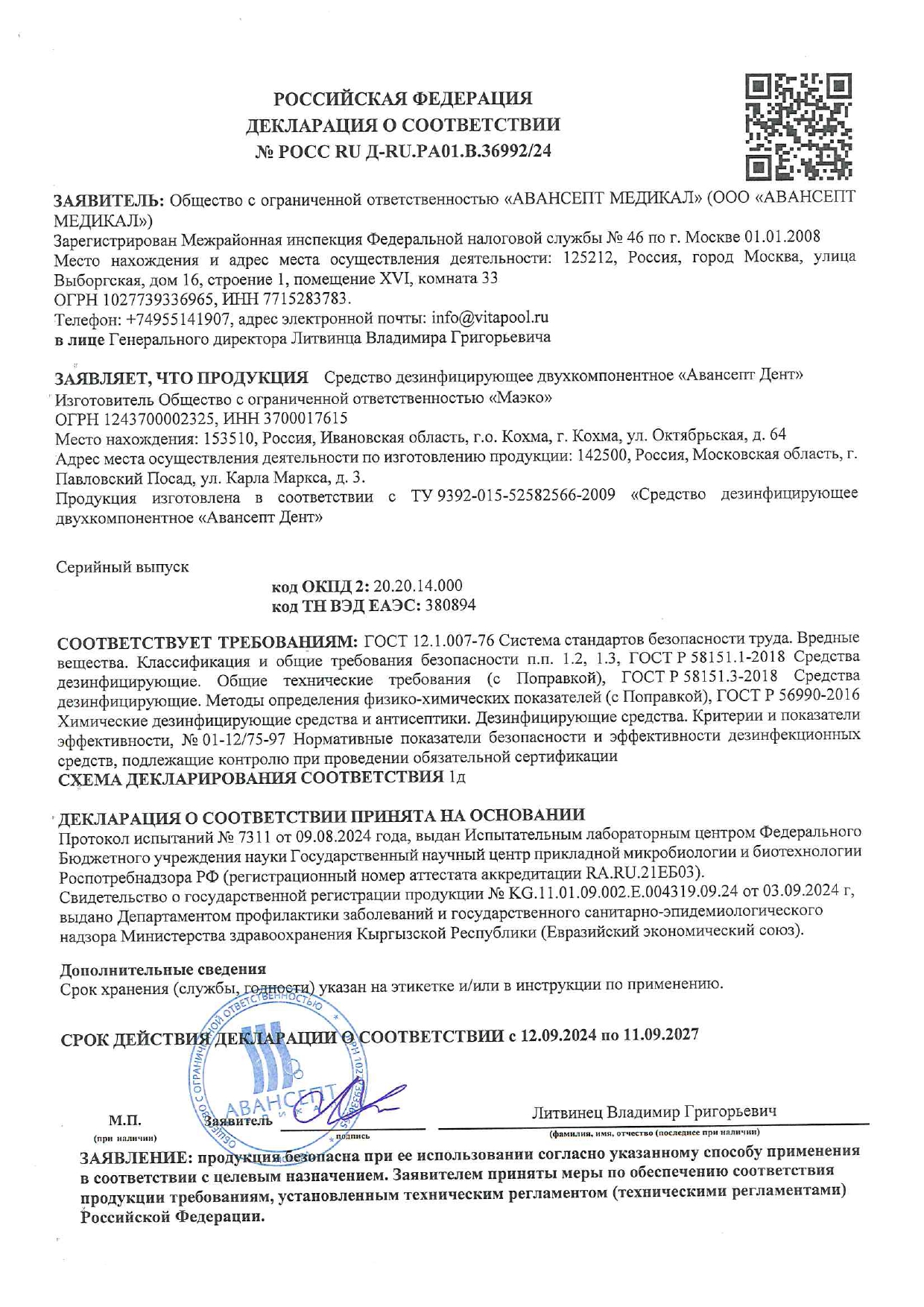 Средство АВАНСЕПТ ДЕНТ обладает антимикробным действием в отношении грамотрицательных и грамположительных бактерий (включая микобактерии туберкулеза), вирусов (возбудителей парентеральных гепатитов и ВИЧ-инфекции), грибов рода Кандида.