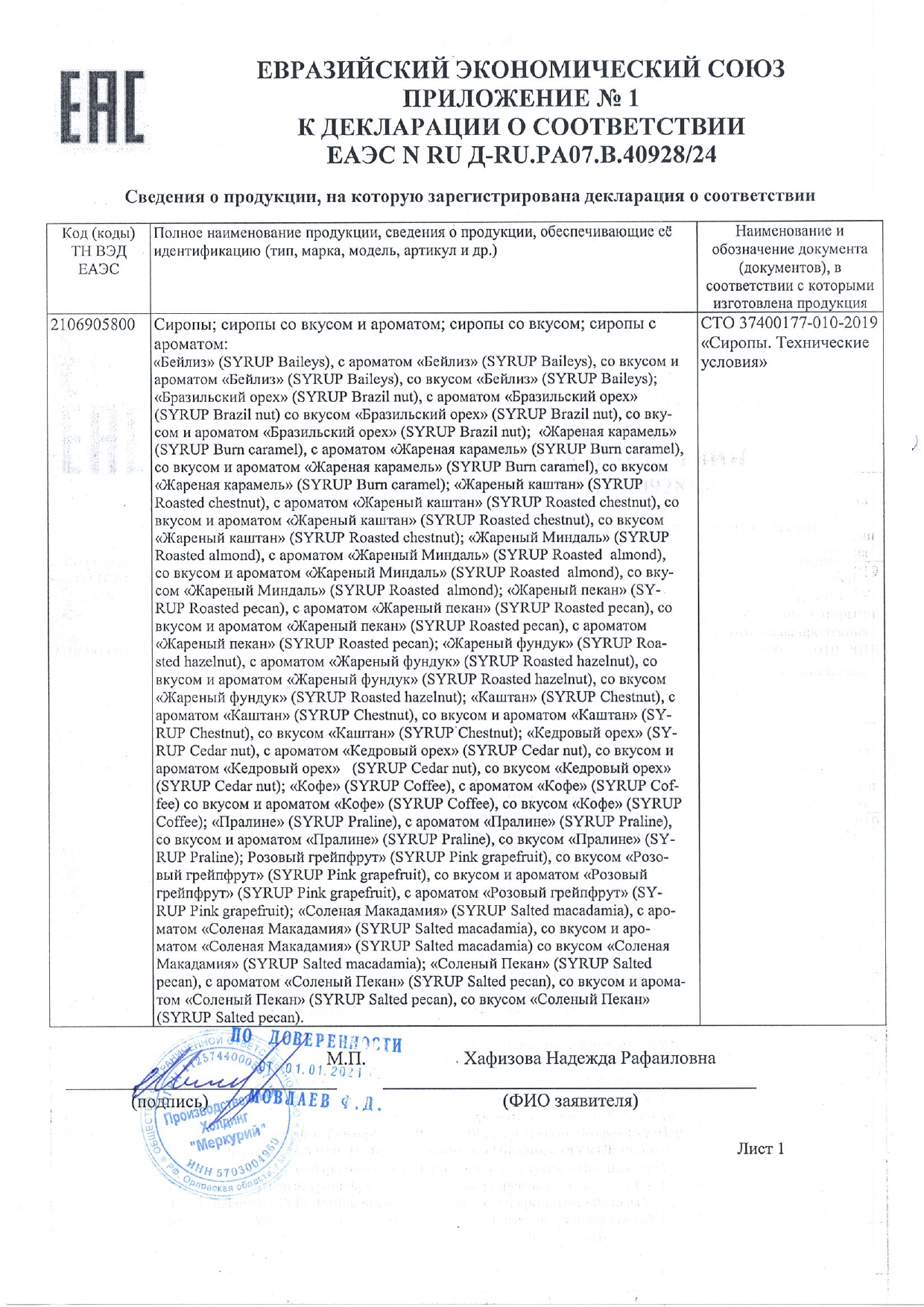 Сироп BARINOFF "Лесной орех", 1 л, стеклянная бутылка Код товара: 622213 506,19 ₽ Купить Производитель:Barinoff Сироп BARINOFF "Лесной орех" - это полностью натуральный продукт с густой консистенцией, который широко применяется в кулинарии как ингредиент блюд и напитков и пропитка для выпечки. Кроме того, некоторые повара используют данный сироп для декорирования тортов, мороженого, пирожных и прочих популярных десертов, которые не только приобретают привлекательный вид, но и становятся вкусными и ароматными. Сироп объемом 1 л изготавливается из сахара, родниковой воды и экстракта лесных орехов, а искусственные пищевые красители и консерванты при его производстве не используется, что свидетельствует об исключительном качестве продукта. "Лесной Орех" обладает красновато-коричневым цветом и вкусоароматическими тонами лесных орехов, переходящими в приятное сладковатое послевкусие. Состав: сахар, сок виноградный концентрированный, колер карамельный, ароматизатор "Лесной орех", сорбат калия, вода питьевая. Пищевая ценность в 100 гр продукта: - углевода - 64 г; - энергетическая ценность - 1088к Дж (256 ккал).Производство: РоссияВид продукта: сиропВкус: Лесной орехОбъем: 1000Упаковка: стеклянная бутылкаСрок годности: 36 мес.Фирма-производитель: БариноффСрок годности: 36 месВес: 1,95 кгРазмер упаковки: 8.6 × 33.2 × 8.3 смОбъём: 0.0027 м3Промежуточная упаковка: 6 штТранспортная упаковка: 6 штШтрих-код: 4612752318928 Файлы Сертификат-1.jpg Сертификат-2.jpg Сертификат-3.jpg Сертификат-4.jpg Сертификат-5.jpg