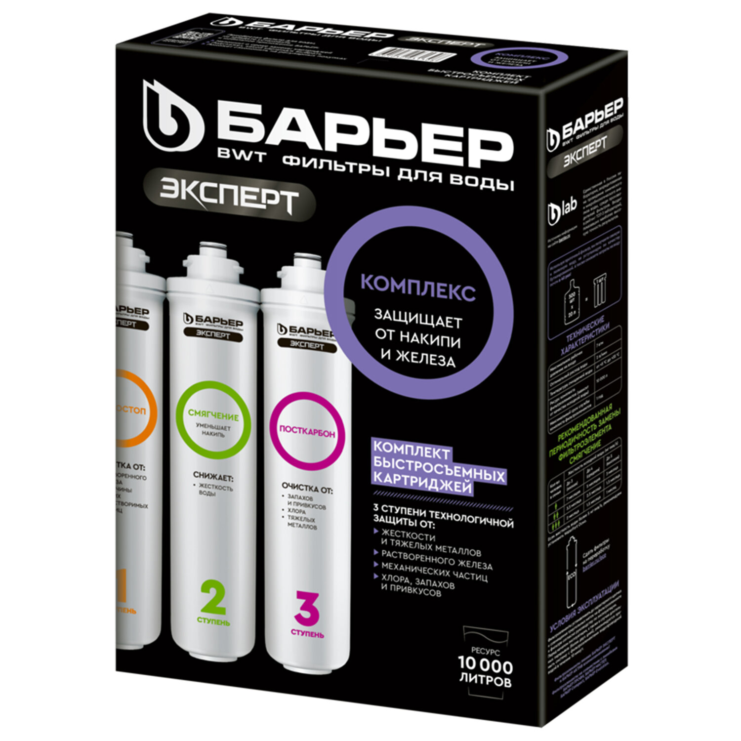 Картриджи сменные БАРЬЕР "ЭКСПЕРТ Комплекс", 3 ступени, ресурс 10000 л, КОМПЛЕКТ 3 шт. Код товара: 702844 3 235,2 ₽ Купить Производитель:БАРЬЕР Комплект сменных картриджей БАРЬЕР "ЭКСПЕРТ Комплекс" – это мощное решение для домов и дач, где вода одновременно жёсткая и насыщена железом: она оставляет белый налёт в чайниках, рыжий осадок на посуде и придаёт напиткам неприятный металлический привкус. Сменные быстросъемные картриджи для проточного фильтра БАРЬЕР "ЭКСПЕРТ". Комплект сменных картриджей БАРЬЕР "ЭКСПЕРТ Комплекс" позволяет забыть о накипи, неприятном металлическом привкусе воды и желтоватом осадке в чайнике. Производительность – 2 л/мин. Ресурс – 10 000 литров. Вода проходит три этапа очистки: 1 ступень – картридж "Ферростоп" для фильтра БАРЬЕР "ЭКСПЕРТ". Содержит специальный многослойный материал, эффективно удаляющий железо как в растворенной, так и нерастворенной форме. Финишный слой препятствует сбросу отфильтрованного железа в чистую воду. 2 ступень – картридж "Смягчение" для фильтра БАРЬЕР "ЭКСПЕРТ". Предотвращает образование накипи: эффективно снижает карбонатную жесткость, из-за которой образуется осадок в чайнике. Рекомендованная частота замены картриджа – не реже 1 раза в 6 месяцев. 3 ступень – картридж "ПостКарбон" для фильтра БАРЬЕР "ЭКСПЕРТ". Осуществляет финишную очистку и кондиционирование, устраняет хлор, тяжелые металлы и неприятные привкусы. Картриджи подходят к фильтрам линеек БАРЬЕР "ЭКСПЕРТ", БАРЬЕР "ЭКСПЕРТ СЛИМ", БАРЬЕР "Актив", БАРЬЕР "ОНИКС". Не требуют для замены специальных ключей, инструментов или навыков. Производитель оставляет за собой право без предварительного уведомления вносить изменения в технические характеристики, комплектацию и конструкцию, не ухудшающие эксплуатационные характеристики изделия.Производство: РоссияТип модуля: картриджСерия: ЭкспертТип воды: жесткий, с повышенным содержанием железаСпециализация: умягчение и очистка водыСредний ресурс кассеты: 10000 лКоличество в комплекте: 3 шт.Производительность: 2 л/минСрок годности: 36 месВес: 2,17 кгРазмер упаковки: 8.1 × 33.8 × 23.3 смОбъём: 0.0074 м3Промежуточная упаковка: 5 штТранспортная упаковка: 5 штШтрих-код: 4601032931308 Файлы Сертификат-1.jpg Сертификат-2.jpg Сертификат-3.jpg Сертификат-4.jpg Сертификат-5.jpg Сертификат-6.jpg