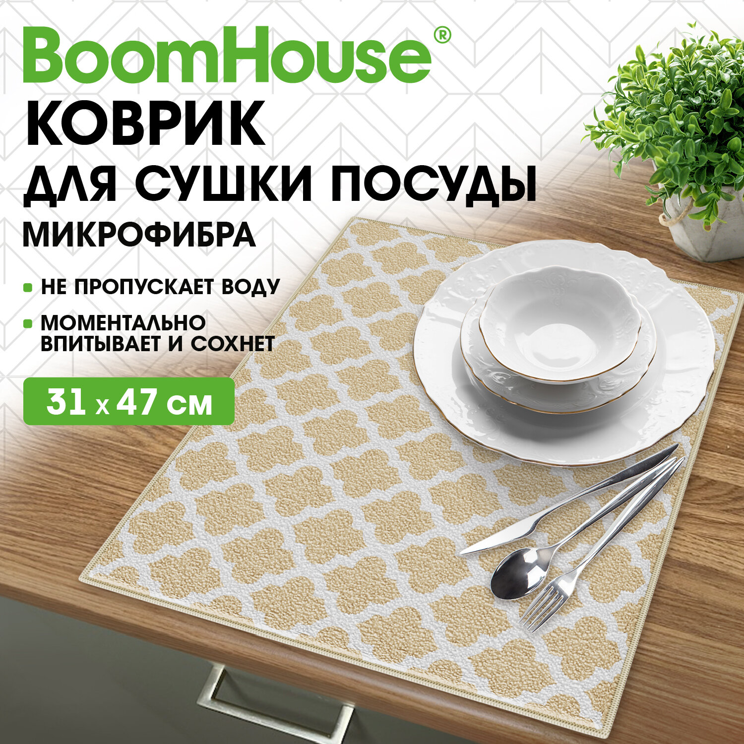 Коврик для сушки посуды из микрофибры, 31х47 см, "МАРОККАНСКИЙ УЗОР", 440 г/м2, BOOMHOUSE (БУМХАУС) Код товара: 701157 144,18 ₽ Купить Производитель:BoomHouse Коврик для сушки посуды BOOMHOUSE из микрофибры эффективно впитывает влагу и быстро сохнет, обеспечивая чистоту и порядок на кухне. Стильный и гигиеничный аксессуар идеально подойдёт для тех, кто заботится о собственном комфорте! Коврик для сушки посуды BOOMHOUSE – это современное гигиеничное решение для быстрой сушки любой посуды. Благодаря микрофибре и наличию внутренней прослойки из поролона, коврик для сушки посуды BOOMHOUSE моментально впитывает всю влагу, гарантируя, что поверхность под ним и вокруг раковины останется идеально сухой, что предотвращает появление луж и размножение бактерий. Коврик быстро сохнет и прост в уходе. Внешние стороны коврика изготовлены из микрофибры с суммарной плотностью 440 г/м2. Края обработаны оверлоком, что гарантирует долговечность и отсутствие распускания даже после многократных стирок. Толщина – 5 мм. Размер коврика (31x47 см) оптимален для размещения на ограниченном пространстве, но при этом позволяет сушить сразу несколько тарелок или крупную кухонную утварь. Форма коврика – прямоугольная. Каждый коврик BOOMHOUSE поставляется в индивидуальном пакете, а также имеет удобный пластиковый крючок для вывешивания на стойку.Производство: КитайТип коврика: ВлаговпитывающийНазначение: Для сушки посудыМатериал: Микрофибра, поролонРазмер: 31х47 смТолщина: 5 ммРисунок: даТип рисунка: Принт "Марокко"Цвет: бежевыйВес: 105 грРазмер упаковки: 1.9 × 32.2 × 17.1 смОбъём: 0.0011 м3Промежуточная упаковка: 48 штТранспортная упаковка: 48 штШтрих-код: 4606224506937 Файлы Сертификат-1.jpg Сертификат-2.jpg