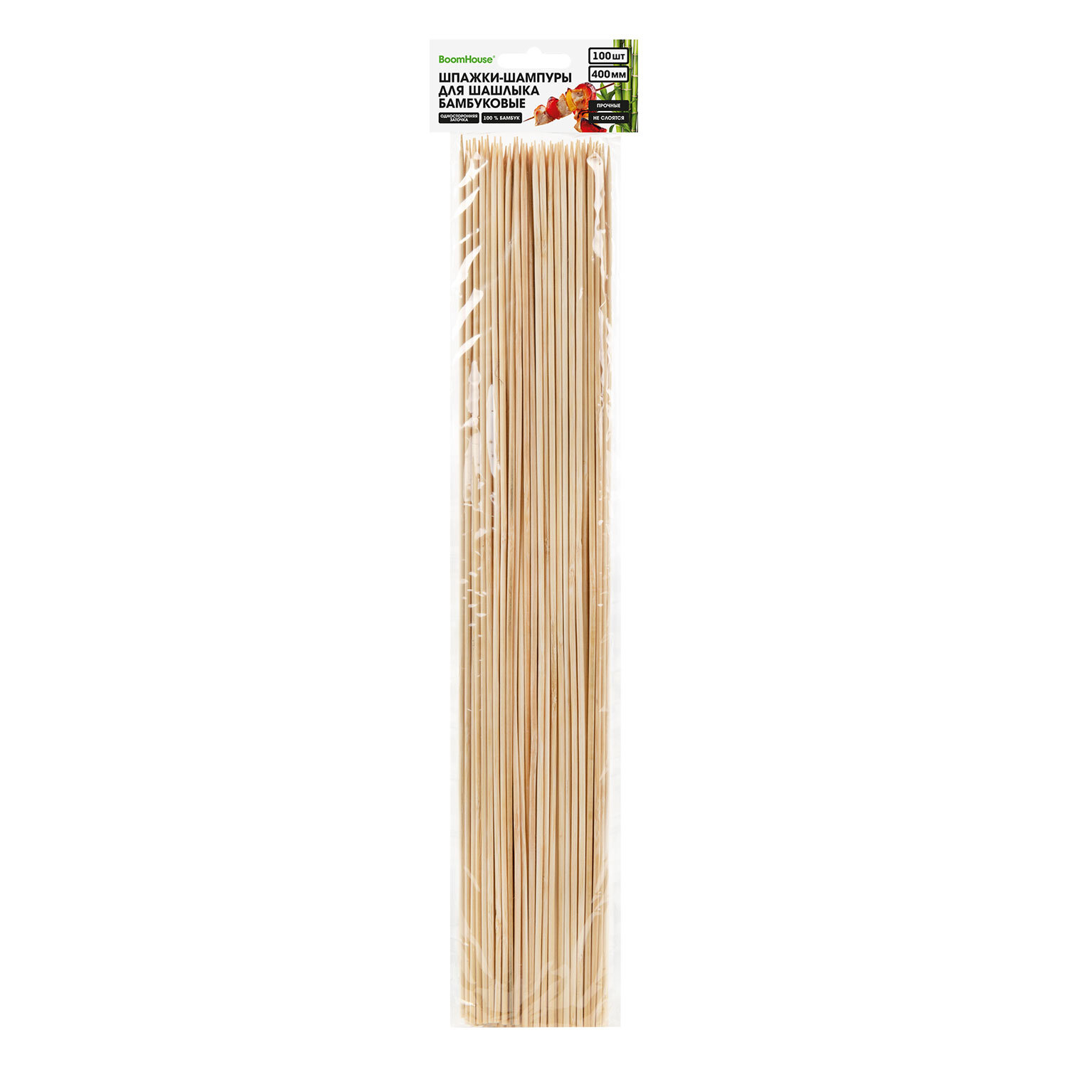 Шпажки-шампуры для шашлыка бамбуковые 400 мм, 100 шт., BOOMHOUSE (БУМХАУС) Код товара: 701961 73,36 ₽ Купить Производитель:BoomHouse Шампуры одноразовые BOOMHOUSE используются в быту и в заведениях общественного питания, предназначены для приготовления мяса, рыбы, овощей. Шампуры изготовлены из бамбука. Безопасны при использовании, так как не выделяют вредных веществ и не меняют вкус продуктов. Шампур представляет собой шпажку с заостренным концом с одной стороны и имеет круглое сечение. Длина - 400мм. В комплекте 100 штук. Упакованы в пакет с европодвесом.Производство: КитайТип товара: шампуры для шашлыкаДлина: 400 ммДиаметр: 3 ммМатериал: бамбукКоличество в упаковке: 100 шт.Вес: 188 грРазмер упаковки: 1.5 × 40.3 × 8.9 смОбъём: 0.0004 м3Промежуточная упаковка: 100 штТранспортная упаковка: 100 штШтрих-код: 4606224518428 Файлы