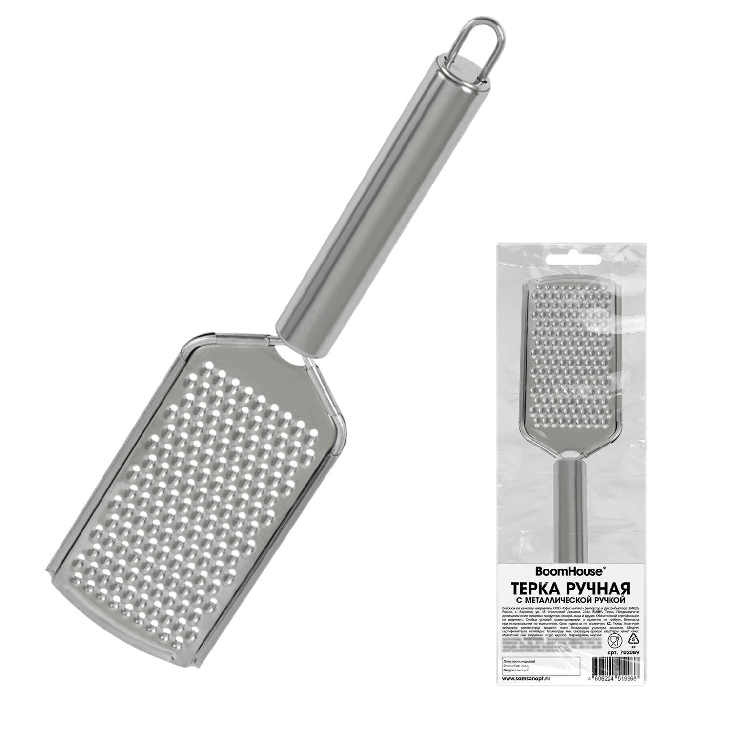 Терка ручная с металлической ручкой, мелкая нарезка, нержавеющая сталь, BOOMHOUSE (БУМХАУС) Код товара: 702089 99 ₽ Купить Производитель:BoomHouse Ручная терка BOOMHOUSE – ваша незаменимая помощница на кухне. Благодаря острым лезвиям, прочной конструкции, компактному размеру и удобной ручке она легко справится с любыми продуктами и сделает приготовление блюд максимально простым и комфортным. Терки и овощерезки находятся в прямом контакте с пищевыми продуктами, поэтому важную роль играет материал, из которого сделан инструмент. Терка BOOMHOUSE изготовлена из качественного материала, который соответствует всем требованиям безопасности – это мартенситная нержавеющая сталь SUS410, отличающаяся высокой коррозионной стойкостью, прочностью и устойчивостью к окислению. Мелкая терка отличается от стандартных терок уменьшенным размером отверстий (2 мм), что позволяет измельчать продукты в 2–3 раза мельче. Является универсальным решением для работы абсолютно с любыми продуктами. Часто используется при создании салатов, закусок или кондитерских изделий, идеальна для измельчения сыра, чеснока, цедры, шоколада, орехов и овощей. Все лезвия превосходно заточены, что обеспечивает качественное и быстрое измельчение продуктов. Терку удобно держать использовать и хранить благодарю оптимальному размеру – 24х6х2 см. А легкий вес изделия (50 г) позволит вам не уставать при долгом использовании. Рекомендации по использованию: 1) Сразу после каждого использования терку следует очистить, тщательно вымыть и высушить. 2) При засорении отверстий не рекомендуется использовать абразивные средства или металлические скребки – можно воспользоваться щеткой, которой удобно очистить все поверхности. 3) Храните терку в сухом месте, вдали от агрессивных химикатов, которые могут вызвать коррозию, и металлических приборов, подверженных коррозии.Производство: КитайТип товара: терка ручнаяНазначение: универсальнаяКоличество типов лезвий: 1Тип лезвий: мелкиеМатериал граней: Нержавеющая стальМатериал ручки: Нержавеющая стальЦвет ручки: стальнойВысота: 24 смШирина: 6 смГлубина: 2 смУпаковка: пакет с европодвесомВес: 54 грРазмер упаковки: 1.9 × 24 × 5.8 смОбъём: 0.0001 м3Промежуточная упаковка: 200 штТранспортная упаковка: 200 штШтрих-код: 4606224519968 Файлы