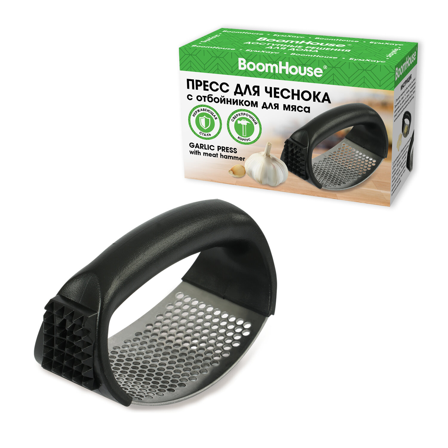 Пресс для чеснока с отбойником для мяса, нержавеющая сталь, черный, BOOMHOUSE (БУМХАУС) Код товара: 702094 100,17 ₽ Купить Производитель:BoomHouse Пресс для чеснока с отбойником для мяса BOOMHOUSE – ваш незаменимый помощник на кухне. Благодаря прочной конструкции и компактному размеру он легко справится с любым чесноком и сделает приготовление блюд максимально простым и комфортным. Пресс для чеснока BOOMHOUSE изготовлен из качественных материалов, который соответствует всем требованиям безопасности – это прочный пищевой пластик и мартенситная нержавеющая сталь SUS410, отличающаяся высокой коррозионной стойкостью, прочностью и устойчивостью к окислению. Пресс для чеснока – это ручной кухонный прибор, предназначенный для измельчения зубчиков чеснока путём продавливания их через толстую сетку с мелкими отверстиями. Устройство оснащено специальными зубчиками для отбивания мяса. Пресс для чеснока удобно держать, использовать и хранить благодаря эргономичной ручке и оптимальному размеру – 11х5х7 см. А легкий вес изделия (75 г) позволит вам не уставать при долгом использовании. Рекомендации по использованию: 1) Сразу после каждого использования пресс для чеснока следует очистить, тщательно вымыть и высушить. 2) При засорении отверстий не рекомендуется использовать абразивные средства или металлические скребки – можно воспользоваться щеткой, которой удобно очистить все поверхности. 3) Храните пресс в сухом месте, вдали от агрессивных химикатов, которые могут вызвать коррозию, и металлических приборов, подверженных коррозии.Производство: КитайТип товара: пресс для чеснокаМатериал: нержавеющая сталь, пластикЦвет: черныйВысота: 7 смШирина: 11 смГлубина: 5 смУпаковка: картонная коробкаВес: 102 грРазмер упаковки: 5.5 × 11.4 × 6.9 смОбъём: 0.0005 м3Промежуточная упаковка: 200 штТранспортная упаковка: 200 штШтрих-код: 4606224520018 Файлы
